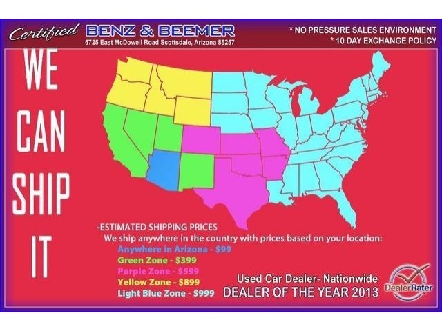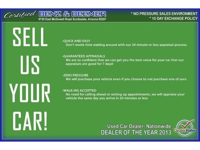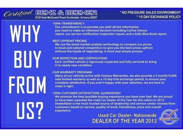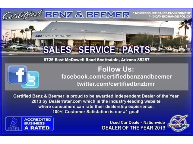 Clean CarFax report! Certified Benz & Beemer will strive to provide you, our valued customer, with the following: The highest quality preowned vehicles that represent the best value anywhere. A friendly and comfortable shopping experience with zero pressure. A totally transparent process providing you with our best upfront pricing, a CarFax history report, our service inspection report, a Kelly Blue Book report, and a market analysis report. A 3 month/3000 mile warranty on certified vehicles and a 10 day trial exchange policy for your peace of mind. We promise the best possible buying experience you have ever had. We are proud to have been presented the Used Car Dealer of the Year for Arizona in 2012 and the Used Car Dealer of the Year for the Nation in 2013, awarded by DealerRater.com for superior customer satisfaction. DealerRater is the most trusted source of automobile dealership and service center reviews. Car dealers are rated on the criteria of customer service, quality of work, friendliness, price and overall experience.