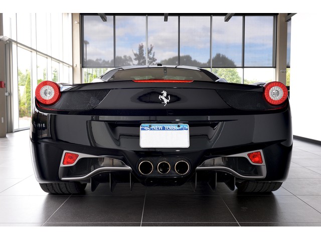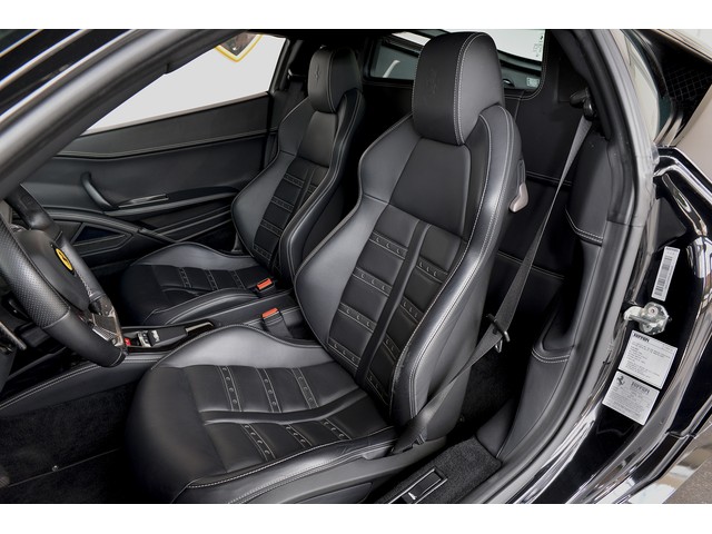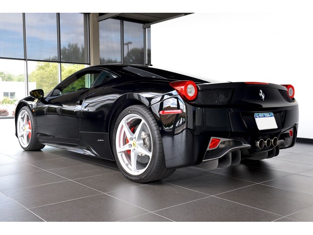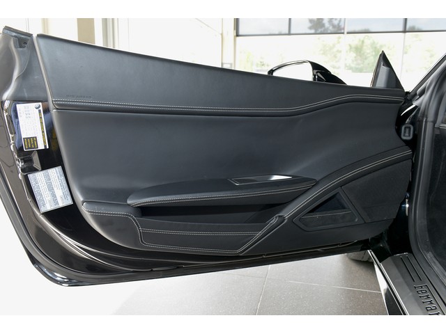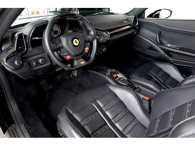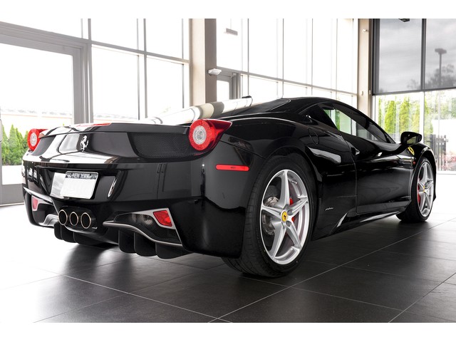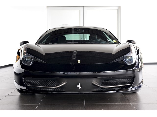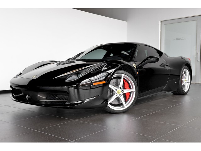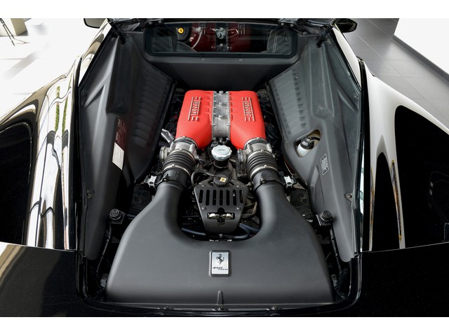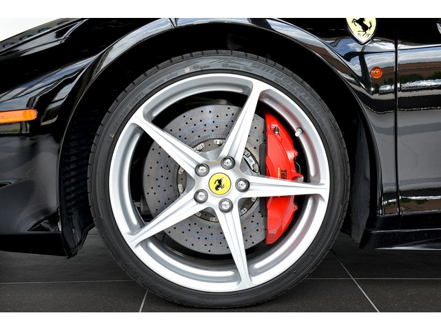 2010 Ferrari 458 Italia in Nero with Nero hide interior and Carbon Fiber Trim. Additional features include Contrast Stitching in Grigio Chiaro (Light Grey), Carbon Fiber Driver Zone with LED Steering Wheel, Carbon Fiber Central Bridge, Carbon Fiber Dashboard Inserts, Daytona Style Seats, Electrically Operated Seats, iPod Connection, Scuderia Ferrari Fender Shields, Advanced Frontlight System, Alcantara Headliner in Nero, Interior & Exterior Exectrochromic Mirrors, Radio Navigation System with Bluetooth, White Rev Counter, Leather Upholstered Rear Shelf in Nero, Red Brake Calipers and 20" Forged Painted Wheels.