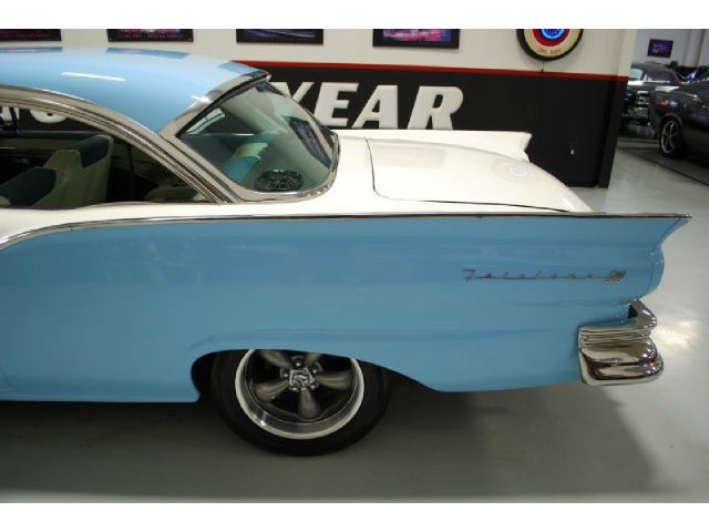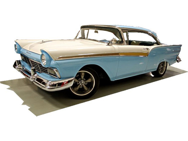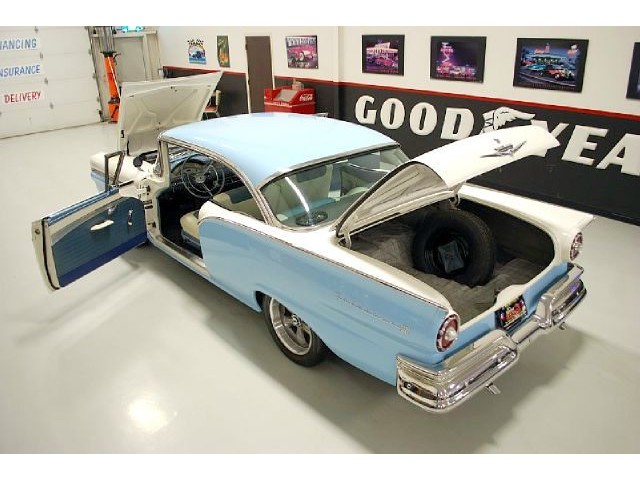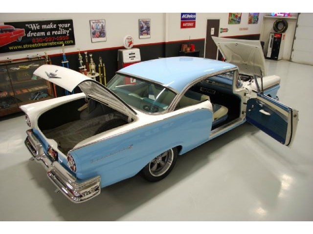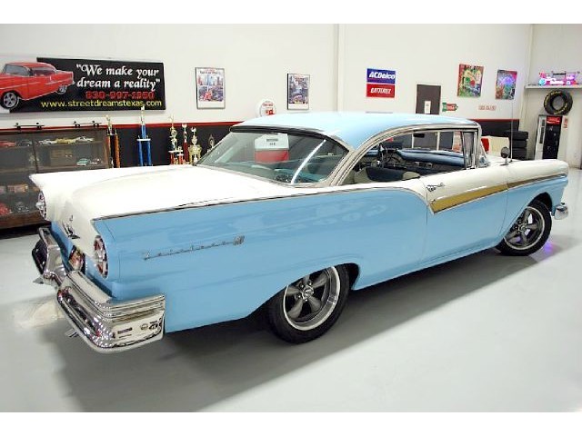 Welcome to streetdreamstexas online auction. We are celebrating our 15th year in the classic and collectible car business. Through all the economies ups and downs it seems that vintage cars and trucks are the best and most fun place to have your money stored. Every once in a while we get a great 57 Ford Fairlane 500. Ninety nine percent of the time they are convertibles in original condition. This is a tastefully lightly modified 2 dr Hardtop that has some very nice upgrades but not over the top. It retains a stock body with no trim or chrome deleted and no major body modifications. Though not a high dollar show finish the body and paint show very well especially with the classic two tone treatment. All of the glass and trim are very nice. There is some distortion on the rear bumper but not really enough to mess with. The nice looking bench seat interior continues the two tone treatment with a combination of vinyl and cloth. I has seat belts, a stock steering wheel, good carpet, door panels, and headliner. The dash is uncut. The original Y block motor was replaced with a later model 302 V-8 with a two barrel carburetor, custom dress up kit, and dual exhaust. It fires right up and runs smooth and strong. The motor compartment is nicely detailed and shows well. The shiny compressor is for the brand new Vintage AC system that was just installed. It blows cold R-134 air. Nice! The chassis is clean and shows very well also with smooth pans, painted hardware, gas shocks, and rides on Coy C-5 17 inch wheels with Gun Metal finish. They look totally retro but feature modern hoops. The larger diameter wheels with radial tires sure makes this ole fifties Ford ride and handle much better. The power steering and disc brakes help also. The trunk is finished with a stock mat and full size spare. If you like a 57 Ford Hardtop but want some subtle upgrades this is the car for you. Hey, Chevy was not the only car built in 57! Make it yours today with low rate, long term financing, cheap collector car insurance, and professional delivery.