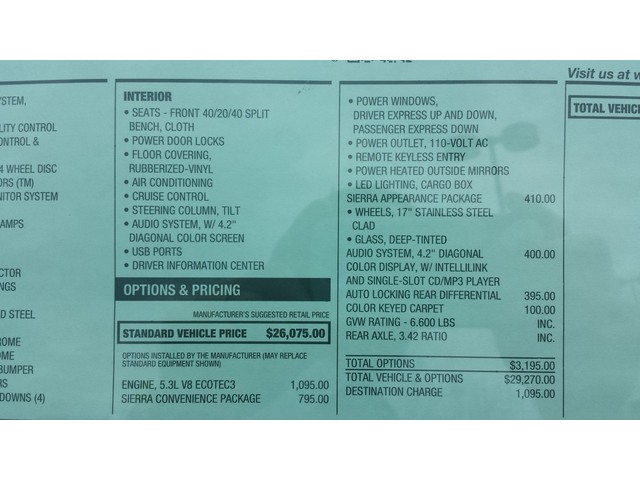 SIERRA CONVENIENCE PACKAGE includes (DL8) outside heated power-adjustable mirrors, (AQQ) Remote Keyless Entry, (KI4) 110-volt AC power outlet and (UF2) LED cargo box lighting (Includes (A31) power windows on regular cab.) (PDD)
