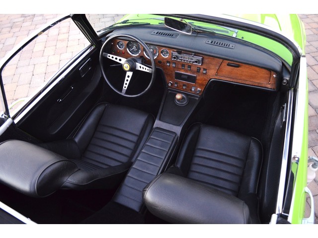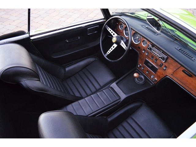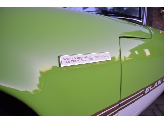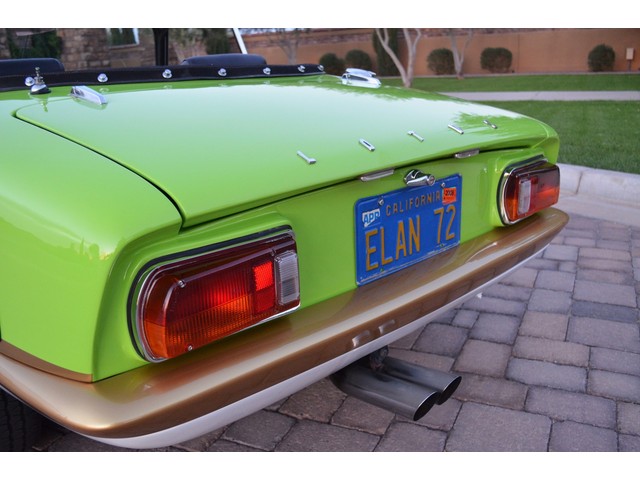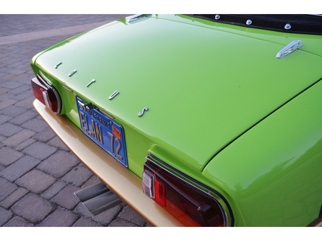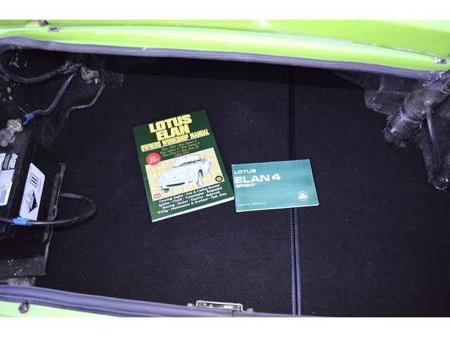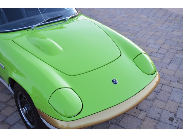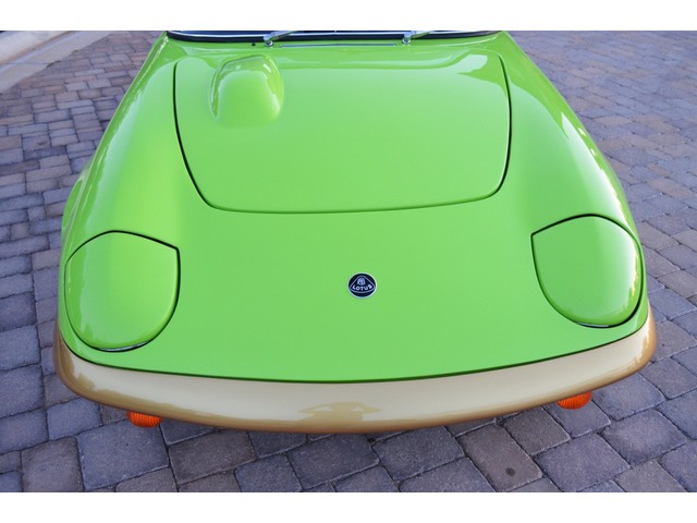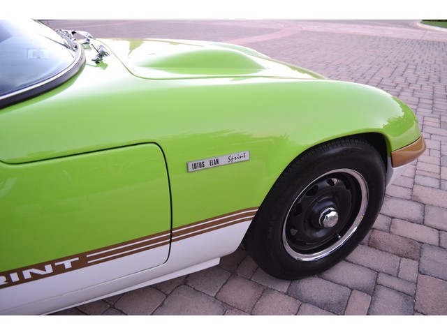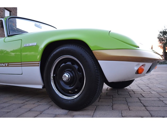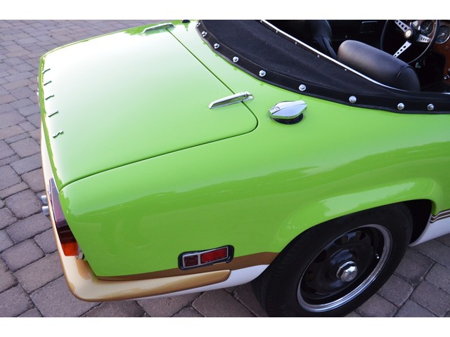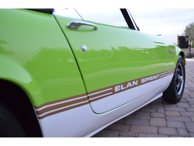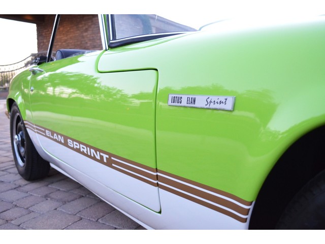 European Motor Studio is very proud to offer this gorgeous Pistachio Green /White with Gold Leaf trim 1972 Lotus Elan Sprint Roadster. This Elan Sprint left the Lotus Hethel production line in November of 1971 and was invoiced to the US. The car is a blue plate CA car is believed to have been in Southern CA its entire life. The body was just stripped down and repainted in its original colors of Pistachio Green with white and gold leaf trim. The interior has been completely redone in original black vinyl along with the wood dash, vinyl dash top and all of the carpets and doors. The correct factory Robbin Egg top is brand new and fits on the car properly. The car has just been completely sorted with a full service including numerous belts, hoses and seals. The top half of the engine was recently rebuilt and the carbs were just rebuilt using correct Lotus rebuild kits from JAE. All of the electrical in the car has been sorted and everything appears to be functioning and operating as it should. Both power windows go up and down, all the turn signals are operating, the brake lights, taillights, headlights, interior dash lights, reverse lights and the three lights to the right of the steering wheel are all functioning as designed. Both driver and passenger windows each have a small scratch on them from the windows going up and down. The vacuum headlights raise and lower with ease by the touch of the switch. The car does not run hot and the cooling fans quick in as designed. The car starts right up and runs and idles like it should. The Elan does not smoke or burn any oil and the car accelerates through all of the gears like it should. The engine feels incredibly strong and pulls through all RPM range. The clutch feels very solid and free from any slipping or grinding in the gears. The brake master cylinder and booster has just been rebuilt and the brakes have a good positive feel to them with no signs of fade. The suspension is very tight and free from any noises. The steering is very responsive and free from any wondering or vibrations. The undercarriage of the car is spotless. There is no sign of rust anywhere underneath the car. The chassis is very clean and tidy and has been nicely detailed. This Elan comes with an owners handbooks and shop manual, the original knock off wheel tool and the original jack and spare tire.