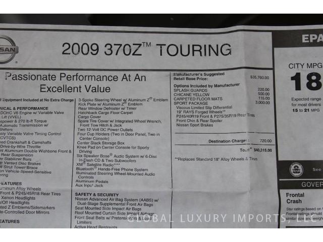 2009 NISSAN 370Z TOURING Auto With Sport Package / TOURING PACKAGECUSTOM UPGRADESINVIDIA CAT BACK EXHAUSTK&N TYPHOON DUAL AIR INTAKE SYSTEMCOMPUTER TUNED **350HP TO THE TIRE**OPTIONS:TOURING PACKAGESPORT PACKAGECHICANE YELLOW PEARL19INHC WHEELSFRONT CHIN & REAR SPOILERNISSAN SPORT BRAKESXENON HEADLIGHTSAUTOMATIC TRANSMISSIONHEATED SEATSIN-DASH CDBOSE SOUND SYSTEMBOOK & 2-MASTER KEYSCLEAN CARFAX !! 1-OWNER VEHICLE!!DIGITAL INFORMATION CENTERAIR CONDITIONINGSECURITY SYSTEMPOWER LOCKS.POWER WINDOWS.POWER MIRRORS Financing available with competitive ratesNationwide shippingWorldwide shippingTransportation to dealer, availableCar Fax report available (Click on Car Fax icon to view the Car Fax report)Customer Satisfaction guaranteedIt is our goal to provide the most competitive pricing on the market in order to earn your business. We at Global Luxury Imports Strive to make sure the vehicle will exceed your expectations. We want to make the purchase hassle free and as simple as possible. Applicable fees are; $166.27 Illinois Documentation fee, $10.00 for Thirty days drives away permit fee for out of state customers, Illinois Customers will pay $95.00 Title fee and $99.00 for Illinois Plates, Sales tax (for Illinois residents and residents of tax reciprocal states with the state of Illinois). Please call or email to see if your state is reciprocal with IL. Out of state buyers are responsible for all state, county, city taxes and fees, as well as title/registration fees in the state that the vehicle will be registered. Global Luxury Imports LLC prides itself in accuracy in our description and pricing, on occasions, mistakes can happen. All descriptions, options, specifications are believed to be correct but from time to time there may be a mistake in advertising. Please verify all descriptions and pricing with your sales representative. If any mistake is made Global Luxury Imports LLC is not responsible for errors made. Global Luxury Imports LLC also reserves the right to withdraw and terminate any vehicle listed for sale. Thank you