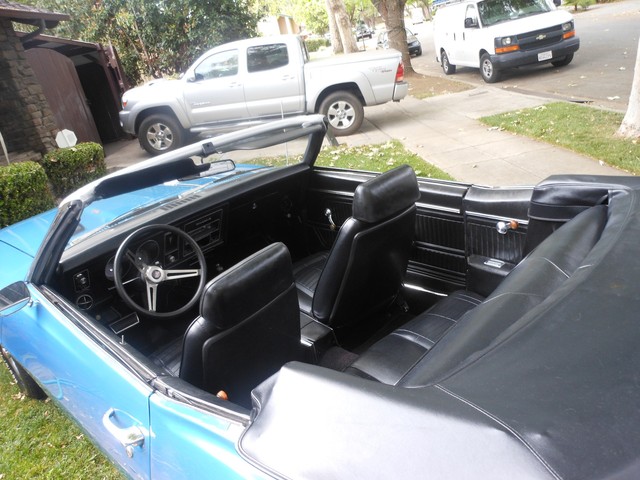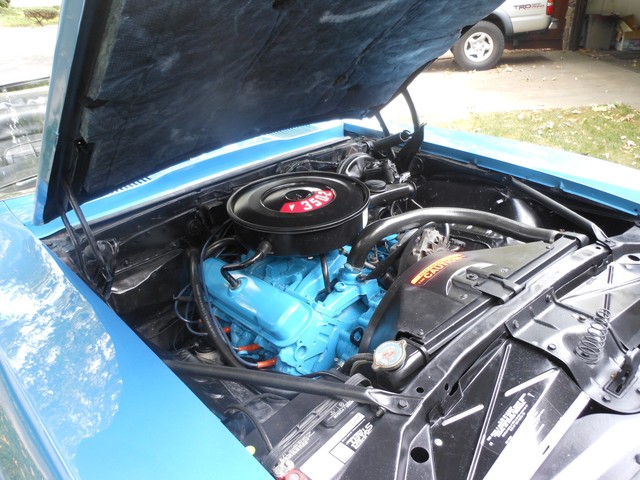 The engine was replaced by the original owner just before he transferred ownership to his brother, back in the 70’s. A rebuild 350 C.I. was installed. The transmission is a turbo 350, and it was rebuilt at that time as well. Both of them have very little miles. This car shifts very well through each of the three gears. It is very smooth and without any hesitation. It has plenty of power and really climbs the hill to my house easily. The Ignition was changed over to electronic and starts very easily. I have the original ignition as well, and you will need that to make the hood tach operable (it runs off the points). The rear end is a 10-bolt, non-posi unit, with what appears to be an original gear set-up. Fuel is fed to the intake manifold through a new, but original style 2-barrel carburetor. The car drives fantastic, watch the video (below) to hear and see it. Original Manifolds, with a redone exhaust really help the car sound like a classic muscle car, not too loud, but very appealing. I love the sound of the car, so I never minded the missing radio. When you give her some throttle, she really purrs.