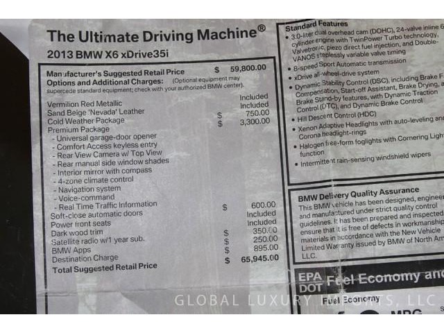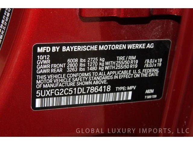 2-stage unlocking: remote ABS: 4-wheel Active head restraints: dual front Air filtration: active charcoal Ambient lighting Antenna Type: diversity Anti-theft system: alarm Audio security system Auxiliary audio input: Bluetooth Auxiliary audio input: MP3 Auxiliary audio input: USB Auxiliary audio input: iPod Auxiliary audio input: jack Body side reinforcements: side impact door beams Brake drying Braking assist Braking assist: hill descent control Bumper color: body-color Cargo area light Cargo cover: retractable Cargo tie downs Center console trim: alloy Center console: front console with armrest and storage Child safety locks Child seat anchors: LATCH system Clock Cruise control Crumple zones: front Cupholders: front and rear Dash trim: alloy Daytime running lights Digital odometer Door handle color: body-color Door trim: alloy Driver Information System Driver seat power adjustments: 10 Driver seat power adjustments: lumbar Driver seat: heated Driver seat: height adjustable Electronic brakeforce distribution Emergency braking preparation Exhaust tip color: chrome Exhaust: dual exhaust tips Exterior mirrors: auto-dimming Exterior mirrors: heated Exterior mirrors: power Exterior mirrors: power folding Exterior mirrors: reverse gear tilt External temperature display Floor Mat Material: carpet Floor Material: carpet Floor Mats: front and rear Front Shock Type: gas shock absorbers Front Spring Type: coil springs Front Suspension Classification: independent Front Suspension Type: double wishbones Front air conditioning zones: dual Front air conditioning: automatic climate control Front airbags: dual Front brakes: ventilated disc Front bumper color: body-color Front fog lights Front headrests: 2 Front headrests: adjustable Front headrests: height adjustable Front seat type: bucket Front seatbelts: 3-point Front wipers: intermittent Front wipers: rain sensing Front wipers: speed sensitive Fuel economy display: MPG Glove compartment: light Grille color: black with chrome accents Hands-free communication system Headlights: Auto on/off Headlights: Xenon Headlights: adaptive Headlights: auto delay off Headlights: cornering Headlights: dusk sensing Headlights: self-leveling Heated windshield washer jets Heated: front seats Impact sensor: alert system Impact sensor: battery disconnect Impact sensor: door unlock Impact sensor: fuel cut-off Impact sensor: post-collision safety system In-Dash CD: single disc Includes audio system Includes climate control Includes driver seat Includes exterior mirrors Includes steering wheel Keyless ignition: push-button start | Liftgate window: fixed Lockout button MP3 player: CD MP3 Playback Mirror color: body-color Moonroof: one-touch open/close Moonroof: power glass Moonroof: remote operation Moonroof: sliding sunshade Moonroof: tilt Moonroof: with wind deflector Multi-function display Multi-function remote: Intelligent Key Multi-function remote: keyless entry Multi-function remote: trunk release Multi-functional information center Number of drivers: 2 One-touch windows: 4 Parking sensors: front and rear Passenger airbag deactivation: occupant sensing deactivation Passenger seat power adjustments: 10 Passenger seat power adjustments: lumbar Passenger seat: heated Passenger seat: height adjustable Phone wireless data link: Bluetooth Power Power door locks: remote Power outlet(s): 12V Power outlet(s): 12V cargo area Power outlet(s): 12V front Power steering: variable power-assisted steering Power windows: remote operation Radio Data System Radio: AM/FM Radio: HD radio Reading lights: front and rear Rear Shock Type: gas shock absorbers Rear Spring Type: coil springs Rear Suspension Classification: independent Rear Suspension Type: multi-link Rear audio: separate rear audio Rear brakes: ventilated disc Rear bumper color: body-color Rear defogger Rear door type: power liftgate Rear headrests: 2 Rear headrests: fixed Rear seat center armrest: folding with storage Rear seat heat: vents Rear seat type: 60-40 split bench Rear seat type: bucket Rear seat: split folding Regenerative Braking System Remote trunk release Retained accessory power Roll Stability Control Run flat tires Satellite Radio: ready Satellite communications: BMW Assist Seatbelt force limiters: front Seatbelt pretensioners: front Second row seatbelts: 3-point Shift knob trim: alloy Side airbags: front Side curtain airbags: front and rear Side-curtain airbag rollover sensor Speed Sensitive Volume Control Stability control: electronic Stabilizer bar(s): front Stabilizer bar(s): front and rear Stabilizer bar(s): rear Steering wheel mounted controls: audio and cruise controls Steering wheel mounted controls: paddle shifter Steering wheel trim: leather Steering wheel: power tilt and telescopic Storage: cargo tie-down anchors and hooks Storage: front seatback Subwoofer: 2 Tachometer Tail and brake lights: LED Taillights: adaptive Tire Pressure Monitoring System Tire type: all season Total Number of Speakers: 10 Traction control Trailer wiring Trip computer Trip odometer Upholstery: leather Vanity mirrors: dual illuminating Warnings and reminders: lamp failure Wheel type: alloy coolant engine oil leather and wood low fuel |