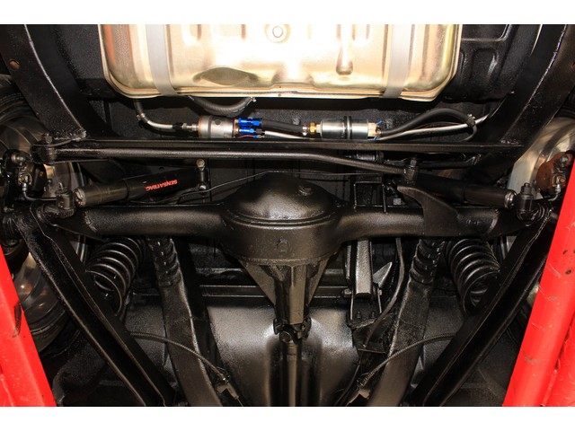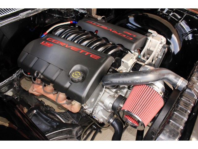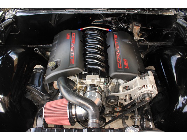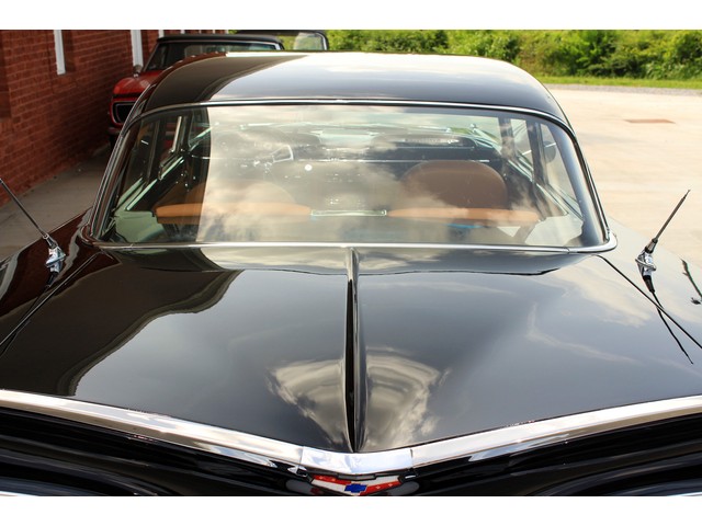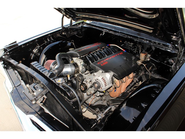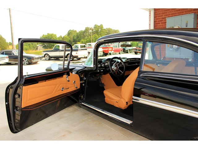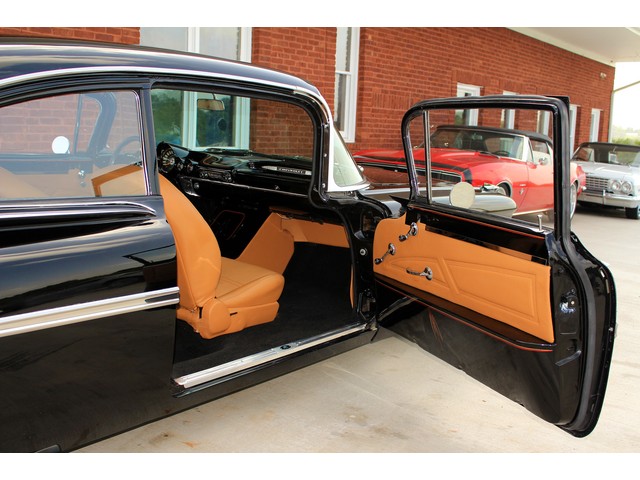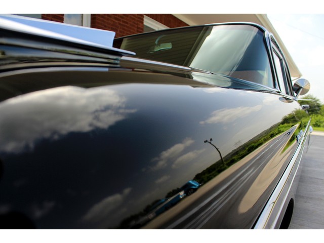 We will start off with the exterior of the Bel Air. When you look down the sides of this beauty the lines are great and it’s straight as an arrow. Everything is covered in the all Black scheme that is slick with a deep rich shine and shows very well. All the stainless looks clean and straight, and all the glass was removed at the time of the resto then reinstalled with new seals. Also, all the weather stripping was replaced. The chrome looks good with new bumpers. The final exterior touch is the set of 20” American Wheels and New tires on the corners.