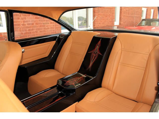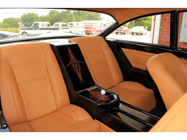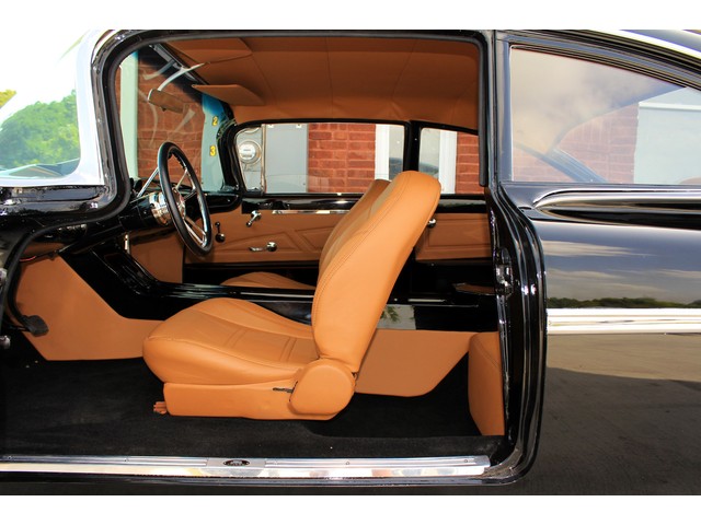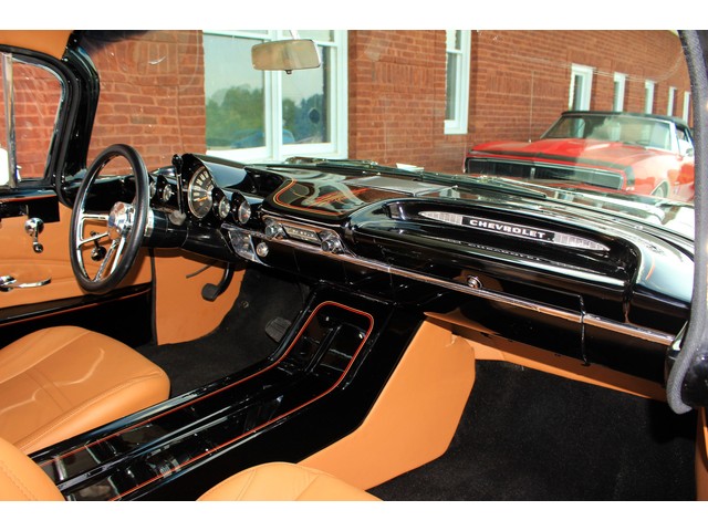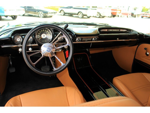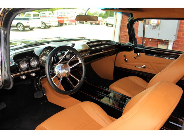 Next, we will take a look at the interior of the ’59. Everything on the inside is a custom job that complements the exterior perfectly. It’s done in tan leather with black trim and a custom console that runs front to back. The seats are all buckets that are covered in Tan Leather that match the door panels that are done with the same tan leather inserts. When you look at the dash it looks stock with all the correct gauges and radio. It’s done in black to match the custom console and black carpet.