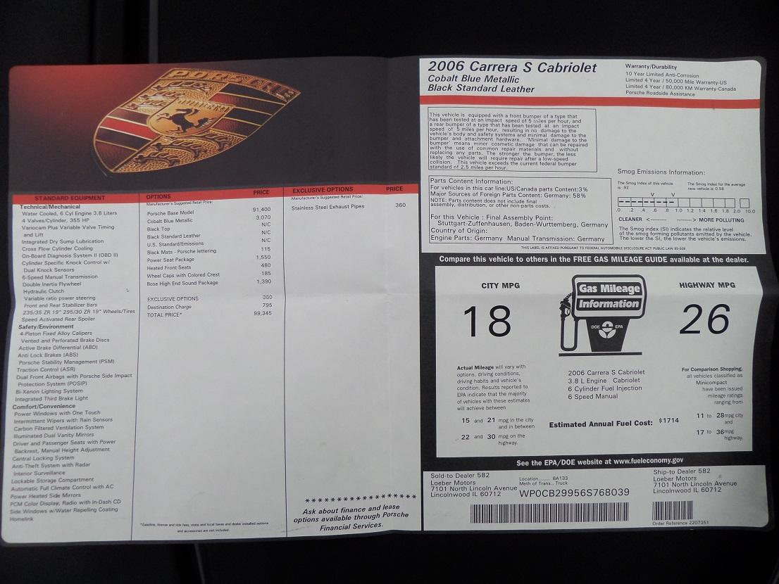 Description2006 Porsche 911 Carrera S Cabriolet in Cobalt Blue Metallic with the 3.8L V6 engine, a 6-Speed Manual Transmission, Navigation, and only 29K original Low Miles! This is my personal vehicle that I have owned for the last 4 years. I purchased it with 18K miles on it and I drove it on average only 2500 miles a year which consisted of clear summer days. I had it professionaly winterized and stored every winter. The 2-Owner Carfax is clean and clear and is free of any accident reports or history. I routinely matintained and babied this vehicle. One would be hard pressed to even find a scratch on it. I had a high-impact clear bra installed on the front bumper, lower bumper, and both side mirrors. The clear bra has protected the vehicle from the possibility of rock chips from highway driving. Because of this, you won't even find a nick on the edge of the hood! The 3.8L V6 engine is rated at 355 H.P. and runs like a top. The 6-Speed Manual transmission shifts with ease through all 6 gears, including reverse. The convertible top is in as close to new condition as you can get, and of course it is free of any rips, tears, or any fading what so ever. The car is completely stock as it was originally, with the exception of the 19" Porsche Turbo wheels, which are also in like new condition without any curb rash, pitting, or damage what so ever. Pirrelli tires were put on less than 1000 miles ago. Comes with factory front and rear parking aid sensors. The Bose High End Stereo system with in-dash CD & Navigation sounds nice and crisp. Every single option works properly including the PASM suspension, fuctioning rear spoiler, and PSM Traction Control System. Bo-Xenon headlamps with factory fog lamps. Power and Heated both driver and passenger seats. In the front trunk you can see a black bag-which has the factory Porsche jack and tools. I have both key fobs which work and I even kept the original window sticker which will be included with the vehicle. THE SHIFT KNOB HAS A REFLECTION IN THE PICTURES, THIS SHIFT KNOB IS THE FACTORY PORSCHE ORIGINAL AND IS IN LIKE NEW CONDITION WITH ALL OF THE GEAR NUMBERS LISTED ON THE TOP HANDLE. We require a $250 paypal deposit to confirm the auction. We are more than happy to help arrange shipping and can provide a competitive shipping quote (door to door, fully insured) anywhere within the Continental U.S. If you are planning on flying in to take delivery, we will gladly provide complimentary transportation from O'Hare airport or Union Station (by train) which are both only 15 miles away. Thanks for looking and please feel free to call me on my cell if I can answer any questions or if you are ready to take the next step on this Porsche! Mark 847-404-5148 (cell)