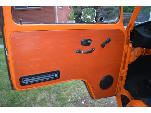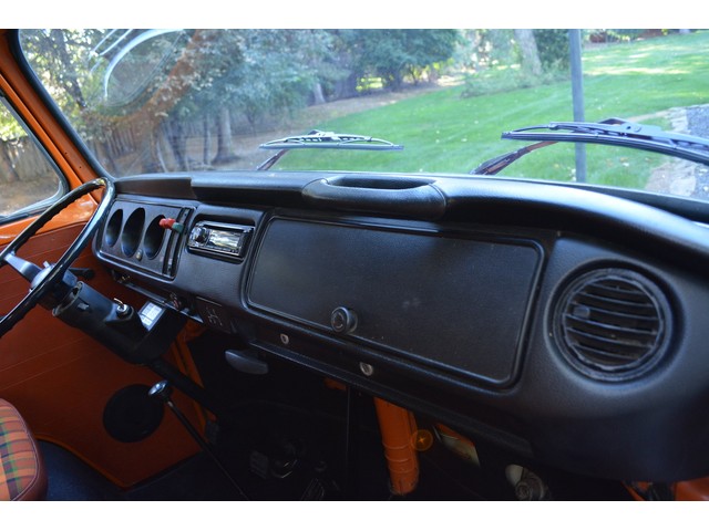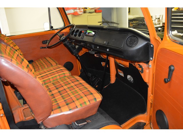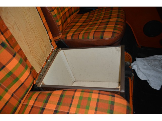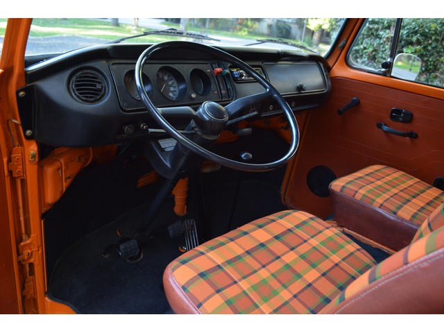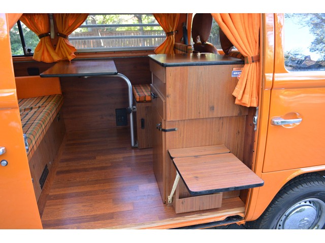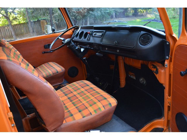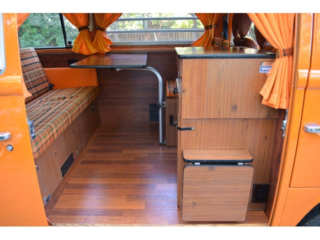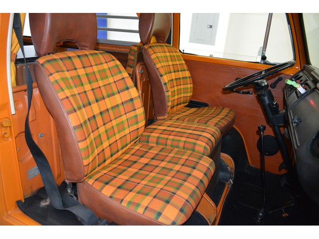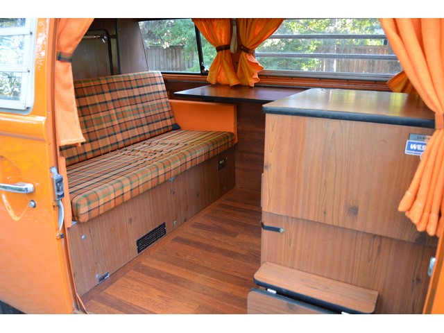 This Volkswagen Westy Campmobile has a strong 1.8 Liter type 4 air-cooled - four cylinder motor in it and it is running well! The engine is backed by a smooth four speed transmission / transaxle. The ORIGINAL interior is in NICE restored condition including NICE ORIGINAL re-covered Orange plaid bucket seats up front, NICE ORIGINAL Black dash, NICE ORIGINAL Style Black carpet up front, NICE ORIGINAL White wood headliner, NICE ORIGINAL door panels, NICE ORIGINAL gauge cluster, NICE custom matching Orange plaid center padded armrest and console with inside storage. NICE ORIGINAL steering wheel. The ORIGINAL rear / Camper part of the interior is also in GREAT condition including a NICE ORIGINAL fold out bed, NICE ORIGINAL table, VERY NICE Original Orange plaid rear seat / bed, NICE ORIGINAL Orange plaid upper bed in Pop-top, lots of factory storage areas and closets, and where the sink was removed it is now a seat with storage below, wing style side windows and louvered side windows for ventilation, NICE wall and roof paneling and nice sliding cloth curtains throughout. Check out the Hardwood floor area shown in several pictures below, Beautiful and more practical than the original carpet!! This Classic VW is nicely equipped including an awesome Alpine Digital AM FM stereo radio / CD player / MP3 player or phone input / USB port with two Infinity speakers mounted in doors up front and two Alpine 6X9 speakers mounted in back, working turn signals so it is legal in all the states, good heater and defroster, three 110 volt household electrical plug ins, Original Ice box / Storage cabinet with AC outlet, original day / night rear view mirror, factory 3-point seat belts in front, factory rear seatbelts and factory dual chrome exterior mirrors. This VW Campmobile is a great running and good looking Bus for sure. It drives smooth and straight and does not wonder, it is truly a one finger driver. I took it out on the freeway several times and it also did very well at normal freeway speeds. All of the light lenses and reflectors are still bright, clear and in good condition even the rubber weather-stripping is new. These vehicles have an appreciative group of owners any of which would be pleased to own this one. The suspension and drive train seem to be in good working order as well as the electrical system.