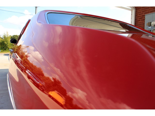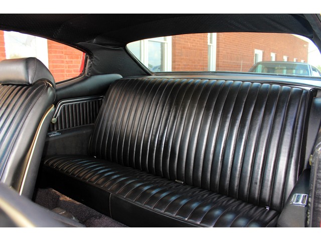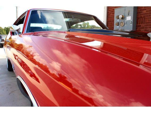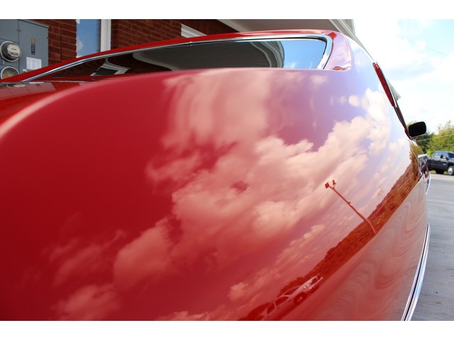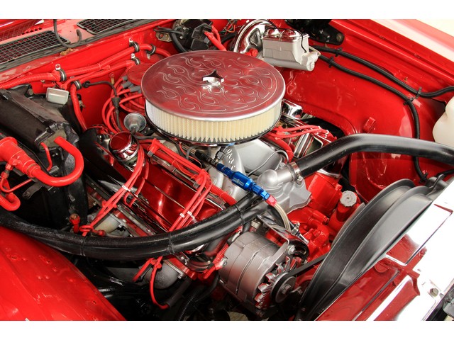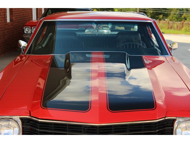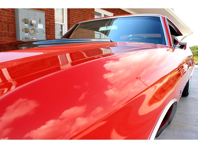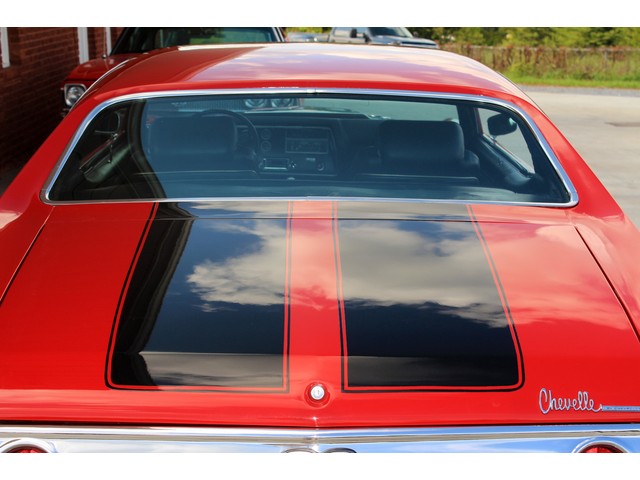 We will start off with the exterior of the Chevelle. When you look down the sides you can see they did a nice job when this car was restored. It has good lines with good fit of the panels. The bumpers and other chrome was replaced at the time of the resto. The weather stripping was also replaced. It has the Steel Cowl Hood with the Correct Emblems. It also has the dual Mirrors. The black stripes accent the Cranberry red Paint well. The paint on this Chevelle looks good and we believe it to have been painted about 5 years ago. It has a deep rich shine that is slick to the touch. The final exterior touch is the set of 18” and 20” American Racing Wheels with New Tires.
