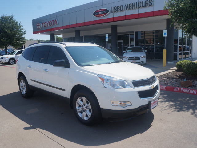 Carfax One Owner! PRICED TO SELL QUICKLY! Research suggests it will not be available for long. This 2012 ALMOST NEW Chevrolet Traverse LS has a great looking White exterior and a Dark Graylight Gray interior! Looks Fantastic! -New Tires, Oil Changed, New Engine Air Filter, New Wiper Blades, and Vehicle Detailed!- This Traverse has many valuable options: -Automatic Headlights- -Rear Air Conditioning- -Power Locks- -Power Windows- -Power Mirrors- -Cruise Control- -Roof Rack- On top of all that, it has MANY safety features. -ABS Brakes- -Traction Control- -Stability Control- Our pricing is very competitive and our vehicles sell quickly. Please call us to confirm availability and to setup a time to drive this Traverse! We Offer Financing; and Specialized Financing for people with Bad, or No credit. We also Offer Extended Warranties, and Accessories for your new or used Toyota. Please ask for Internet Pre-Owned Sales to ENSURE internet pricing. Freeman Toyota, located in Hurst, TX, is honored to serve those in the Fort Worth area, with surrounding cities being, Euless, Bedford, Keller, Grapevine, and Southlake. We are proud to be one of the premier dealerships in the area.