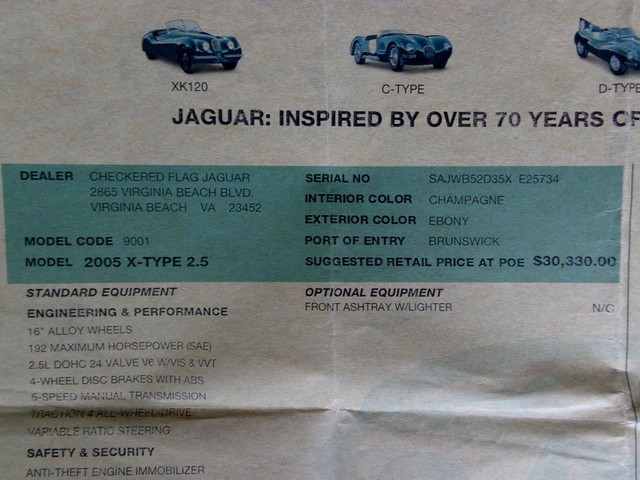 Hello and thanks for stopping by our "No Reserve" auction for this very low, original mileage, regularly serviced, clean Carfax history, All Wheel Drive, 2005 Jaguar X-Type 2.5L, V6, 5-speed manual, luxury sedan. Only 35,187 low, original miles!! According to the Carfax history report below, she has been regularly serviced by the dealer, had her 40,000 mile service and is more than $680 above retail book value!! She has been checked out thoroughly, serviced and is now ready to go! She is so so very clean and runs and drives like new. This beautiful, vehicle has been more than loved by its 2 previous owners. As you can see in the many detailed photos, the "Ebony Black", exterior shines like the Florida sun! She really looks beautiful. The undercarriage is note worthy also, looks great for and undercarriage. I have personally driven this vehicle and "WOW" was I impressed! On wet, twisty, roads, this Jag can demonstrate its handling skills at every curve and corner. Responding quickly and surely to steering inputs, this sedan is confident and surefooted at all speeds. Even on moderately imperfect pavement, the ride is sheer pleasure. The 192hp, 2.5-liter V6 feels solid, is smooth, quiet and the 5-speed manual transmission hits every gear with ease, no clutch slippage was felt. Five people fit in the cockpit-style interior, which features "Champagne" leather and gorgeous interior wood trim. The leather upholstery is in very good condition, extra extra clean, no rips or tears. Features, All Wheel Drive, 8-way power driver seat, power and manual passenger seat, power locks, windows, mirrors, fog lights, spare tire, jack, CD player, very good condition 16" alloy wheels-no curb rash, 4-wheel ABS disc brakes, 5-speed manual transmission, good condition tires, external temperature display, tilt/telescopic, leather steering wheel with cruise and audio controls, owner's manual, beautiful interior wood trim accents, rear door child locks, cruise control, rear defogger, tachometer, keyless entry, floor mats, front, side and knee air bags, engine immobilizer, clean Carfax and much more! Air conditioning is ice cold! This, curvaceous, sedan just looks so good, even when standing still! Stylistically, the X-Type is one of the best-looking luxury sedans available. This is a fine example of a, clean, well taken care of, pre-owned, vehicle. All of our vehicles are sold with clean titles. Our titles are free and clear of any and all liens. At the time of delivery, we will include any extra keys/remotes that we received for the automobile when we purchased it. We also use our detailed pictures as a physical description as well so look at them closely. Be realistic in your expectations. Read our "terms and conditions" below. High bidder wins it!! Pre-sale inspections are welcomed and encouraged. Aside from Ebay's finance, we do offer financing possibilities as well as we do accept trade-ins. Please provide VIN# and photos. Extended warranties are available for specific vehicles, please ask the selling dealer for details. If you have any questions about this or any of my other auctions or would like a "buy it now" price through EBAY, please feel free to contact me, Avi Fraser, via e-mail at surewecanmakeadeal@rollingwheelsinc.com or you can call me at 954-527-5522. We are always open to negotiate and 4 SURE, WE WILL MAKE A DEAL WITH YOU! Thank you for your interest and I look forward to hearing from you. Please visit our location at Rolling Wheels 125 E. Sunrise Blvd. Ft. Lauderdale, Fl. 33304. We are open, m-f, 9am-5pm. Saturday, 9am-4pm. Closed Sunday and holidays. Here is the link to our online credit application: http://www.rollingwheelsinc.com/ApplyOnline.htm   SEDAN 4 DRStandard Equipment  |Safety Options Standard EquipmentPower Windows, Power Steering, Air Conditioning, AM / FM CD, Power Brakes, Tilt Wheel, 6-digit Odometer