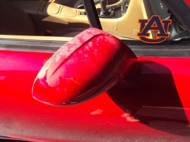 The exterior is a glossy bright red. There are no major dents or dings. No body rust. The main body item is the clear coat is chipping on the rear bumper and the right side mirror (see pic). The tan convertible top needs to be restiched around the rear window. No windshield cracks but there is a chip on the driver side. The tires, on alloy wheels, have about 30% tread (see pic). The lights and lenses are bright with no cracks.