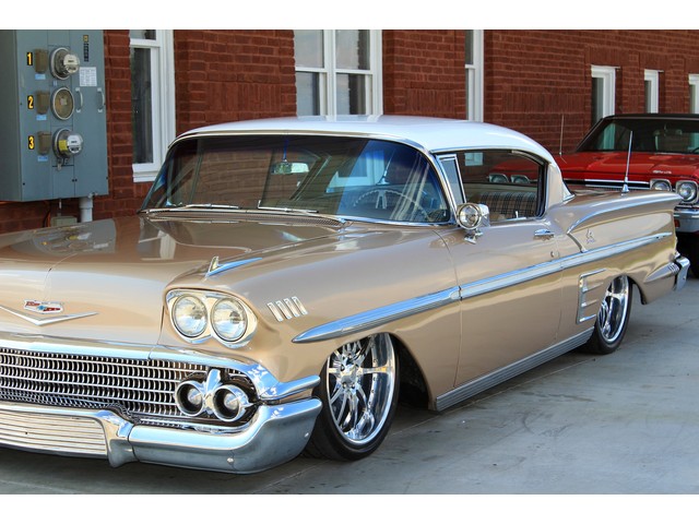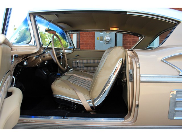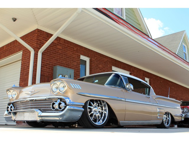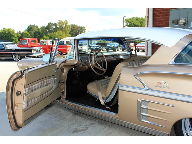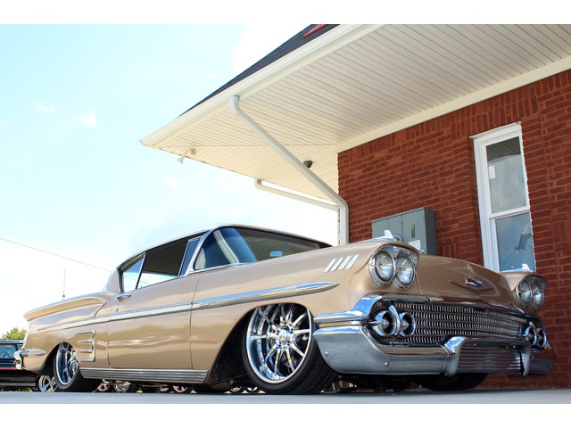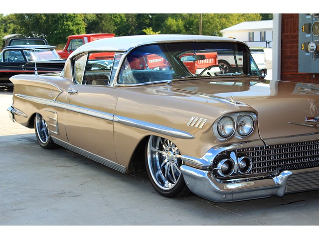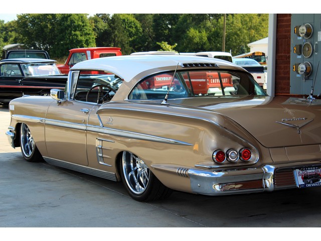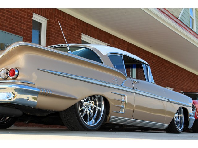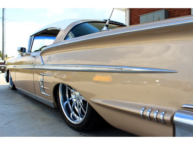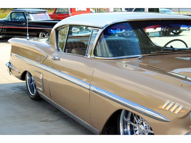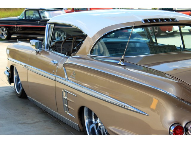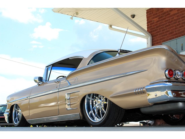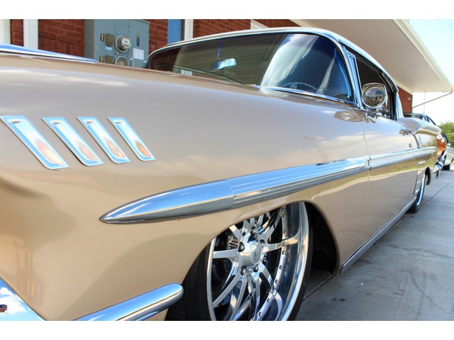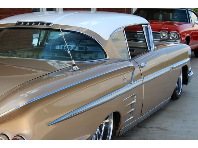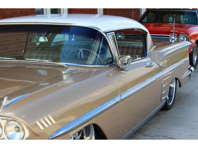 We will start off with the exterior of the Impala. When you walk around this ’58 the body is straight as an arrow with great line. The fit of the panels is as good if not better than when new. Everything is covered in the Gold Paint Scheme that is accented by the White Top. When you look at the stainless down the sides and around the windows and grill it all lines up good and looks very good. It has the dual intinac and the spot lite mirror which is a nice touch. All the glass is in very good shape as well as the seals and weather stripping. It also look sot have new bumpers and other chrome. The final exterior touch is the set of Billet Wheels with like new tires.