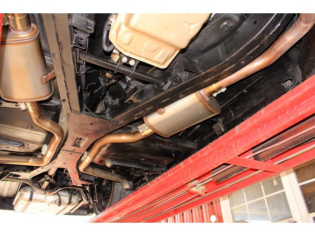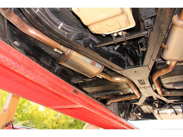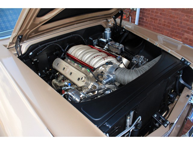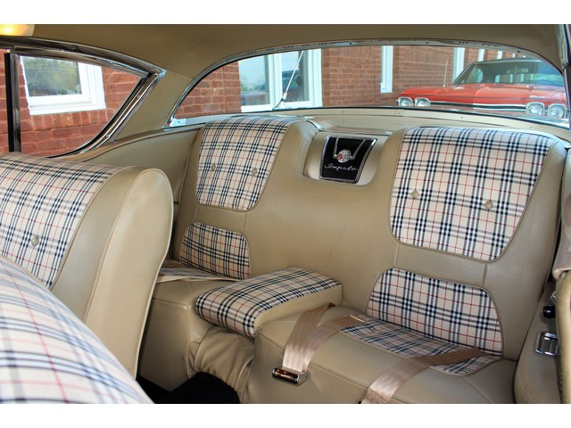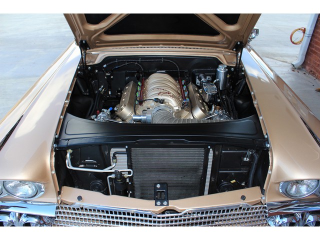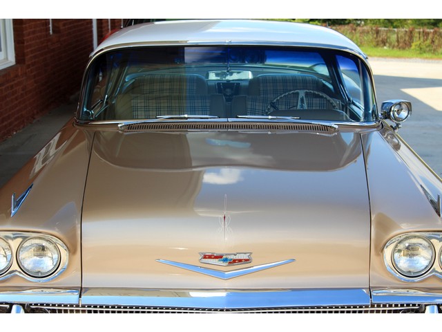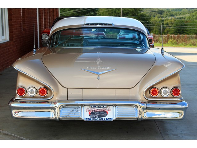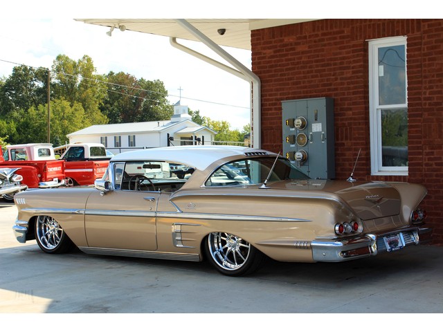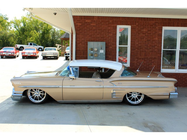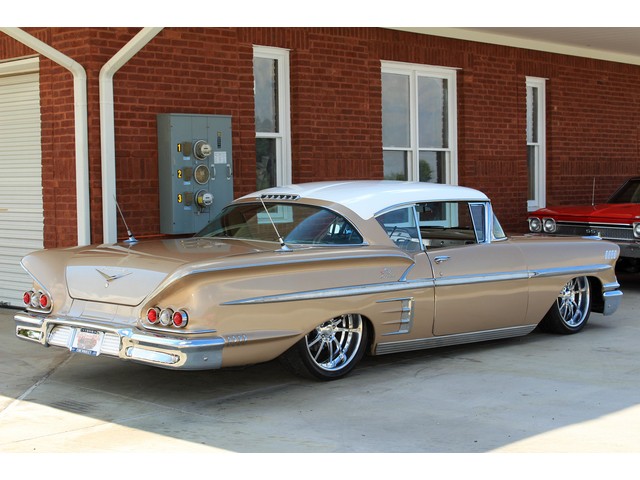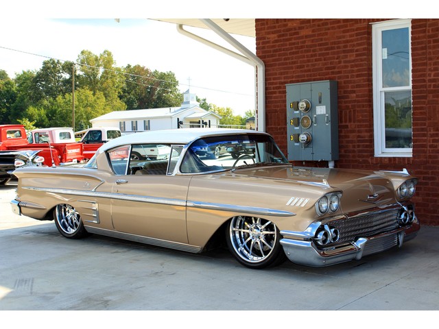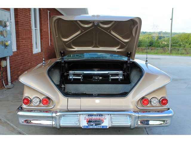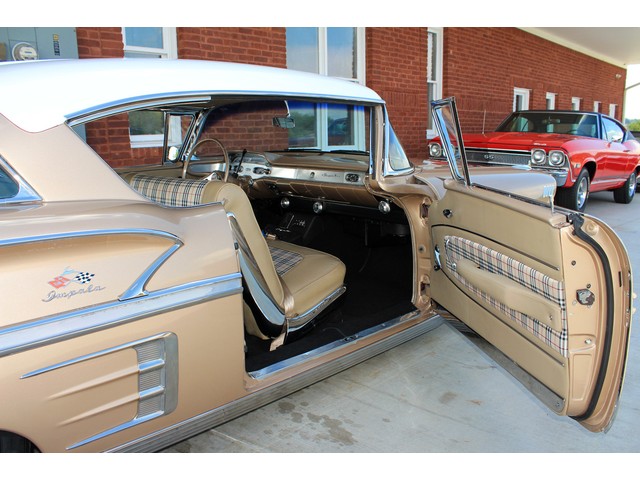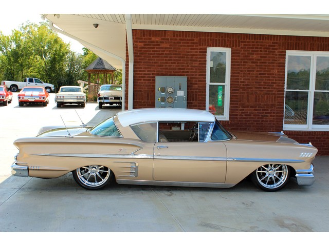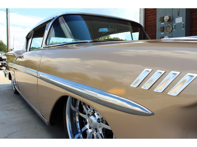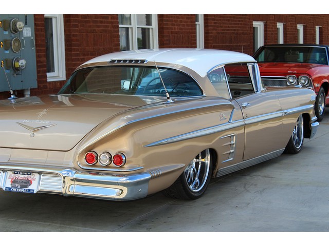 We will start off with the exterior of the Impala. When you walk around this ’58 the body is straight as an arrow with great line. The fit of the panels is as good if not better than when new. Everything is covered in the Gold Paint Scheme that is accented by the White Top. When you look at the stainless down the sides and around the windows and grill it all lines up good and looks very good. It has the dual intinac and the spot lite mirror which is a nice touch. All the glass is in very good shape as well as the seals and weather stripping. It also look sot have new bumpers and other chrome. The final exterior touch is the set of Billet Wheels with like new tires.