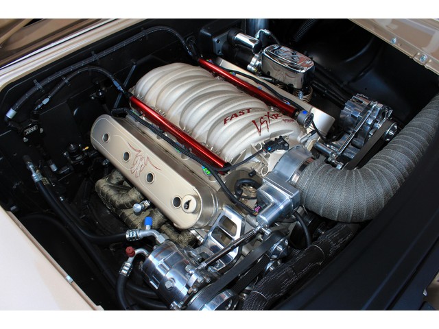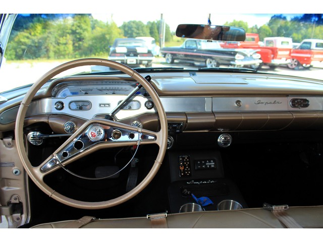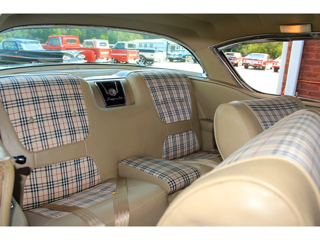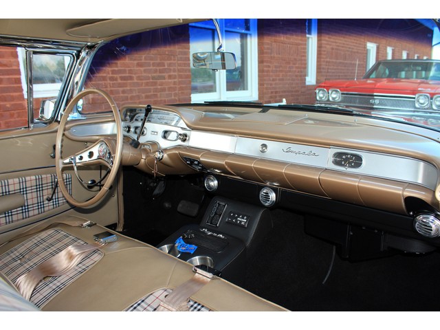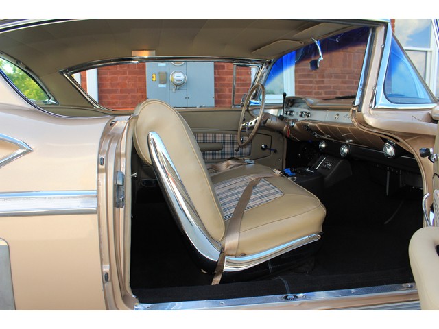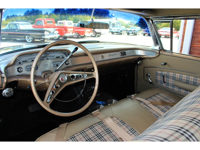 Next, we will take a look at the interior of the ’58. On the inside it looks as it would have in ’58 with the exception of the upgrades to the instrument panels and the air ride controls. The instruments are Dakota Digital that are made to work with the LS engine. The seats are Beige Vinyl with cloth inserts that match the door panels. Black carpet was added and when you look at the dash it’s painted the same as the outside. When you look at the stainless trim it all looks very good.