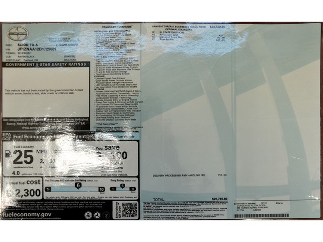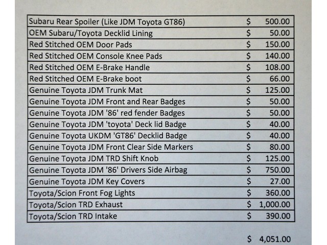 This ScionFR-S has been modified by the mature enthusiast owner using only genuine Toyota Japanese Domestic Market (JDM) imported parts to exactly replicate a (JDM) version of the Toyota FR-S sold in Japan. The parts (besides the TRD performance exhaust and TRD performance intake) are mainly cosmetic, and most of the removed Scion parts are available and included with the car should the new owner want to put it back to USDM Scion stock. The M.S.R.P new totaled $25,749.00 as equppied.