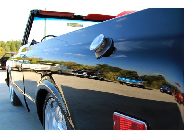 We will start off with the exterior of the Blazer. When you walk around it you will say wow. This K5 is laser straight with good lines. The fit of the panels is great. It has new bumpers and a new grill. The side marker lights and tail lights are also new. They also replaced all the weather stripping. The tuxedo black paint looks great with a deep rich shine. You can see the time that was spent to make it right along with the white top and the 20” American Wheels it has a killer look.