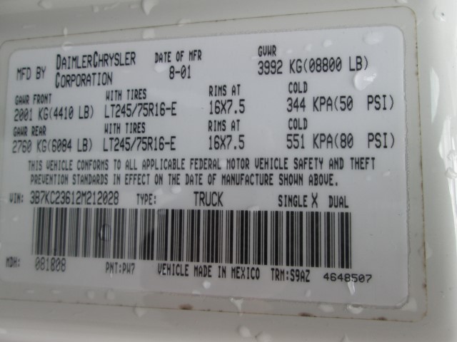 Ok 5.9 CumminsTurbo Diesel Lovers this is your "Holy Grail" it is a 2002 Dodge Ram 2500 (last year of this body style and my favorite) Quad Cab with low miles and in great condition! It is a 2WD truck in the quad cab variation with an automatic transmission! It is white with charcoal cloth interiror with a 40/20/40 front seat seat and a 60/40 rear seat for a 6 passenger cab capacity for your crew! It has the 3.55 rear axle ratio with the anti-spin option. It has the factory rally wheels with trim rings and center caps riding on matching Michelin tires and the front end has just been aligned and tires rotated. This great truck drives out great in every respect and manner! It has a clean Car Fax Report showing no accident history and I see no reason to doubt the Car Fax Report from what I see with the naked eye either!