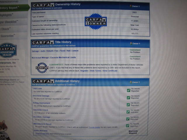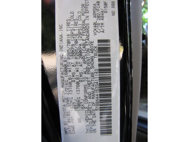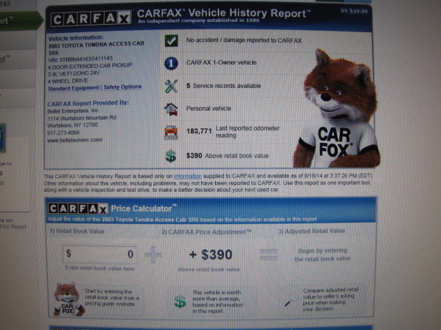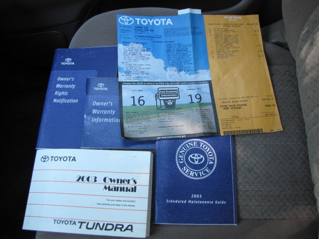 This 2003 Toyota Tundra SR5 4WD Access Cab V6 3.4L 5 Speed Manual transmission pick-up is in very good condition, well maintained, serviced and taken care of. Never in accident with clean Carfax report on file. Exterior has no paint work. Just a couple of minor dents on the right side and few surface buffable scratches maybe found. No paint damage dents or deep scratches. Basically normal wear. Overall I'd give exterior 8-9 out of 10. Interior is extra clean. Non-smokers vehicle. No foul odor, no stains. CLean, clean clean. No wear or tear on the uphostery 10 out of 10. Mechanically the truck is serviced and inspected. Oil changed, good brakes, new rotors, great tires. Equipped with Towing Hitch, Power Windows and Locks, Cruise Control, Sliding Rear Window and much more. For more info call us at 917-273-4066 Thank you