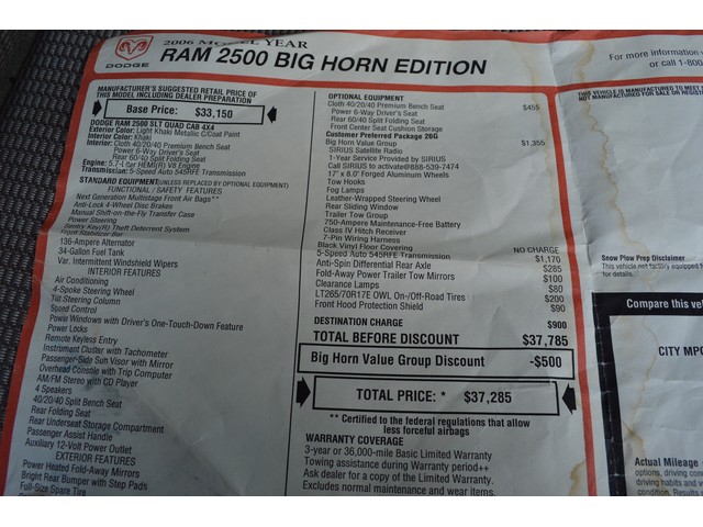 You are looking at a 2006 Dodge Ram 2500 Quad Cab SLT . It is powered with a 5.7L V8 Hemi and an automatic transmission. It is equipped with power drivers seat,power mirrors, power trailor windows,power locks,am/fm/cd player, bedliner, and receiver hitch. Also included is one keyless remote, the original window sticker, and the owners manuals.