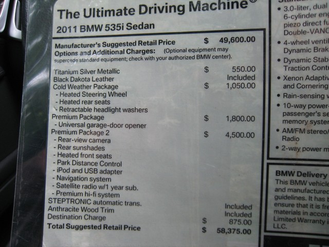 2011 BMW 535 Only 40,600 Miles Finished in titanium Sliver Metallic with Black Dakota Leather Navigation Rear View Camera, satellite Radio, Cold Weather Package, Heated Steering wheel, Heated Rear seats, Premium Package with Premium 2 Package Anthracite wood Trim...... Clean Carfax 2 seats of Keys.. original window sticker Full Service @ Autohaus BMW in St. Louis MO , Brake service and oil service done last week Call 314-565-7761 Worldwide shipping avalible