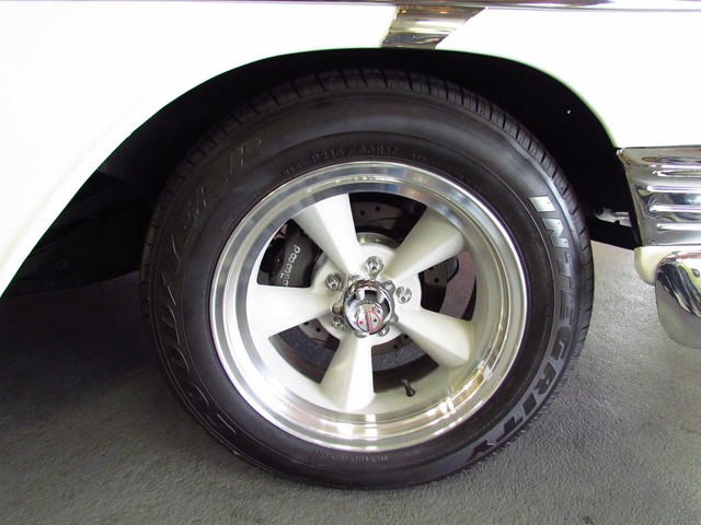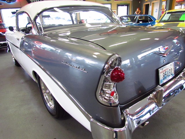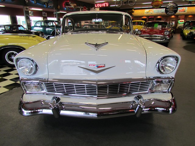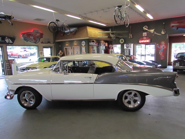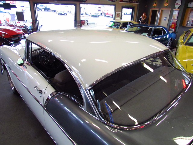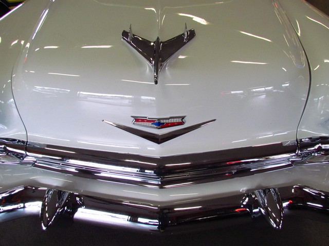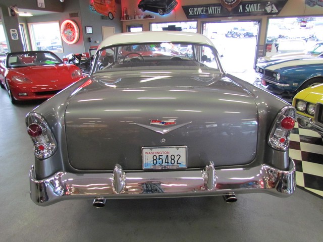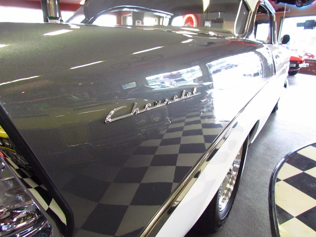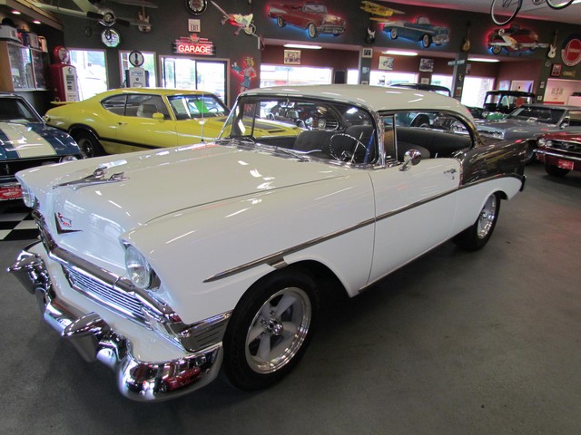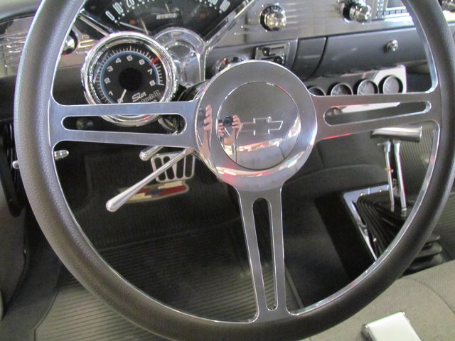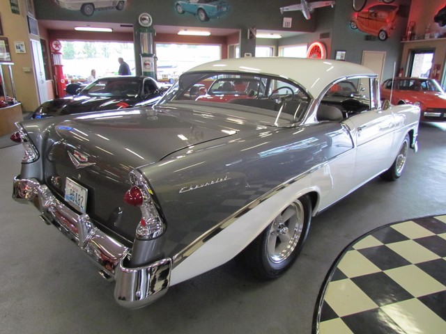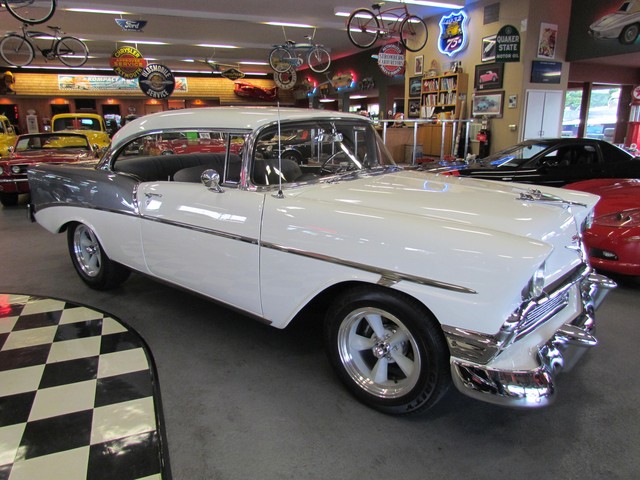 Here's a beautiful restored 1956 Chevrolet 2 door hardtop. 350ci Brodix aluminum heads, Comp Cams cam and valvetrain, Edelbrock Air Gap intake, Holley Avenger carb, Doug's ceramic coated headers, Custom 3" stainless exhaust, Pypes mufflers, High volume aluminum water pump, Electric fan, Aluminum radiator, High torque starter, MSD ignition. Turbo 400 automatic transmission, Lokar electric kickdown. 9" Ford rear end with 3.00 positraction, Willwood 4 wheel power disc brakes, Front and rear sway bar upgrade, CCP 500 series power steering box. New upper and lower control arm bushings, Body mounts, shocks, Fuel tank. 17" American Racing Wheels 215/65 front, 255/60 rear tires. Grey cloth custom interior, Ididit Chrome tilt column with Billet Specialties Split spoke 1/2 wrap wheel, Retro Sound stereo with ipod jack, Amp, Subwoofer and rear deck speakers hidden in trunk compartment. Dynamat soundproofing on floorboards. Clean underbody - Check out the close up pictures. Big stack of receipts to document, Fresh restoration ready for you to show or cruise!