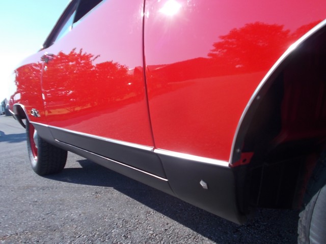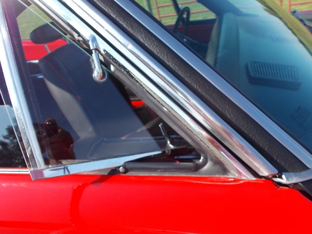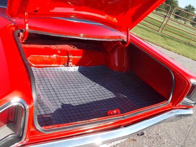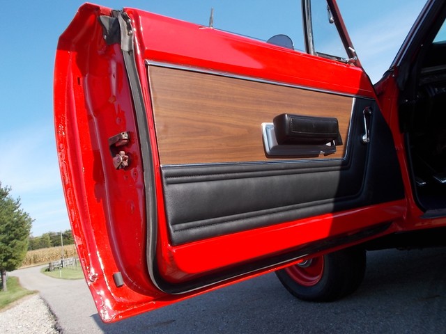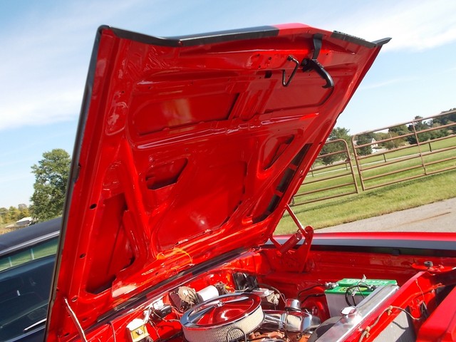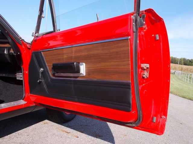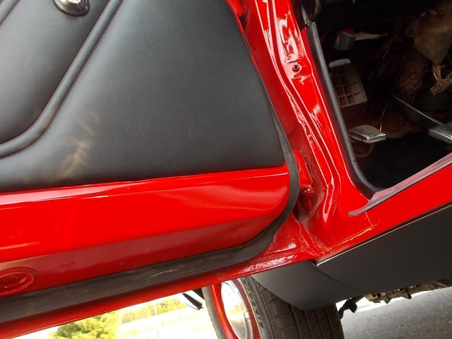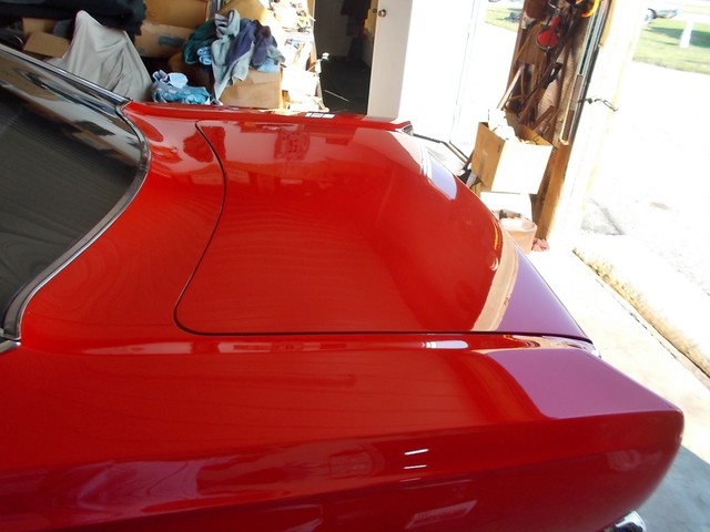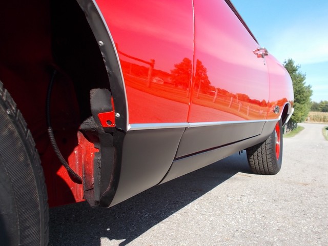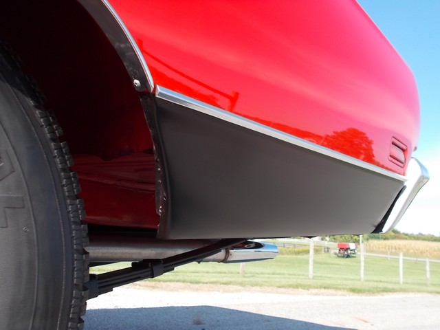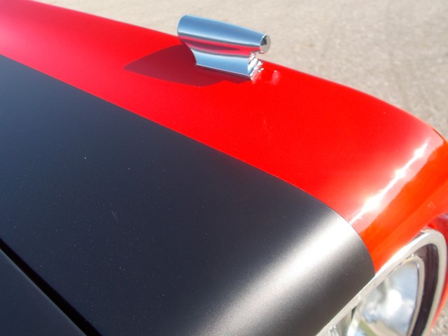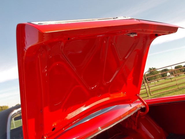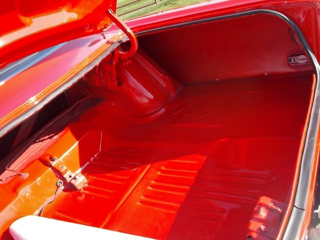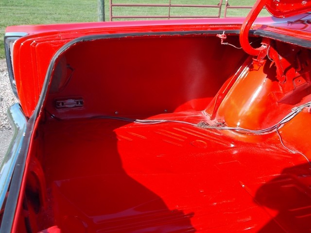 THE BODY IS LAZER STRAIGHT WITH NEAR PERFECT EXTERIOR RED PAINT HIGHLIGHTED WITH MATTE BLACK PAINTED STRIPES. IT DID NEED QUARTER SKINS, AND TRUNK PAN. FENDERS AND DOORS NEVER PATCHED. UNDERSIDE ALL PAINTED. HAS NICE LINES. DOORS WORK GREAT. DRIVER WINDOWGOES DOWN EASY BUT A LITTLE STIFF TO ROLL UP.