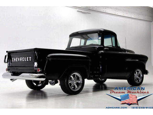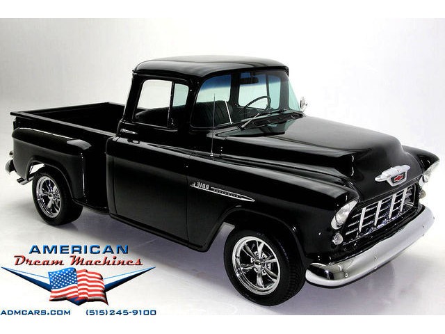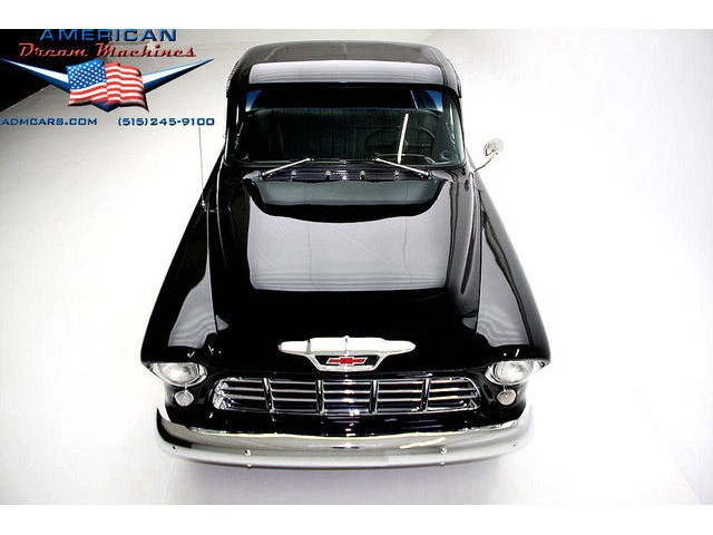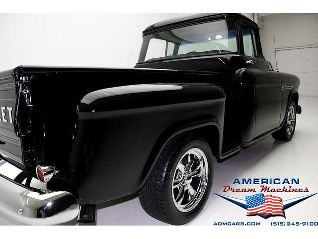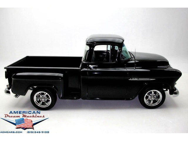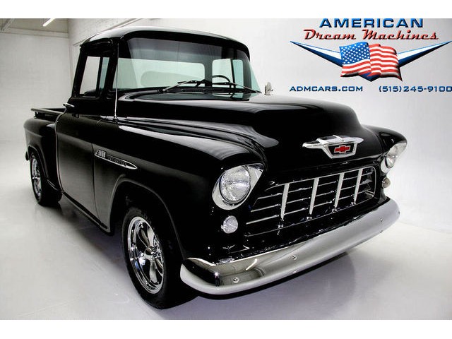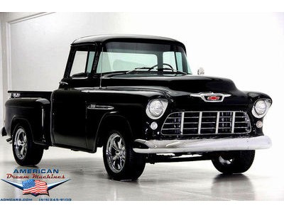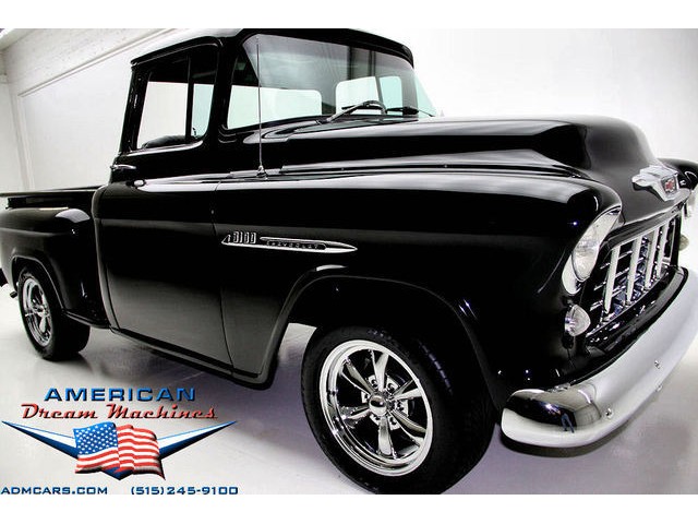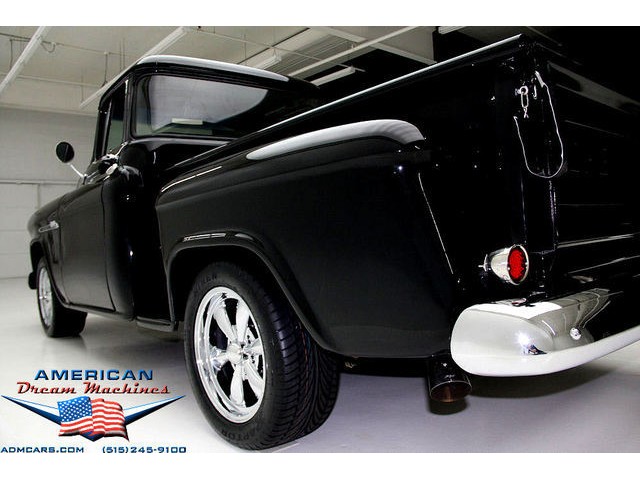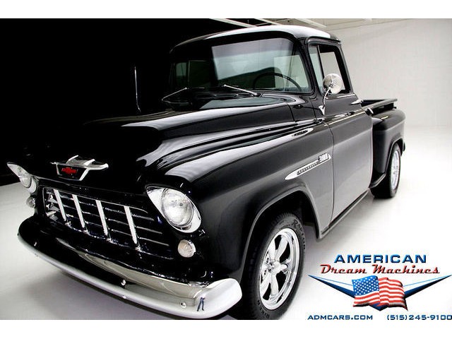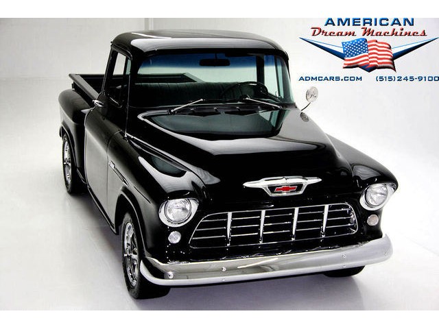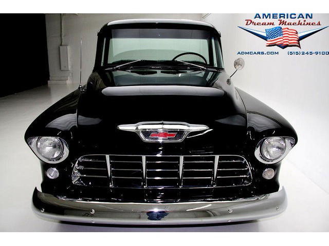 BLACK BIG BACK WINDOW 1955 CHEVY PICKUP WITH A 454 BIG BLOCK AND ROLLING ON NEW CHROME AND LOOING GOOD!!! This is a very nice 1955 Chevy black big back window, step side, short box pickup with a 454 big block and ready to roll! This little truck has a beautiful black paint job and was sprayed over a solid body. The under carriage is also very solid and structurally sound. New chrome against the black paint really stands out. New front bumper, newer grill and hood emblem. Also new bumble bee park lamp assemblies and windshield. Rear has new bumper, tail lights and tail gate chrome chains. The rest of the chrome is original and in nice condition. Pickup bed has newer oak planks and stainless steel rails. Black interior has a custom bench seat, original dash with excellent gauges and steering wheel. There is a new AM FM stereo radio and a Lokar shifter. Engine is a mid 70s Chevelle 454 with MSD ignition, that looks like it belongs there. It has original style chrome valve cover and air cleaner. Drive train is a 400 turbo 3 speed automatic transmission and a Camaro rear axle. Exhaust has cast iron manifolds, dual pipes and performance mufflers. Brand new 17 inch chrome wheels and performance tires set the truck off. Our #1 Goal at American Dream Machines is to make our customers happy with the cars we sell. This is not an easy goal to achieve when selling 40, 50 and 60 year old cars. We highly recommend that ALL CUSTOMERS call our staff and have very detailed discussions regarding overall condition of any classic car they are considering buying. We are located in the center of the Heartland in Des Moines Iowa. Our staff has midwest values and they will make every effort possible to represent our customers best interests and accurately describe the cars we sell. All older cars have older parts. If they had all new parts, they would be new cars ;-) YES, ALL OF OUR PICTURES ARE REAL, ALL THE WAY AROUND!!! Our pictures are taken in our professional photo studio for the best possible lighting and image accuracy to give our customers the most accurate representation of our cars on all sides.Vin #2550008990 (((PLEASE CALL FOR DETAILS))) 515-245-9100 American Dream Machines is located in a 41000 sq. ft. historical Packard Dealership and is one of the largest full service classic car dealerships in the Midwest. We specialize in American Muscle cars with integrity. None of our cars are consigned. All of our cars prices are always listed on our website to show the values of the cars we sell. We usually have at around 80-100 cars in stock at all times. Please call (515)-245-9100 and we will be happy to tell you about our cars. Des Moines largest classic car dealership, ''Specalizing in American muscle cars with Integrity.'' This vehicle is being sold as is, where is with no warranty, expressed written or implied. The seller shall not be responsible for the correct description, authenticity, genuineness, or defects herein, and makes no warranty in connection therewith. No allowance or set aside will be made on account of any incorrectness, imperfection, defect or damage. Any descriptions or representations are for identification purposes only and are not to be construed as a warranty of any type. It is the responsibility of the buyer to have thoroughly inspected the vehicle, and to have satisfied himself or herself as to the condition and value and to bid based upon that judgement solely. The seller shall and will make every reasonable effort to disclose any known defects associated with this vehicle at the buyer's request prior to the close of sale. Seller assumes no responsibility for any repairs regardless of any oral statements about the vehicle. x - All sales are final so please feel free to do a pre-buy inspection.