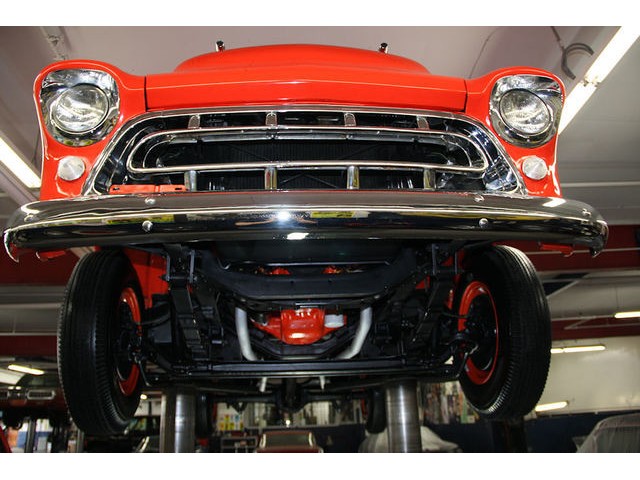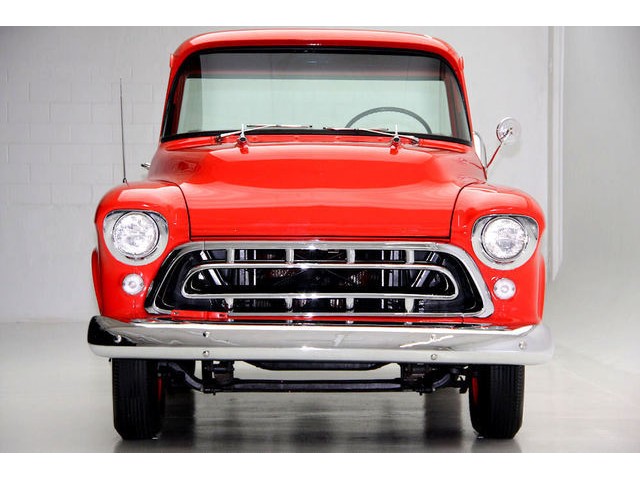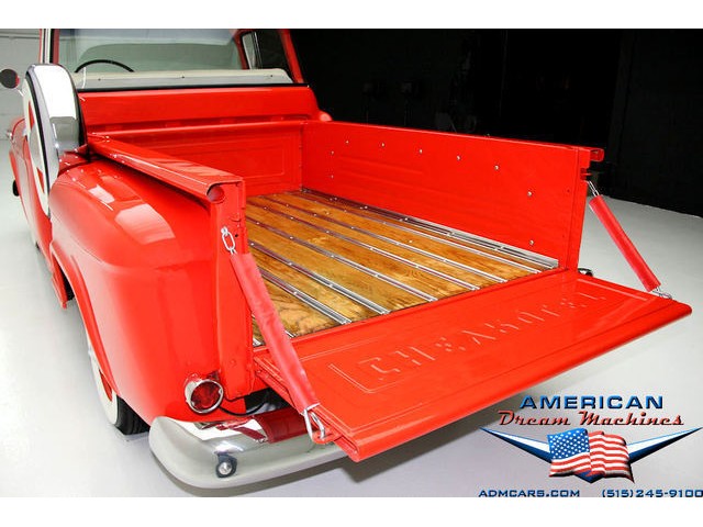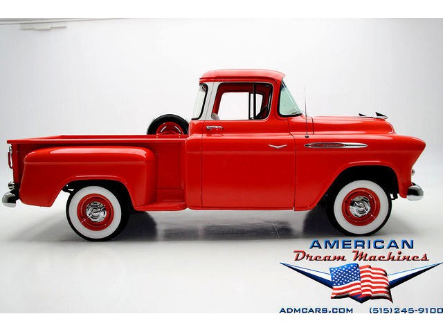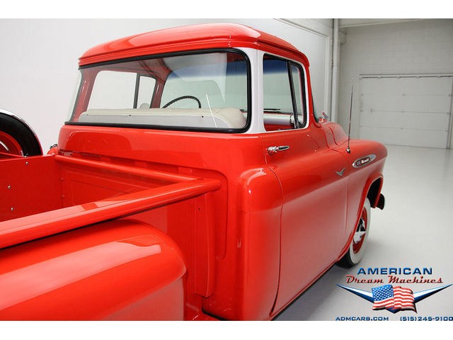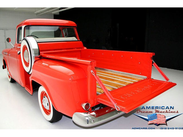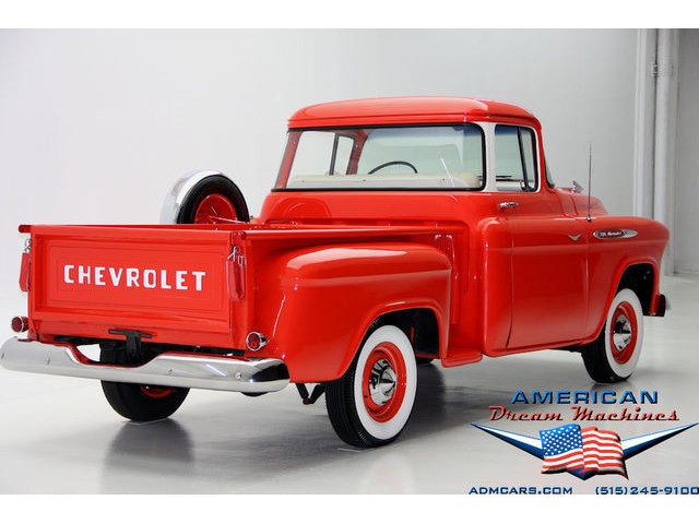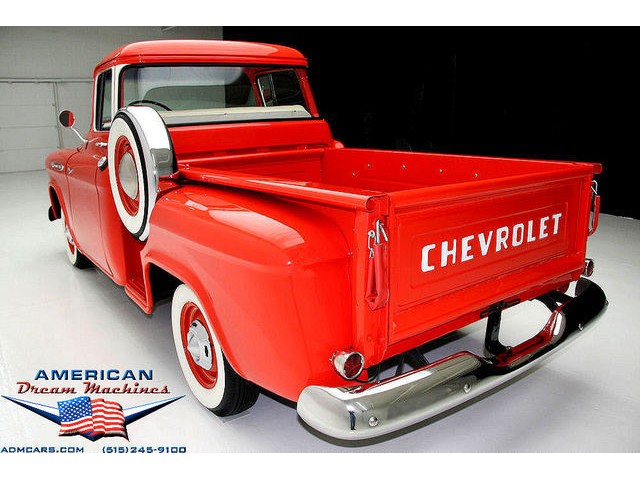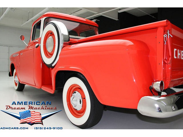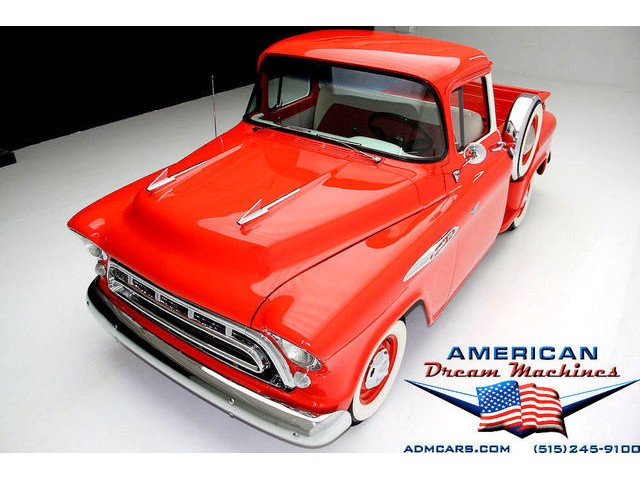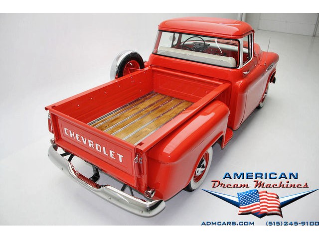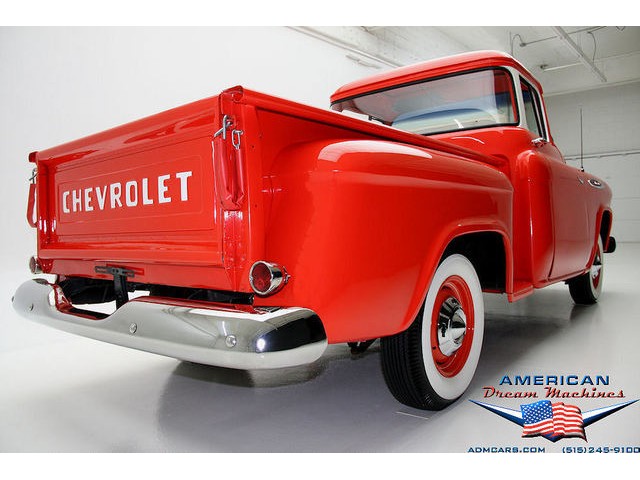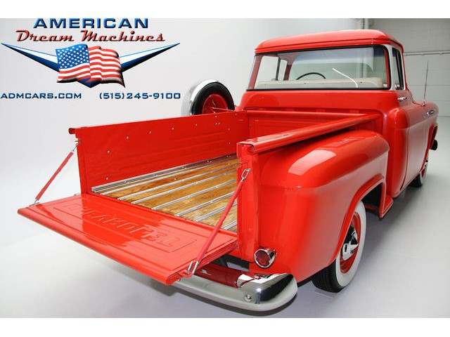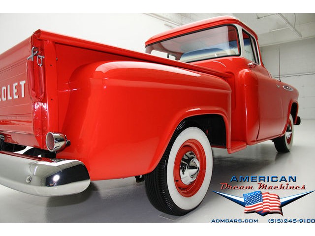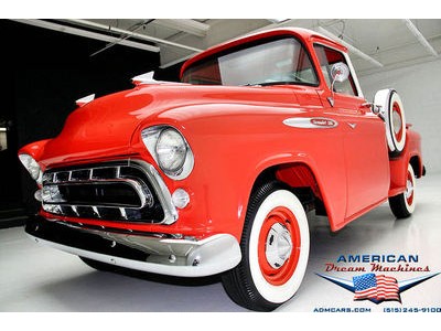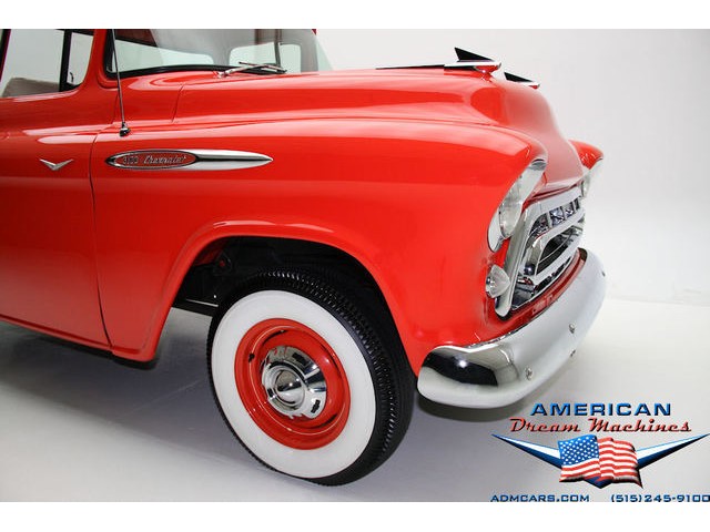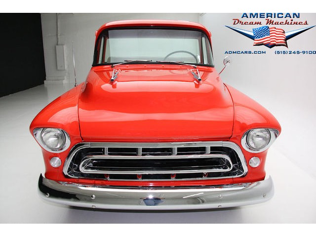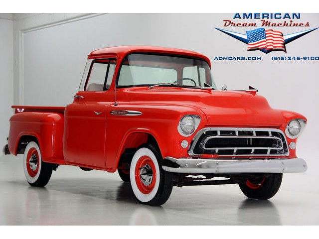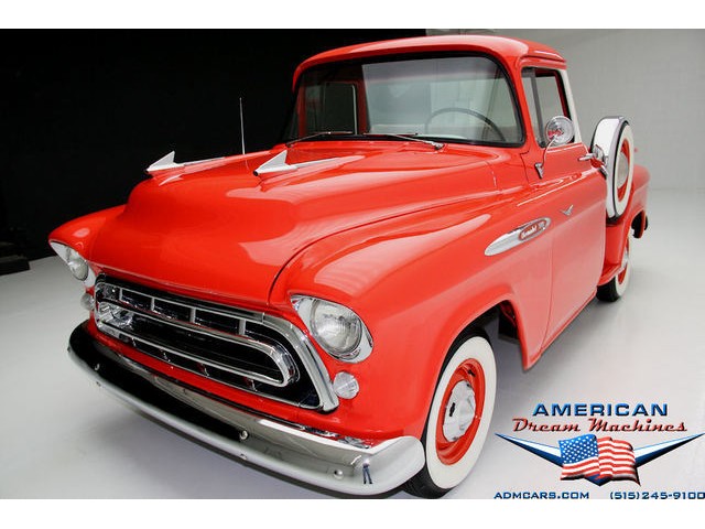 NEW LISTING!!! THE ORANGE CRUSH!!! YOU WILL FALL IN LOVE WITH THIS 1957 CHEVY BIG BACK WINDOW PICKUP. OUTSTANDING SECOND SERIES TRUCK WITH A V8 265 ENGINE, 3-SPEED TRANSMISSION AND MAJOR CURB APPEAL ROLLING ON WIDE WHITES. Rare Omaha Orange big back window 1957 Chevrolet 3100 step side pickup with V8 power. This amazing truck was previously titled in Oklahoma which accounts for its rock solid body and undercarriage. The bright orange paint has a beautiful shine and is accented with white trim. Brilliant chrome grille, bumpers and taillights. Nicely finished Oak bed with chrome strips. The glass is clear and bright including the rare big back window. Under the hood has been restored to an original appearance with a great running 265 V8 engine supplying the power. The 3 speed manual transmission shifts smoothly Through the gears giving that nostalgic driving experience. The interior has very nice paint and detailing. New original style seat upholstery that looks fresh and crisp. The dash chrome and bezels are in good condition. Factory AM radio. Neat original steering wheel with chrome horn center for a great old truck feel. The undercarriage of this hauler is structurally amazing. The suspension has been serviced properly through the years and makes this truck a blast to drive. The wheels have been painted to match with chrome hubcaps then wrapped in Firestone wide whitewalls for just the right look. Vin#V3A57J110881. Our #1 Goal at American Dream Machines is to make our customers happy with the cars we sell. This is not an easy goal to achieve when selling 40, 50 and 60 year old cars. We highly recommend that ALL CUSTOMERS call our staff and have very detailed discussions regarding overall condition of any classic car they are considering buying. We are located in the center of the Heartland in Des Moines Iowa. Our staff has midwest values and they will make every effort possible to represent our customers best interests and accurately describe the cars we sell. All older cars have older parts. If they had all new parts, they would be new cars ;-) YES, ALL OF OUR PICTURES ARE REAL, ALL THE WAY AROUND!!! Our pictures are taken in our professional photo studio for the best possible lighting and image accuracy to give our customers the most accurate representation of our cars on all sides. (((PLEASE CALL FOR DETAILS))) 515-245-9100 American Dream Machines is located in a 41000 sq. ft. historical Packard Dealership and is one of the largest full service classic car dealerships in the Midwest. We specialize in American Muscle cars with integrity. None of our cars are consigned. All of our cars prices are always listed on our website to show the values of the cars we sell. We usually have at around 80-100 cars in stock at all times. Please call (515)-245-9100 and we will be happy to tell you about our cars. Des Moines largest classic car dealership, ''Specalizing in American muscle cars with Integrity.'' This vehicle is being sold as is, where is with no warranty, expressed written or implied. The seller shall not be responsible for the correct description, authenticity, genuineness, or defects herein, and makes no warranty in connection therewith. No allowance or set aside will be made on account of any incorrectness, imperfection, defect or damage. Any descriptions or representations are for identification purposes only and are not to be construed as a warranty of any type. It is the responsibility of the buyer to have thoroughly inspected the vehicle, and to have satisfied himself or herself as to the condition and value and to bid based upon that judgement solely. The seller shall and will make every reasonable effort to disclose any known defects associated with this vehicle at the buyer's request prior to the close of sale. Seller assumes no responsibility for any repairs regardless of any oral statements about the vehicle. x - All sales are final so please feel free to do a pre-buy inspection.