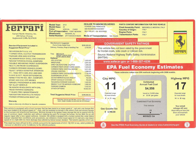 Chassis £. . . . . . . . . . . . . . . . 188205 Vehicle. . . . . . . . . . . . . . . . . 751801040 FERRARI FF MY12 V.I.N. . . . . . . . . . . . . . . . . . ZFF73SKA5C0188205 Window punching. . . . . . . . . . . . . HKS Note . . . . . . . . . . . . . . . . . . Warranty Start Date. . . . . . . . . . . 06/08/2012 Warranty End Date. . . . . . . . . . . . 06/08/2015 Customer . . . . . . . . . . . . . . . . ---- External Color. . . . . . . . . . . 364000000 EXTRACAMPIONARIO-NOT STANDARD ---- Internal Color. . . . . . . . . . . 364014310 SABBIA 4310 (SAND) ---- Carpets Color. . . . . . . . . . . 364900152 NERO 152 (BLACK) AFS1 AFS SYSTEM BRFC BRIEFCASE CALD GREY SILVERSTONE CALIPERS CIDL CARBON FIBER DRIVER ZONE+LEDS CILR CARBON FIBRE CENTRAL BRIDGE CRS1 CRUISE CONTROL DATR CARBON FIBRE DASHBOARD INSERTS ELEV SUSPENSION LIFTER EMR1 OUTER MIRROR BLACK INSERT EXA3 SPORT EXHAUST SYSTEM INST INSTRUMENT PANEL 094077935 STRUMENTAZIONE COLORE GIALLO LOGO 'SCUDERIA FERRARI' SHIELDS MIH2 INN/OUT ELETTR.MIRROR+HOMELINK PAC1 PARKING CAMERA PAC2 DUAL VIEW FRONT PARKING CAMERA PAR2 FRONT AND REAR PARKING SENSORS PDIS PASSENGER DISPLAY PIP3 COLOUR.INNER ALCANTARA INSERTS 364708500 ALCANTARA NERA 9913 PNTT TRIPLELAYER SPECIAL COLOURS 084338000 BIANCO ITALIA RBAS AUTOMATIC BOOT LID SYSTEM RSE1 REAR SEAT ENTERTAINMENT RSFD 20" FORGED DIAMOND RIMS RSFV VENTILAZIONE SED FULL ELECTRIC RWW0 REAR WIPER SNDB HIGH POWER HIFI SYSTEM STC1 ALL STITCHINGS IN COLOUR 364104000 NERO (BLACK) 4000 TPM0 TYRES PRESSURE MEASUREMENT Service Type Start Finish Genuine Maintenance 7 years 06/08/2012 06/08/2019