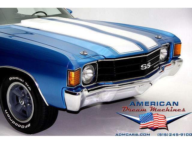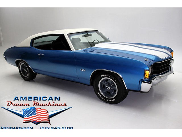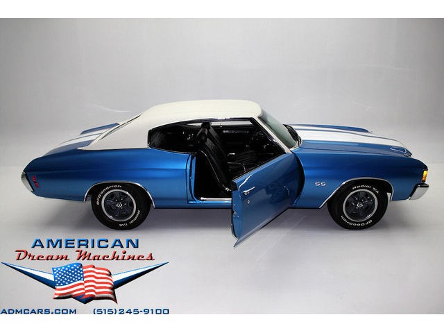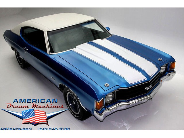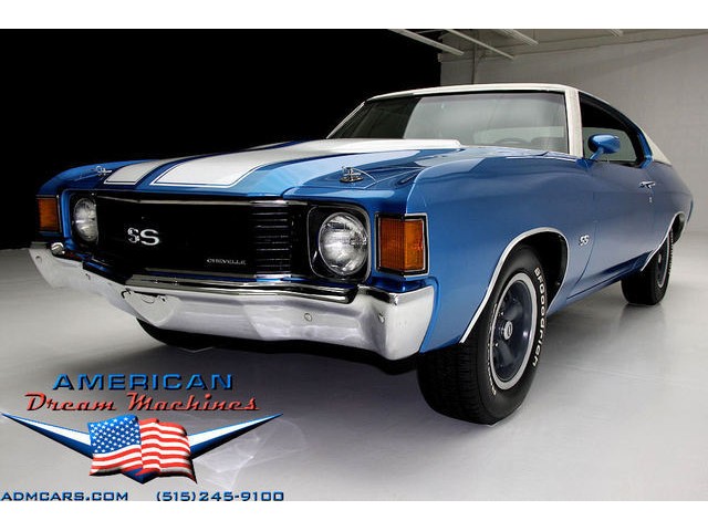 INCREDIBLE MULSANNE BLUE 1972 REAL SS CHEVELLE, PEDIGREE CAR WITH TWO BUILD SHEETS AND A #s MATCHING ENGINE. EXTENSIVE RESTORATION, GORGEOUS METAL STRUCTURE AND UNDERCARRIAGE, LOADED WITH POWER STEERING, POWER BRAKES, BUCKETS AND CONSOLE FLOOR SHIFT, ROLLING ON CORRECT FIVE SPOKE WHEELS AND NEW BFGs. Fully documented matching number genuine Chevelle SS painted in its correct Mulsanne Blue with White SS stripes. The real SS powered by a #s matching 350ci V8. The car lis launched by a TH350 3-speed automatic transmission and backed by a 10-bolt rear end with F-41 suspension. The original 2 bbl carburetor was later upgraded to a Rochester 4bbl Quadrajet. The SS black vinyl interior features a console shifter, front bucket seats, power steering, power brakes and AM-FM cassette stereo. This car features all of the correct SS badging, cowl hood, 5 spoke SS wheels, very nice correct SS instrument cluster, SS steering wheel. The under carriage of this car is like new with beautiful floors and dual exhaust and F41 suspension with boxed control arms and rear sway bar. Two original factory build sheets and California pink slip are included with this beautiful car. VIN #1D37H2L535896. Our #1 Goal at American Dream Machines is to make our customers happy with the cars we sell. This is not an easy goal to achieve when selling 40, 50 and 60 year old cars. We highly recommend that ALL CUSTOMERS call our staff and have very detailed discussions regarding overall condition of any classic car they are considering buying. We are located in the center of the Heartland in Des Moines Iowa. Our staff has midwest values and they will make every effort possible to represent our customers best interests and accurately describe the cars we sell. All older cars have older parts. If they had all new parts, they would be new cars ;-) YES, ALL OF OUR PICTURES ARE REAL, ALL THE WAY AROUND!!! Our pictures are taken in our professional photo studio for the best possible lighting and image accuracy to give our customers the most accurate representation of our cars on all sides. (((PLEASE CALL FOR DETAILS))) 515-245-9100 American Dream Machines is located in a 41000 sq. ft. historical Packard Dealership and is one of the largest full service classic car dealerships in the Midwest. We specialize in American Muscle cars with integrity. None of our cars are consigned. All of our cars prices are always listed on our website to show the values of the cars we sell. We usually have at around 80-100 cars in stock at all times. Please call (515)-245-9100 and we will be happy to tell you about our cars. Des Moines largest classic car dealership, ''Specalizing in American muscle cars with Integrity.'' This vehicle is being sold as is, where is with no warranty, expressed written or implied. The seller shall not be responsible for the correct description, authenticity, genuineness, or defects herein, and makes no warranty in connection therewith. No allowance or set aside will be made on account of any incorrectness, imperfection, defect or damage. Any descriptions or representations are for identification purposes only and are not to be construed as a warranty of any type. It is the responsibility of the buyer to have thoroughly inspected the vehicle, and to have satisfied himself or herself as to the condition and value and to bid based upon that judgement solely. The seller shall and will make every reasonable effort to disclose any known defects associated with this vehicle at the buyer's request prior to the close of sale. Seller assumes no responsibility for any repairs regardless of any oral statements about the vehicle. x - All sales are final so please feel free to do a pre-buy inspection.