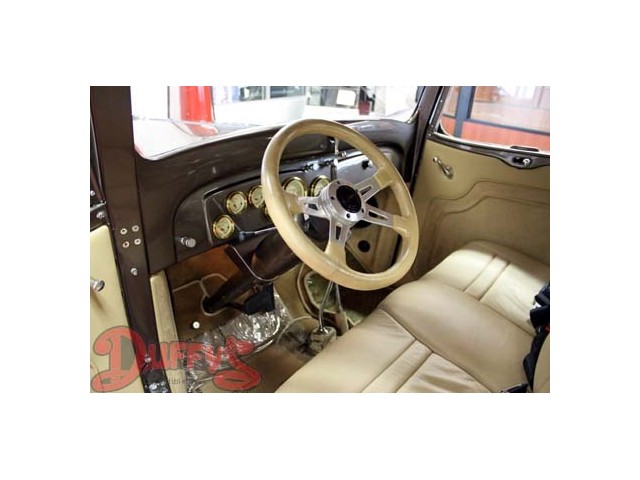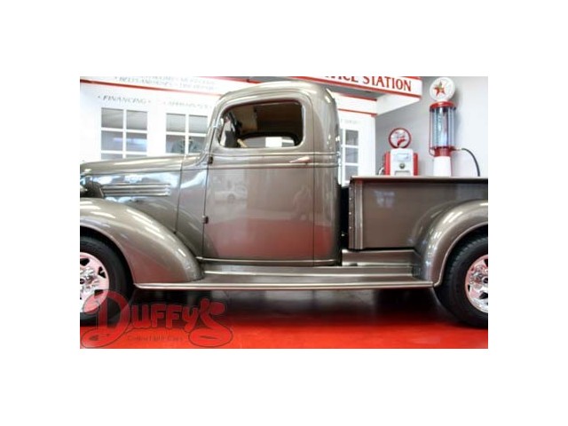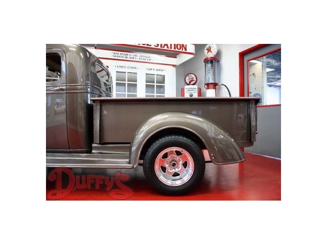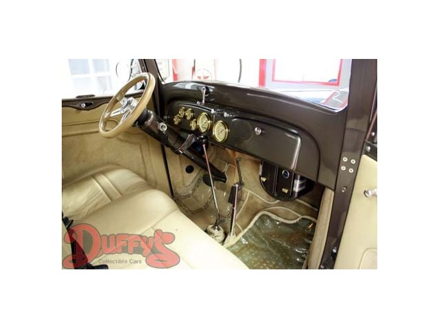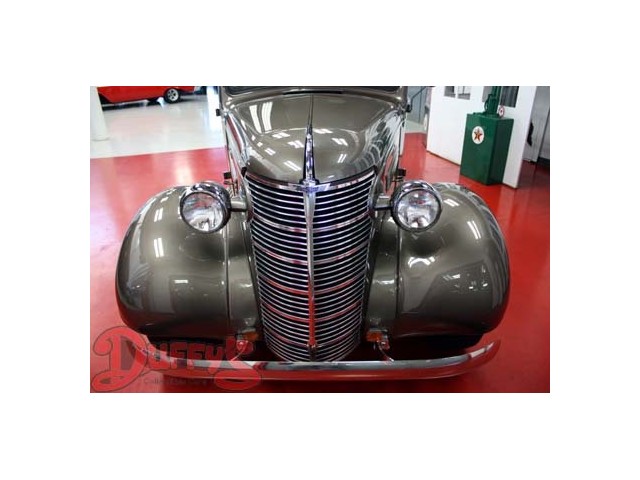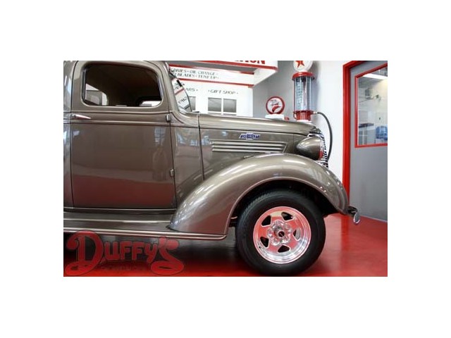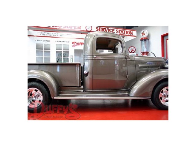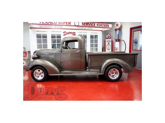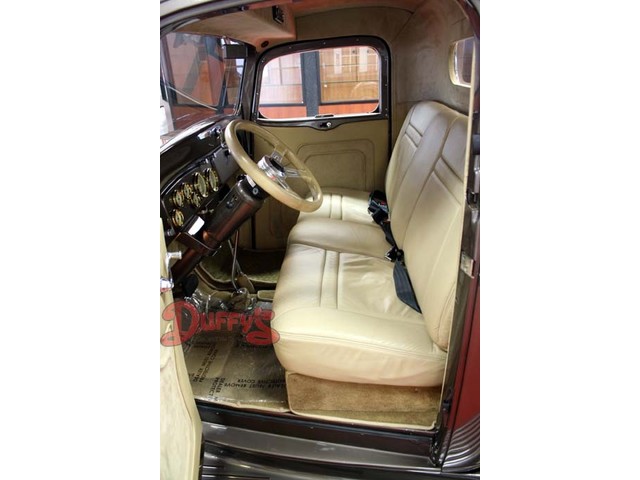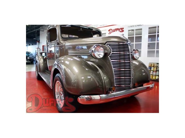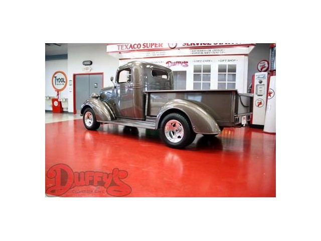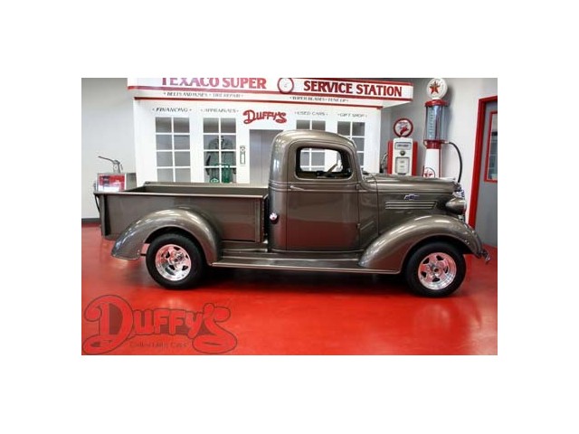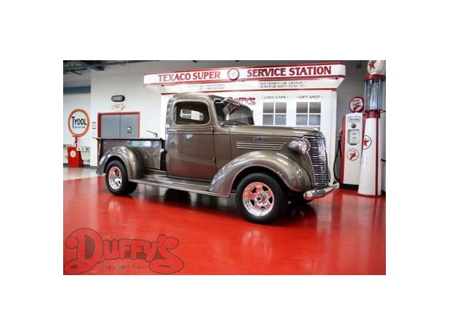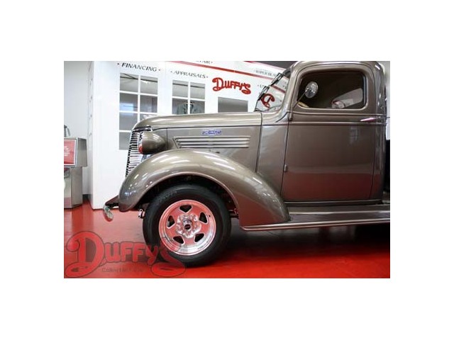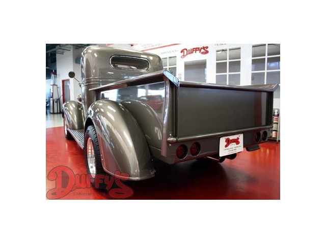1938 Chevrolet Pick-up Custom Show Truck Steel Body. This is the truck you wanted to build but you waited to buy it from us instead. All the Best Drivtrain pieces you would find in a premium Custom Hot Rod Truck. GM 350CI V8 backed by a 700R4 Automatic putting power to a Ford 9in Rearend Painted to match the Truck. The Undercarraige in finished in the same Bronze paint as the body and acompanied by more chrome pieces than i can count (I could count them but i waould rather just show you) The Interior is Finished in a supple light biege Leather and mathced to the Leather wrapped steering wheel. You look forward to find a complement of Wonderfully arranged guages and polished hardware. Under the hood you will find the image of performance with pleanty of show mixed enough "go fast" to thrill the judges and critics alike. I am constanlty drawn to the undercarraige visually inspecting the suspension which is not only color keyed to the car but assembled with chrome bolts, shakles and controlled by chrome shocks. We dont sell Acrilic Mirrors but you may want to buy a set to place under the truck when you get it home. The Mufflers are chromed and so are the exaust tips. Call for more details and dont miss anything on this truck. Only available from Duffy's Collectible Car's.