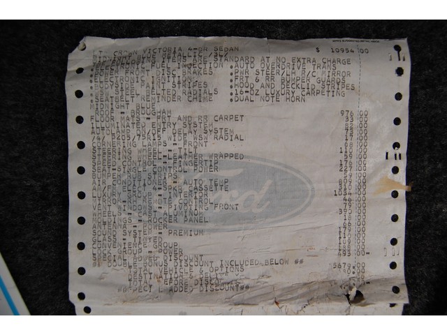 This Crown was ordered pretty healthily with the following options: PW, PL, Tilt, Cruise, Brogham Roof, Illuminated Entry, Automatic delayed lights, Cornering Lamps, Power Seat, Leather Wrapped Steering Wheel, Bumper Rub Strips, AC, AM/FM, Luxury Interior Group, Remote Mirror, Pivoting Vent Window, Aluminum Turbine Wheels, Power Antenna, Rocker Moldings, Premium Radio, Tinted Windshield, Convenience Group complete the long list of options this car has. The options totaled up to be more than half of what the car cost!!!!