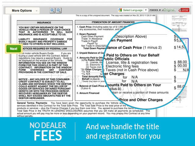 No Fees You pay for the price of the vehicle, taxes, title, and registration. We even handle the title and registration for you, so you can drive anywhere but the DMV