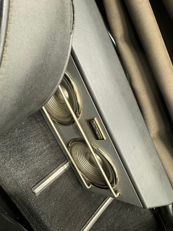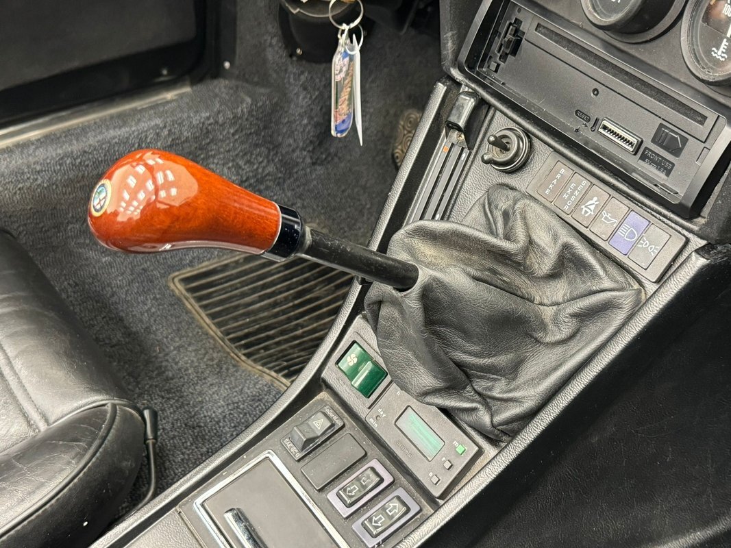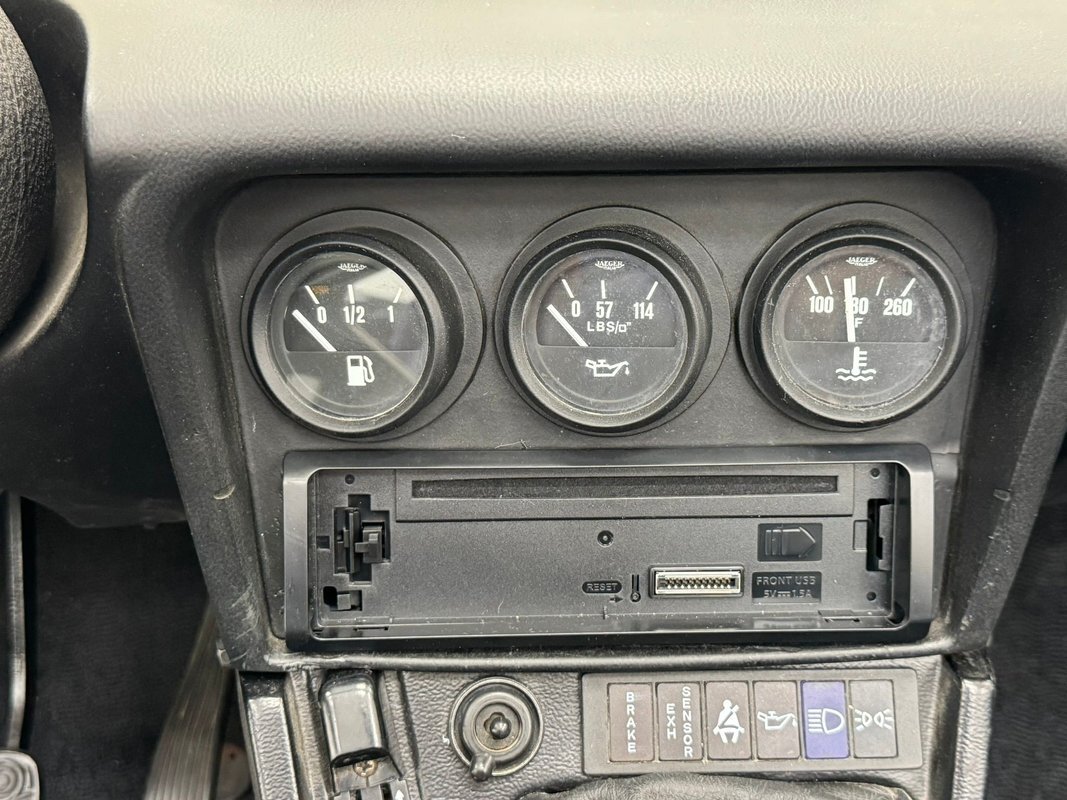 Black vinyl adorns the door panels and shows as nearly new. Dressing these panels up are 3d door pulls/armrests with silver inserts, a small map pocket, and shiny chrome actuators. Black carpet floods the floor and is in good condition and it supports a pair of black leather clad buckets with puffy tuck and roll inserts and smooth black bolsters. There is some slight age wrinkling of the leather noted on both seats, but the seams and piping remain intact and in good condition. A short center console has the cigar lights and ash receptacle, power window controls, and a wood knob topped gearshift that is mounted ergonomically in the vertical rising portion, as opposed to between the seats on the floor. Wood surrounds a beautiful steering wheel and this beauty fronts the deeply inset duo of gauges that appear somewhat like the large end of binoculars. Dash central is holding a trio of supporting auxiliary gauges along with a row of warning lights and an aftermarket AM/FM/CD radio.