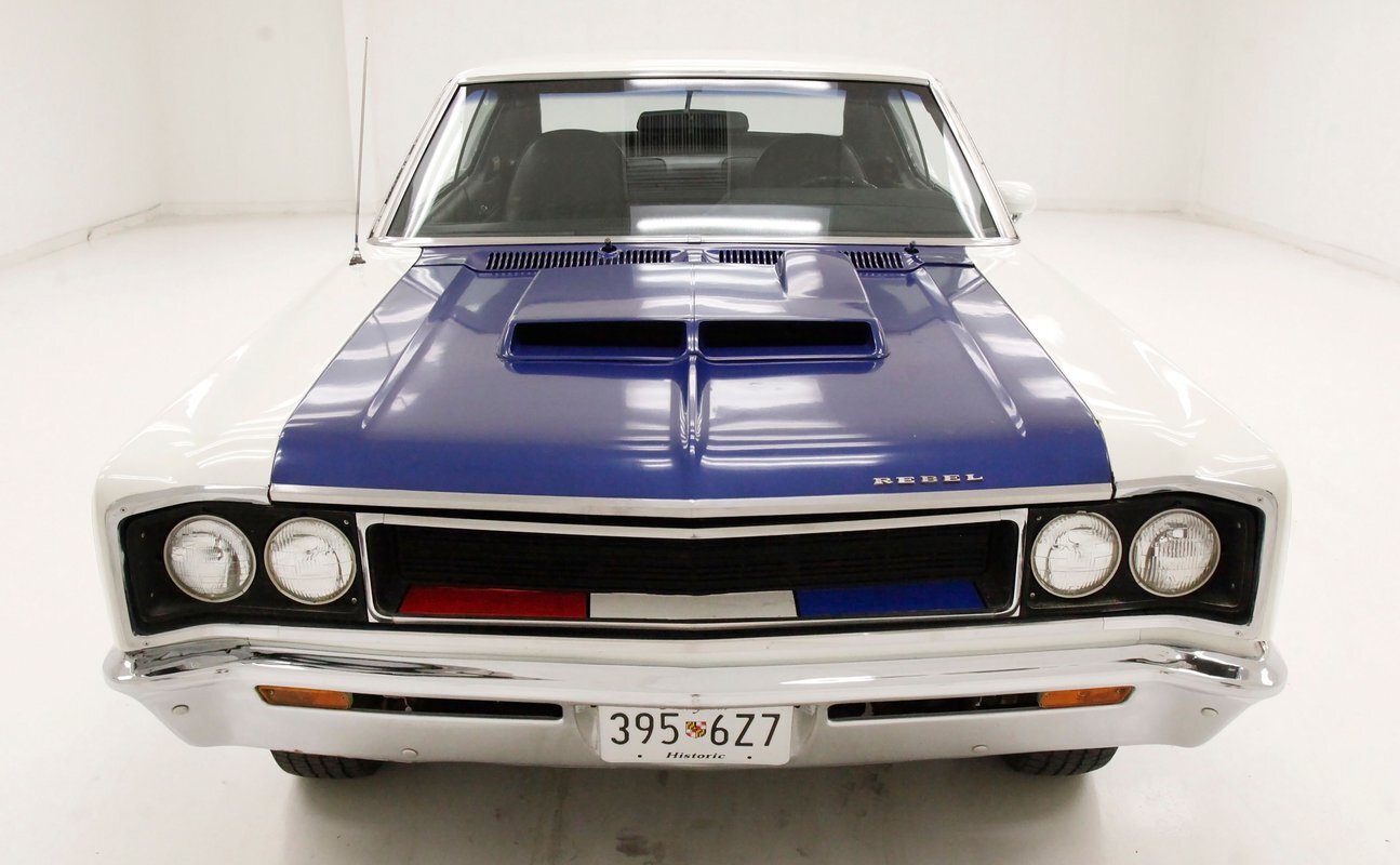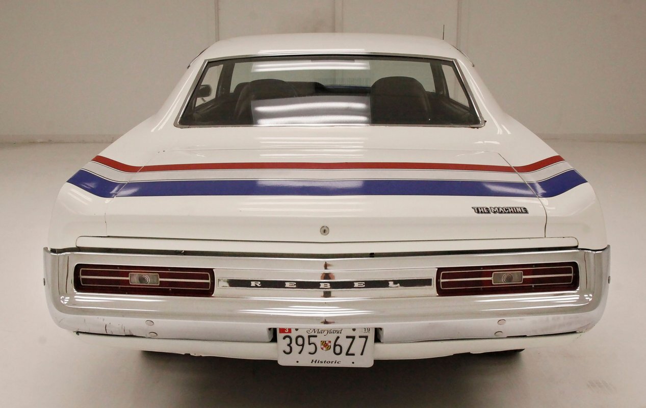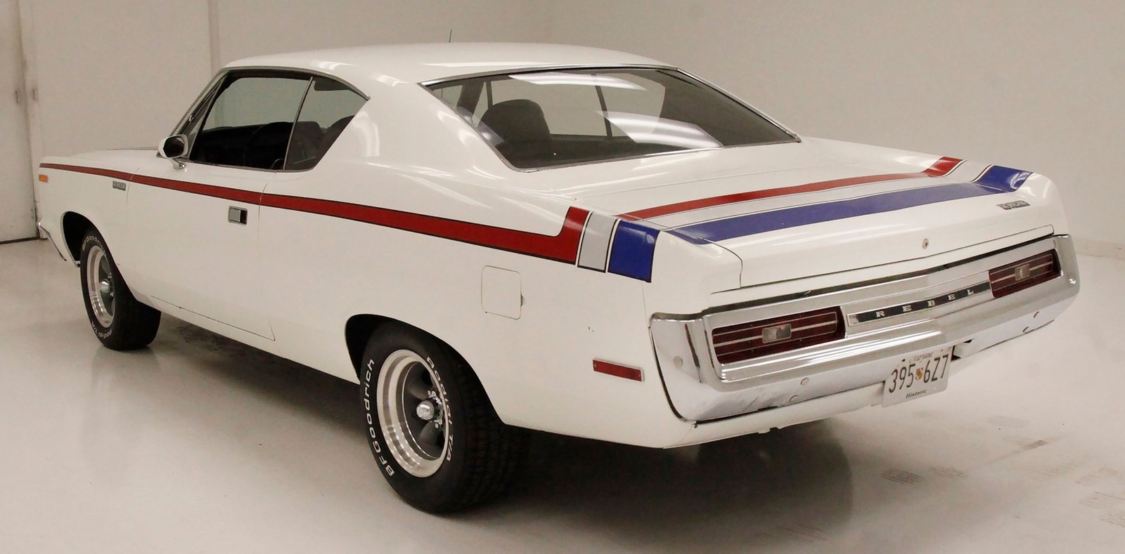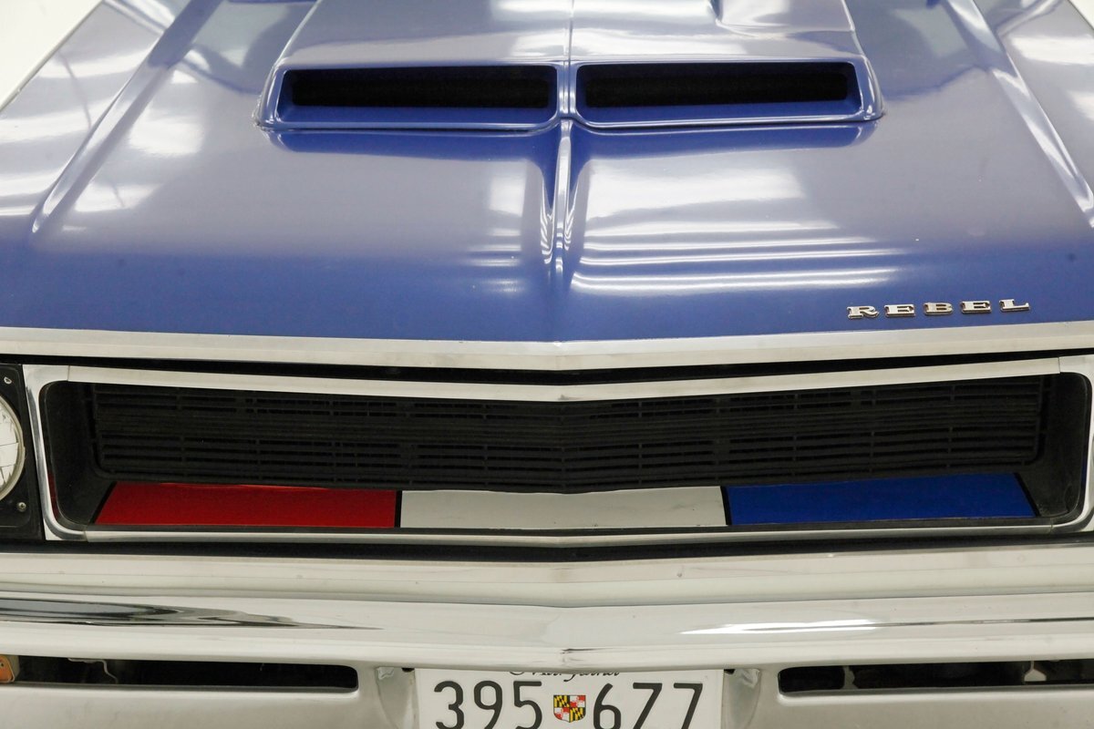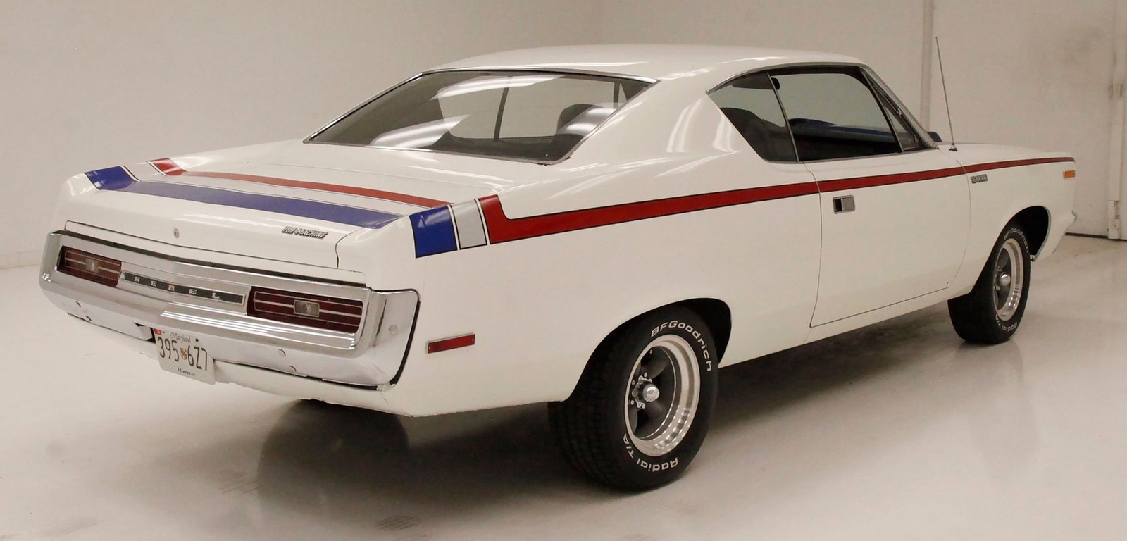 Square and rectangle design abound on this Dodge Dart-esque styled car, all bathed in a color change from dark blue to the iconic Frost White with red and blue accenting. A dual scooped hood and open grille makes this dual headlights car menacing especially with its high muscle car stance on this American Racing Torque Thrust wheels wrapped by raised white letter BFG radial T/A's. Just a classic look with the red ever widening side stripe and the dual scooped blue painted hood. A side view shows the money shot as it has a beautifully sloping rear glass and the trunk deck has the blue and red stripes looking very racy. Also, the rear bumper which is nice and shiny, has inset tail lights and a R E B E L badge in the center. Early aero door handles are inset, and the car has plenty of muscle for the look. A few faults are noted in the paint in the form of bubbles, some scratches and some minor rust areas all smaller than a penny size. There are also some chip offs near the door gaps and fender edges. All very snazzy with the stripes on the trunk and side striping as well as a red white and blue grille lower panel leading the way. Can you say early Javelin?