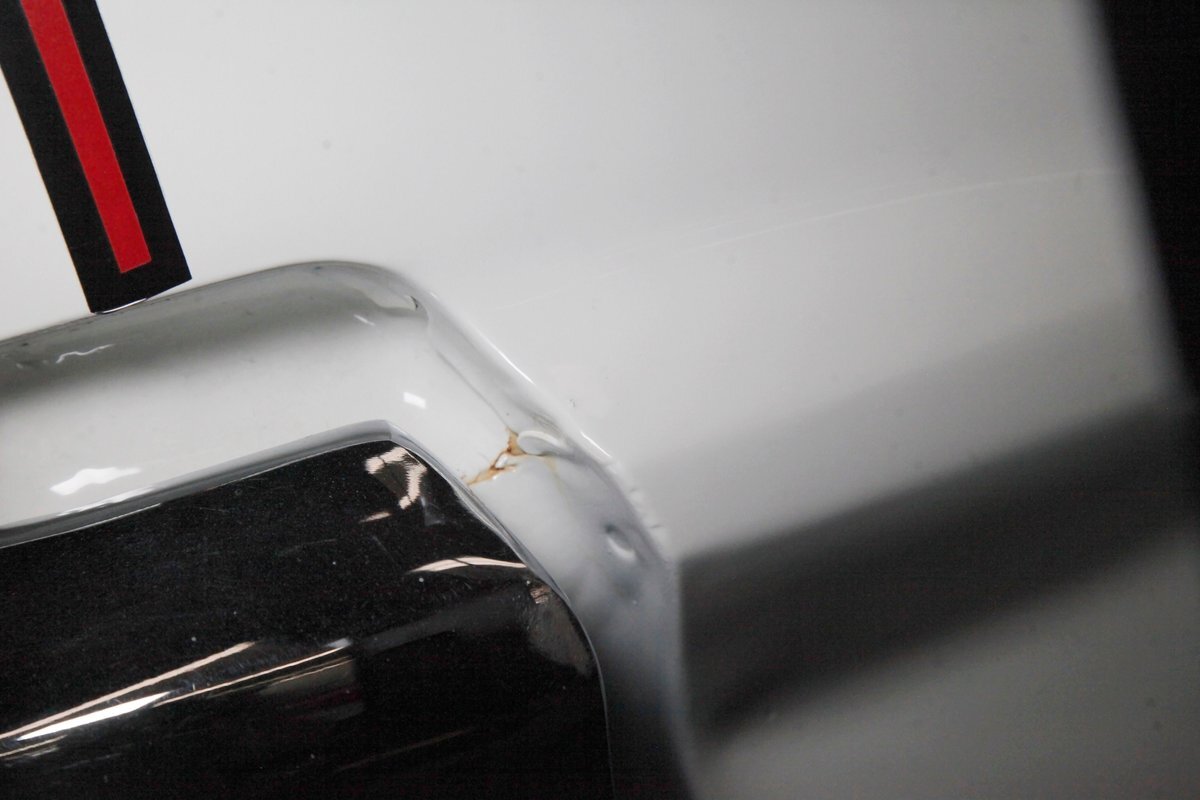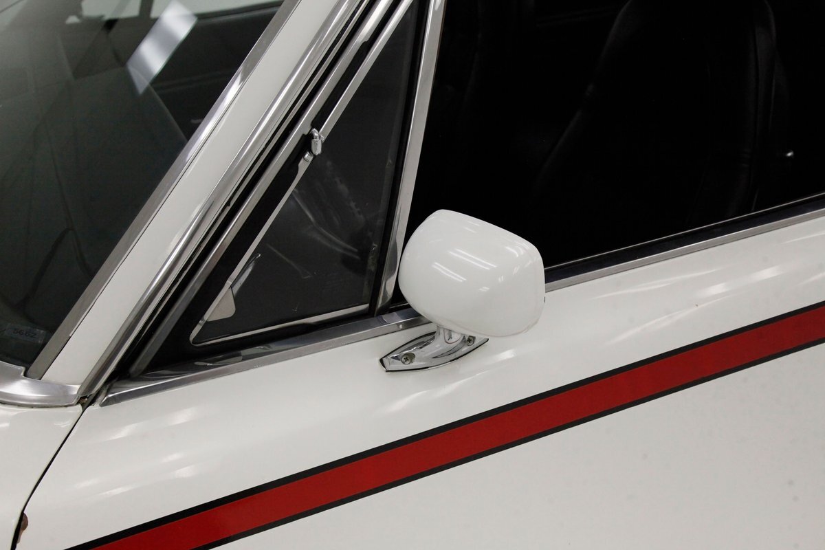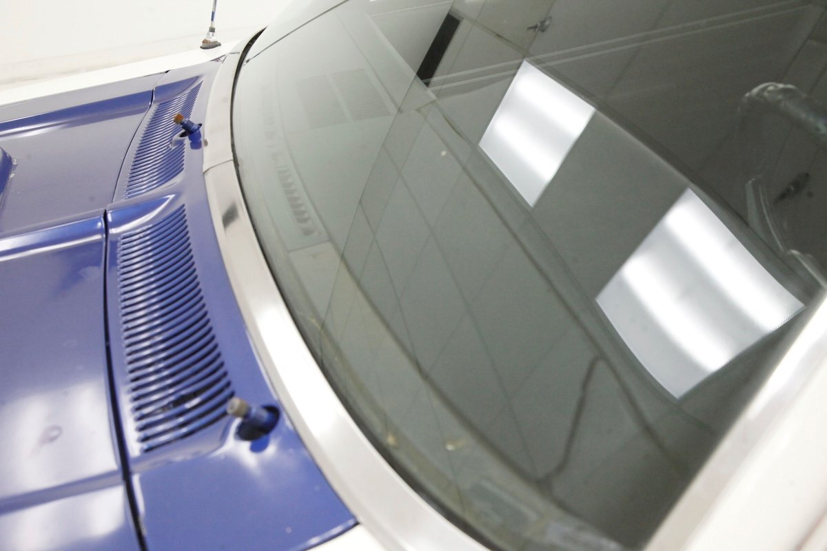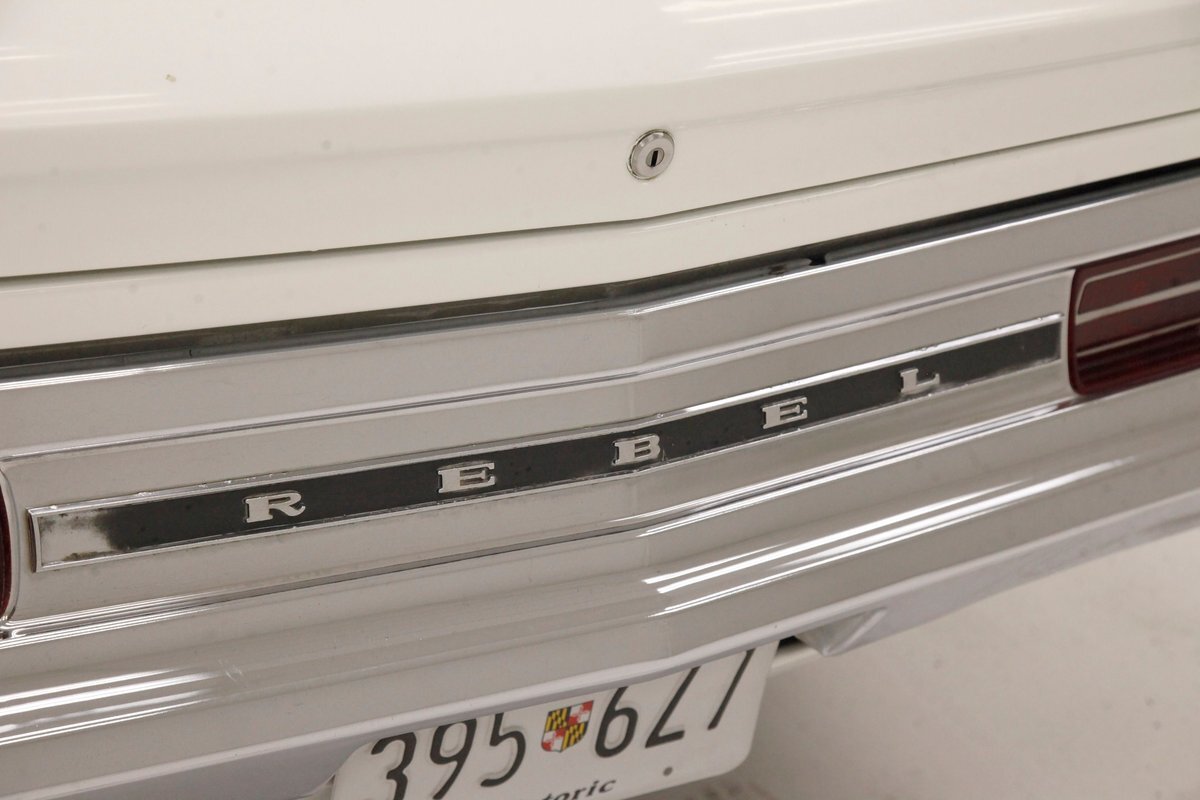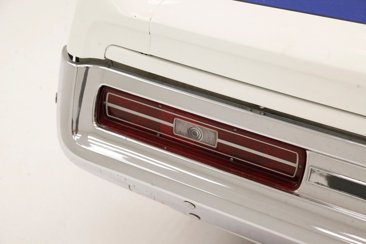 Square and rectangle design abound on this Dodge Dart-esque styled car, all bathed in a color change from dark blue to the iconic Frost White with red and blue accenting. A dual scooped hood and open grille makes this dual headlights car menacing especially with its high muscle car stance on this American Racing Torque Thrust wheels wrapped by raised white letter BFG radial T/A's. Just a classic look with the red ever widening side stripe and the dual scooped blue painted hood. A side view shows the money shot as it has a beautifully sloping rear glass and the trunk deck has the blue and red stripes looking very racy. Also, the rear bumper which is nice and shiny, has inset tail lights and a R E B E L badge in the center. Early aero door handles are inset, and the car has plenty of muscle for the look. A few faults are noted in the paint in the form of bubbles, some scratches and some minor rust areas all smaller than a penny size. There are also some chip offs near the door gaps and fender edges. All very snazzy with the stripes on the trunk and side striping as well as a red white and blue grille lower panel leading the way. Can you say early Javelin?