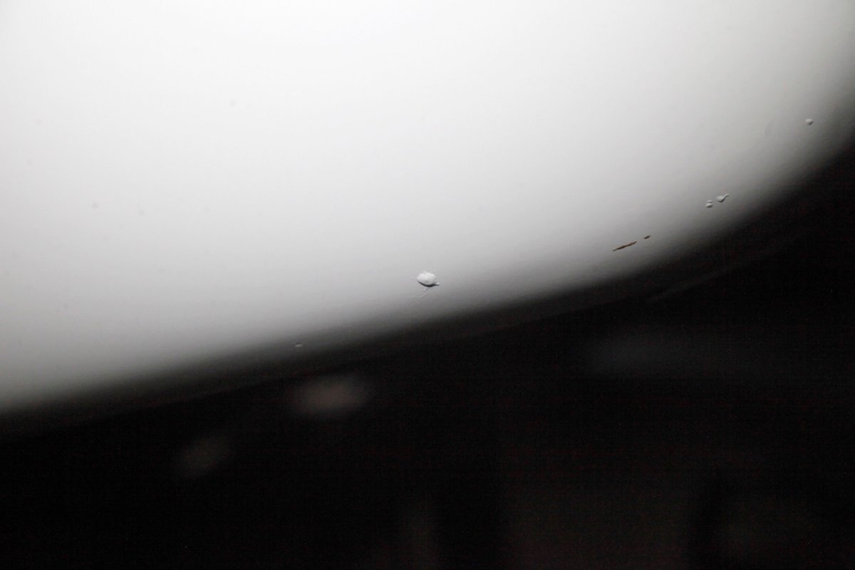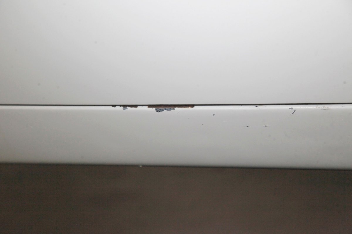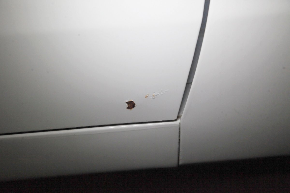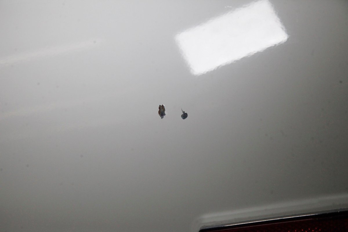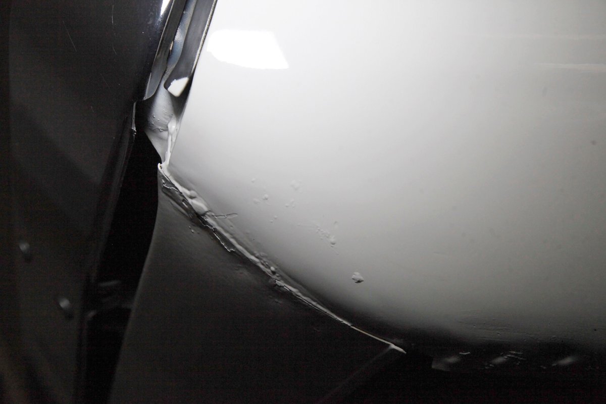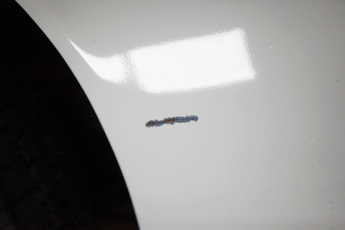 Square and rectangle design abound on this Dodge Dart-esque styled car, all bathed in a color change from dark blue to the iconic Frost White with red and blue accenting. A dual scooped hood and open grille makes this dual headlights car menacing especially with its high muscle car stance on this American Racing Torque Thrust wheels wrapped by raised white letter BFG radial T/A's. Just a classic look with the red ever widening side stripe and the dual scooped blue painted hood. A side view shows the money shot as it has a beautifully sloping rear glass and the trunk deck has the blue and red stripes looking very racy. Also, the rear bumper which is nice and shiny, has inset tail lights and a R E B E L badge in the center. Early aero door handles are inset, and the car has plenty of muscle for the look. A few faults are noted in the paint in the form of bubbles, some scratches and some minor rust areas all smaller than a penny size. There are also some chip offs near the door gaps and fender edges. All very snazzy with the stripes on the trunk and side striping as well as a red white and blue grille lower panel leading the way. Can you say early Javelin?