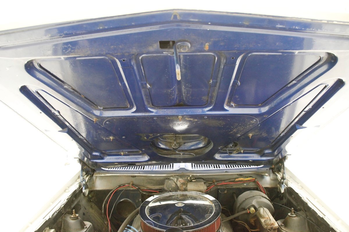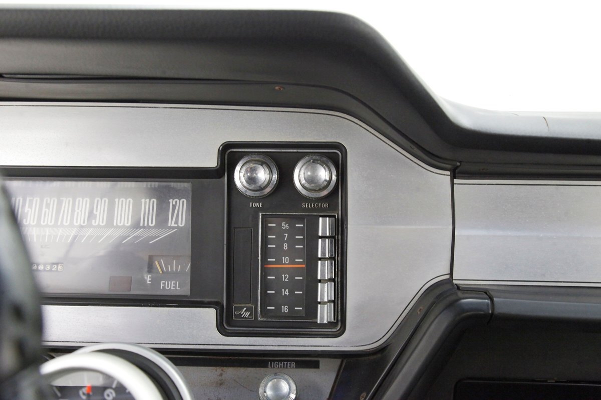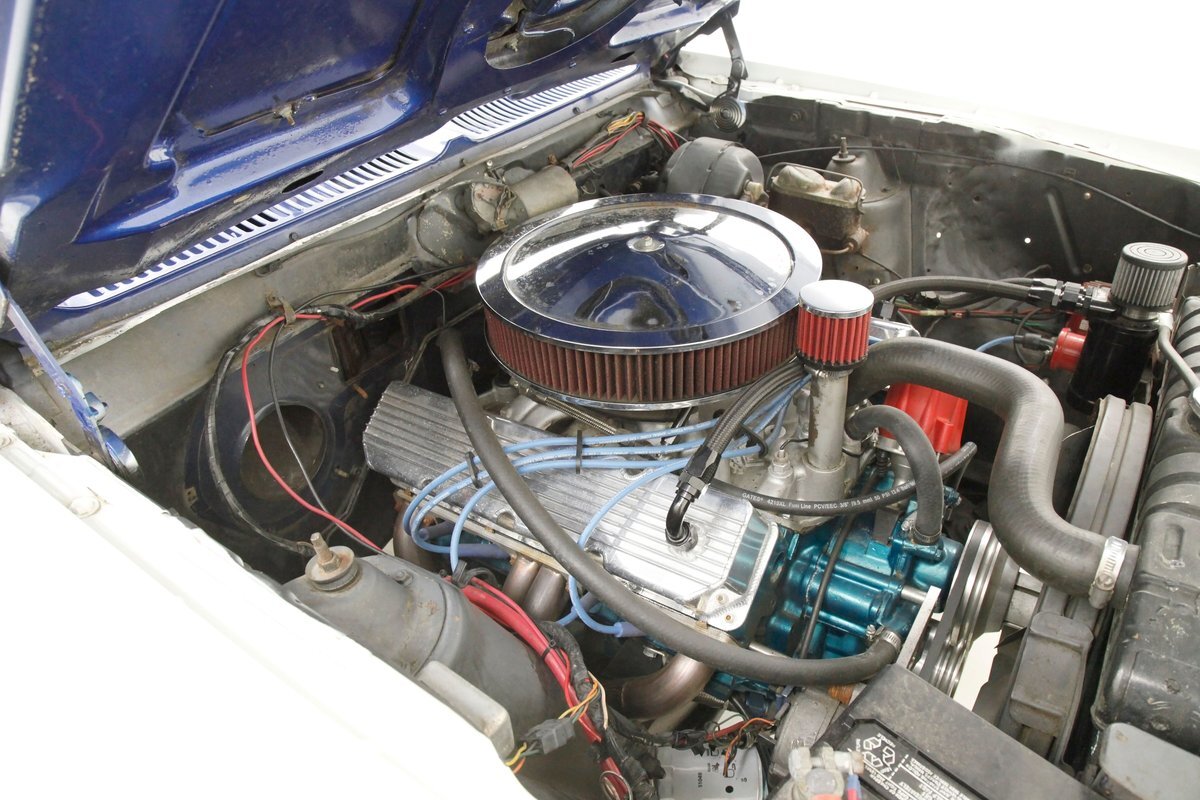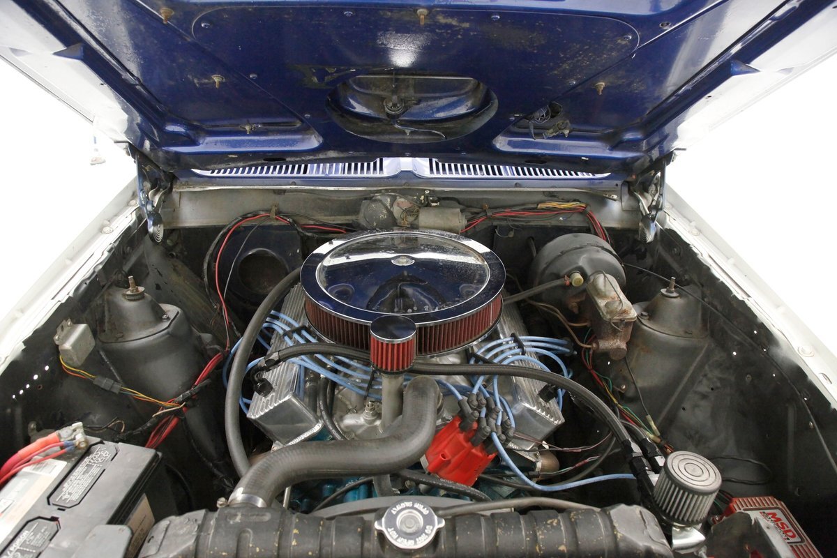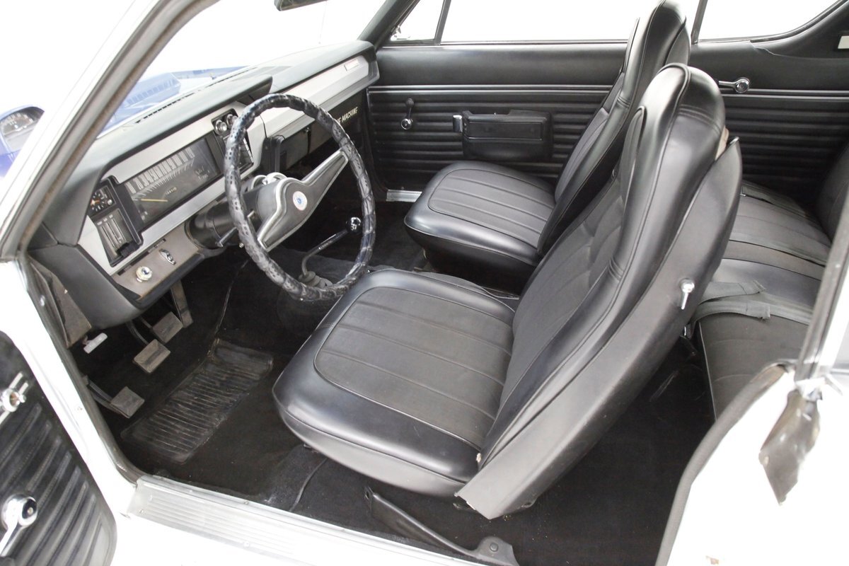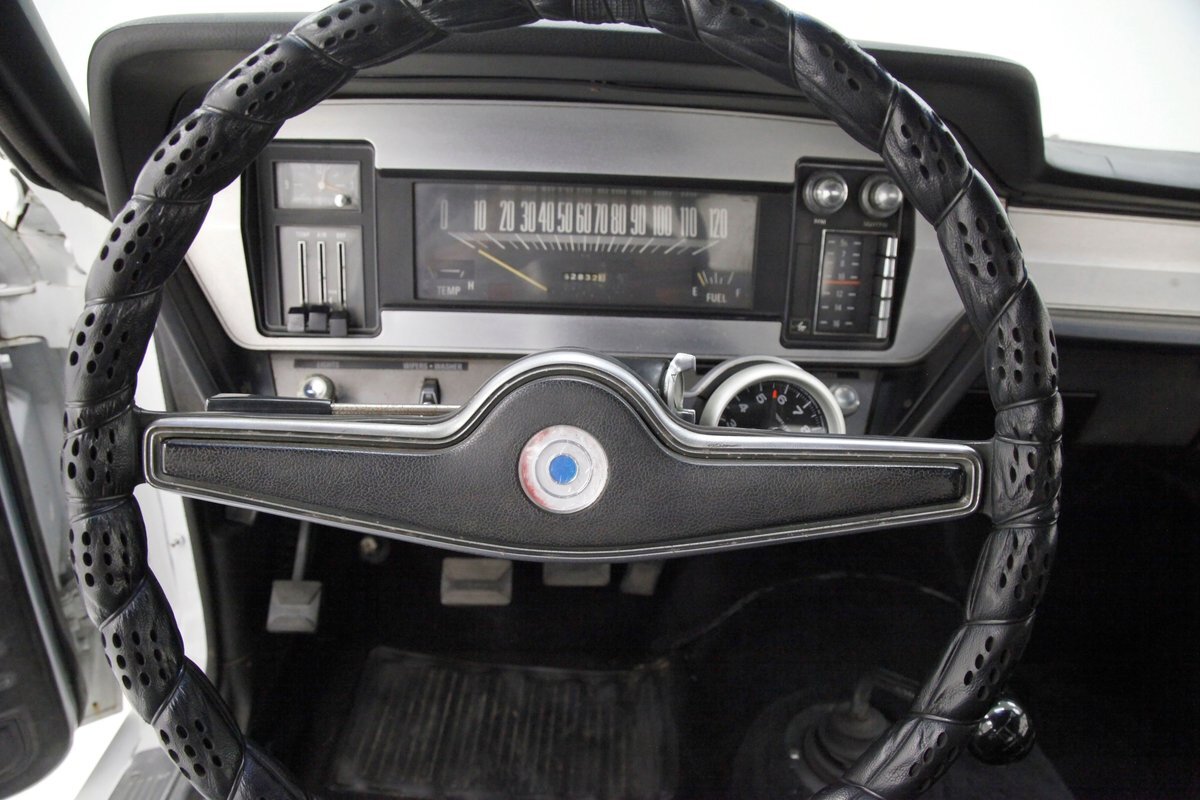 Under the hood we see more patriotic colors with the mill in its rebuilt 390 cubes form with cast ribbed valve coverings, blue spark plug wiring, and chromed open sided air cleaner with a red filter. The block is painted traditional AMC blue and there is a red distributor cap, so not all keeps with the theme. A slight patina overall for the bay black and the mill has a single 4-barrel carb perched atop an aluminum intake manifold. For those in the know, this is most likely the original block as it carries the 3195529 casting number that denoted a 1970 390ci V8 with 1/2" head bolts. A T10 4-speed manual transmission on back with a 3.54 rear axle to spin the rear tires. Headers and a Flowmaster exhaust are on for the big exhale.
