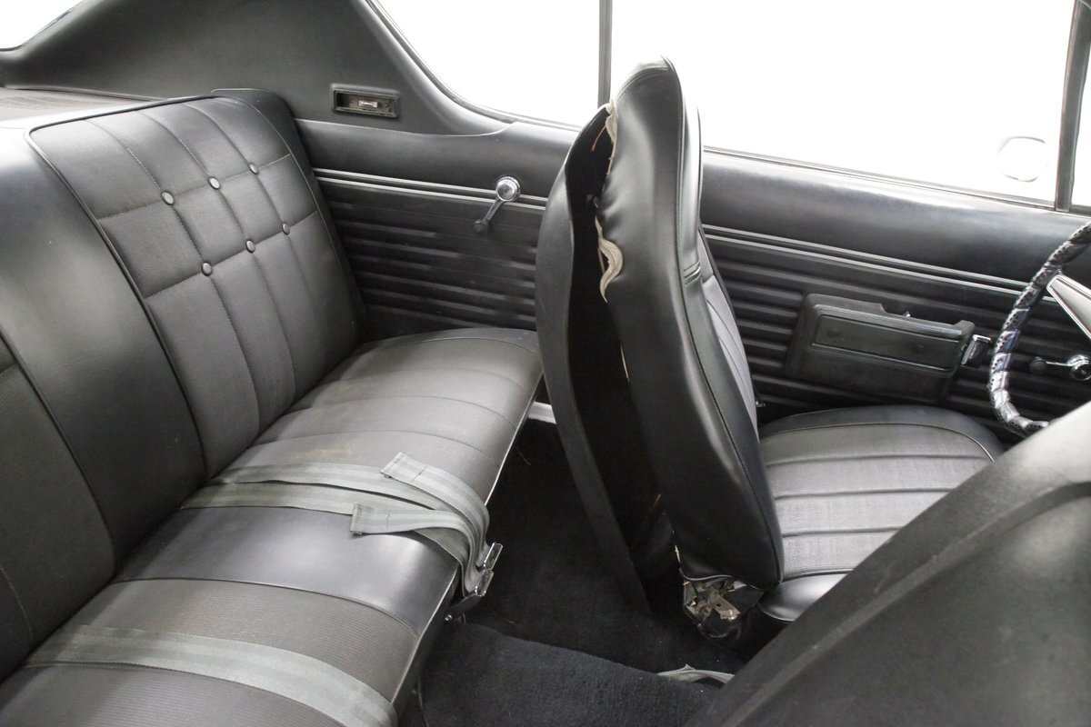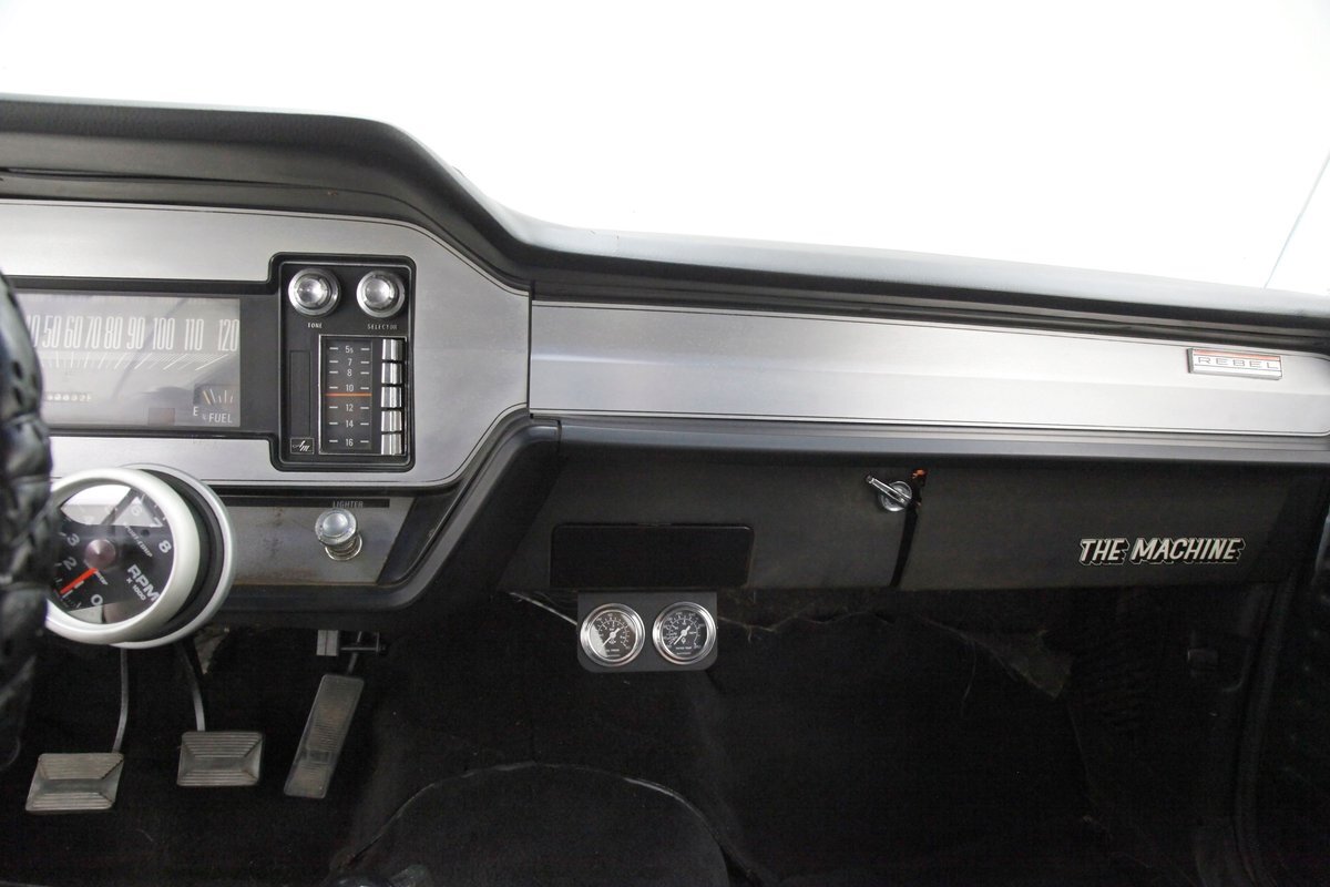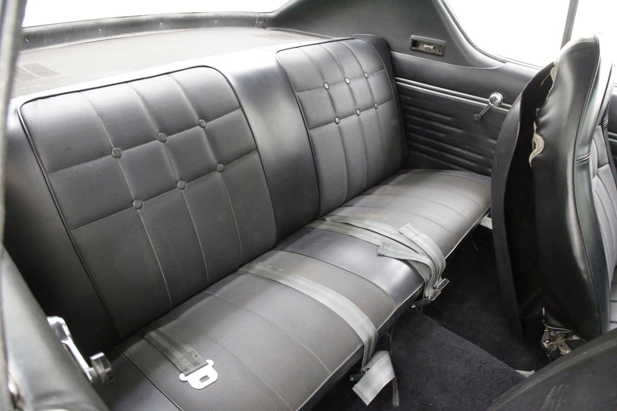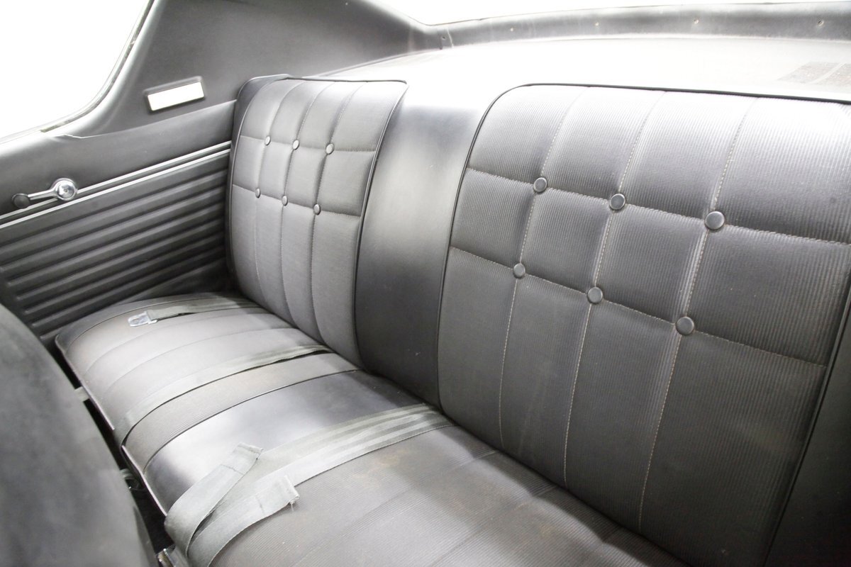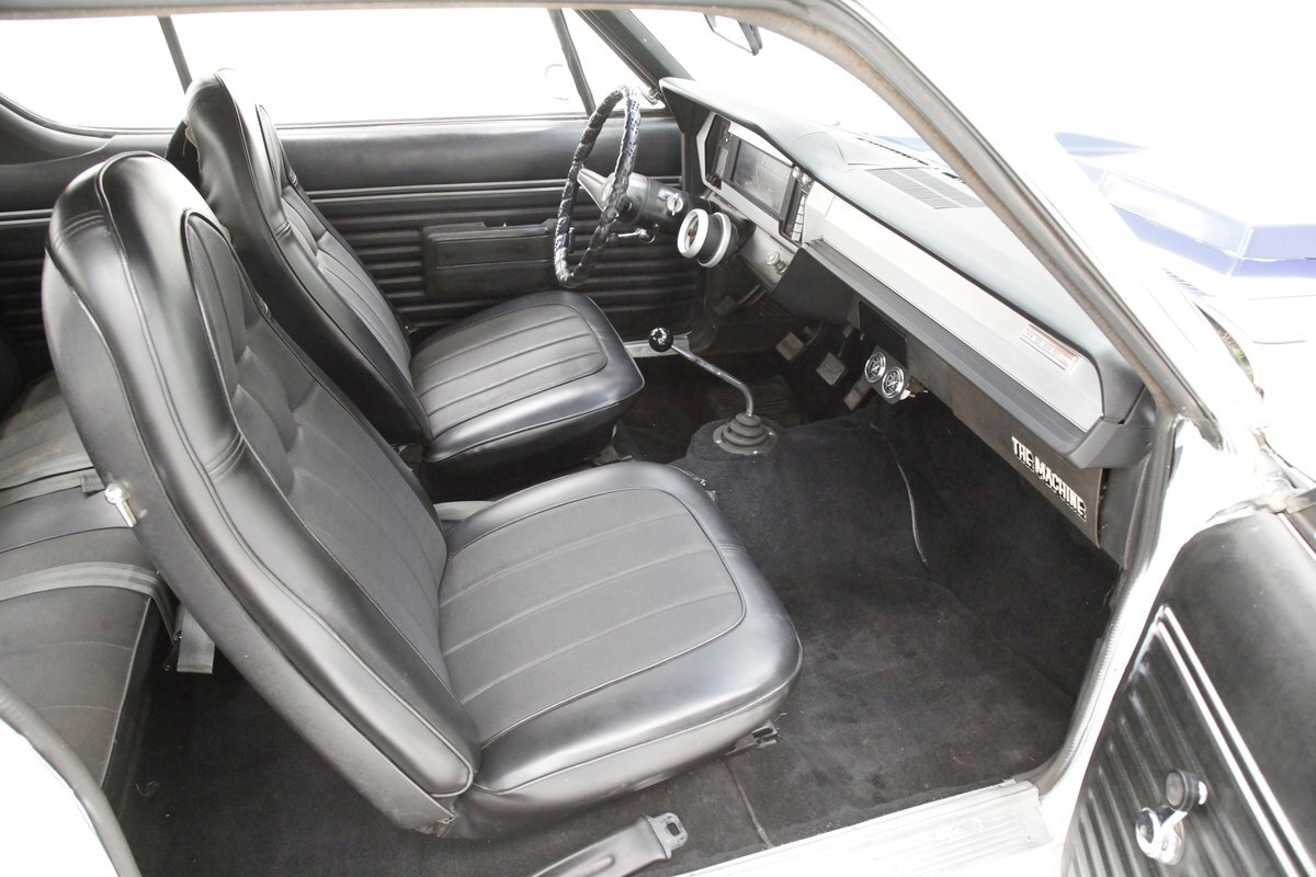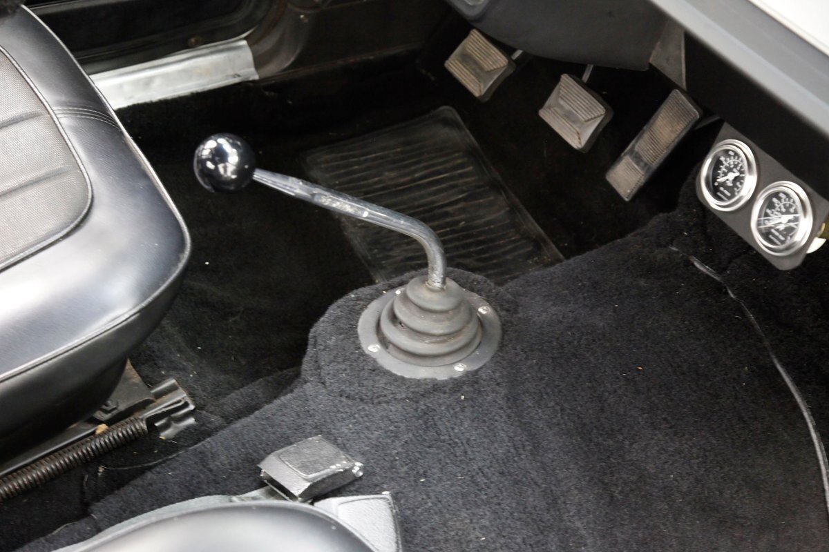 A swing of the black vinyl tuck and roll horizontal paneled doors and we see some nicely preserved handles and cranks as well as an armrest with deep pockets. Black carpeting abounds in the interior and on it are sleek high back buckets with black vinyl bolsters and vented charcoal inserted knitted vinyl material which is buttoned and has wide tucks and rolls. These buckets have integrated headrests and in black is a rear buttoned bench in the same materials looking nearly perfect and rarely used. More square and rectangle for the dash in spades with the speedo, vertical radio and temp sliders on either side of said speedo. An aftermarket tachometer is strapped to the steering column and on its edges is a leatherette wrapped factory steering wheel with the bullseye center emblem. 2 more small sweep gauges are in dash central and these are black faced with chromed bezels. A glovebox has a large "The Machine" badge on it. A curved Hurst shifter is in the hump racing for the driver. Above is a nice black smooth vinyl headliner.