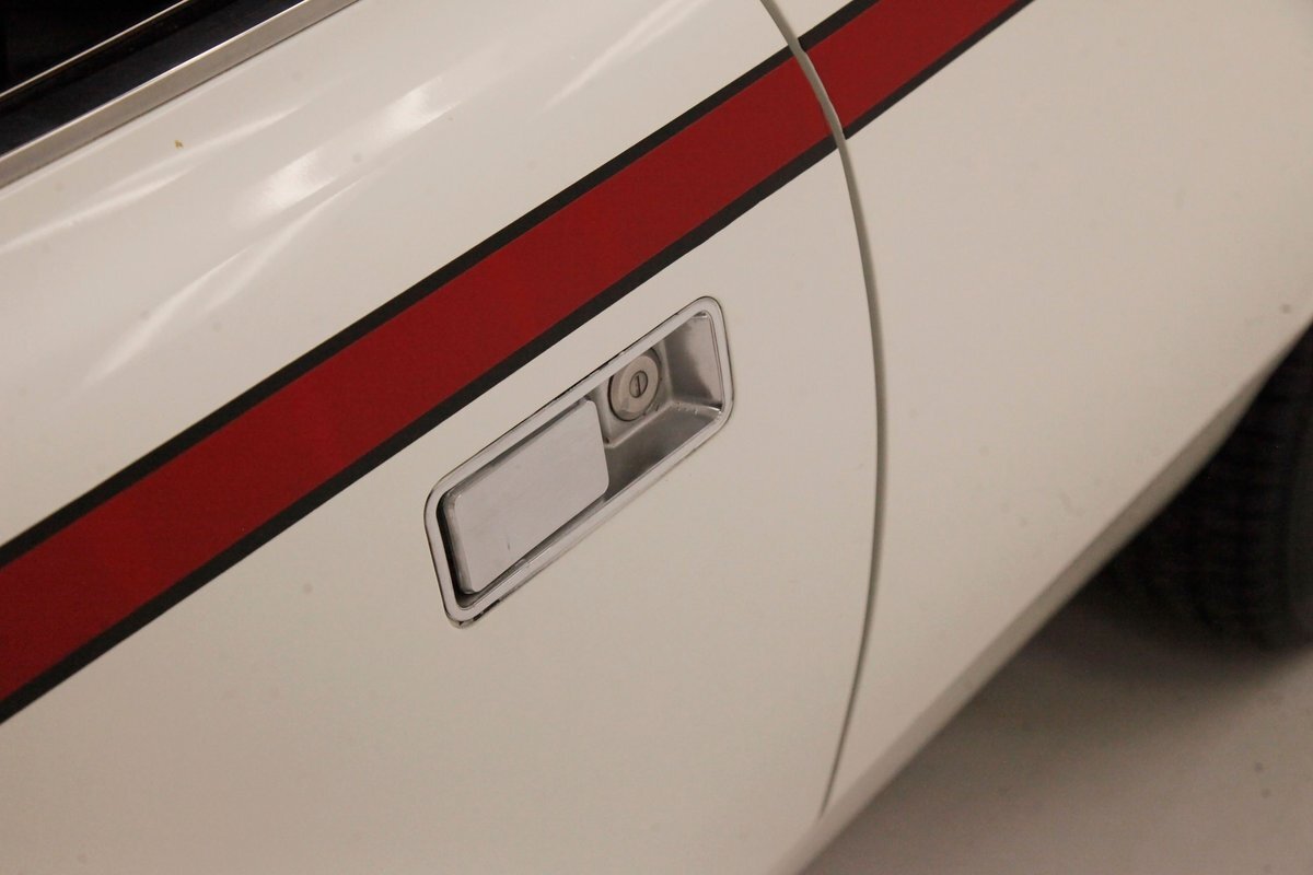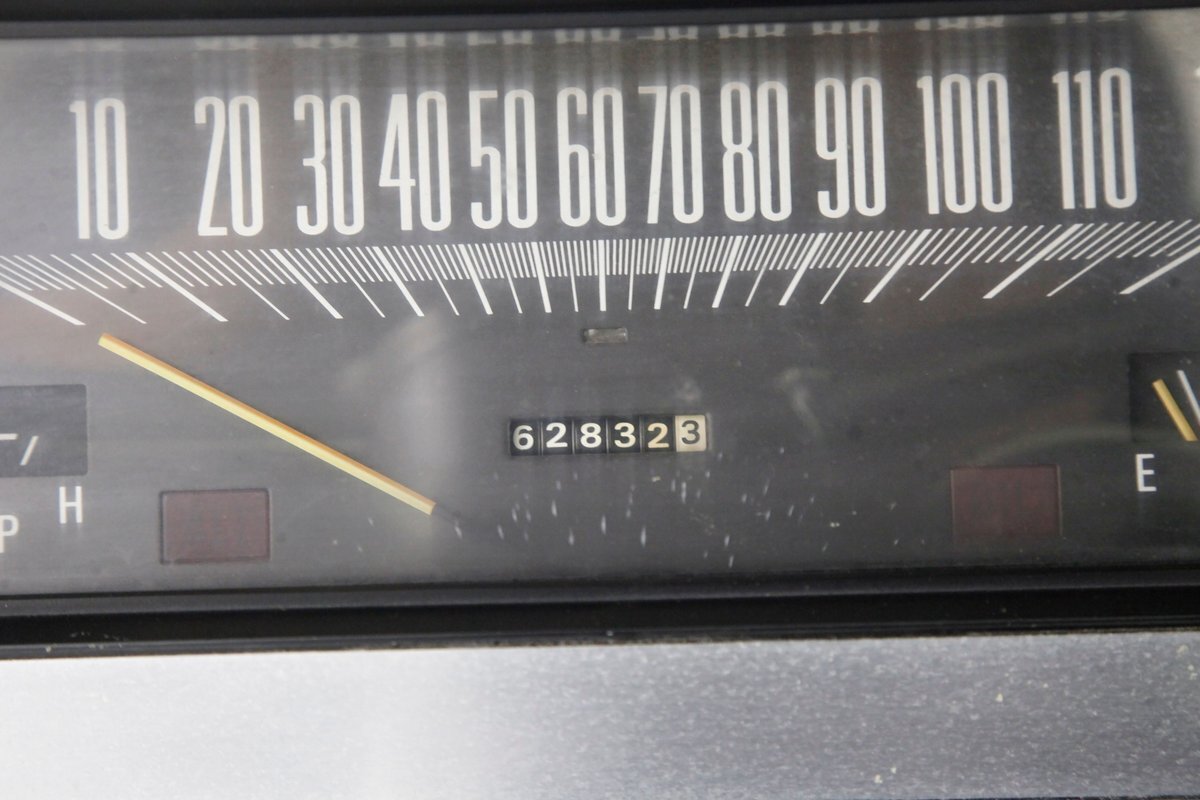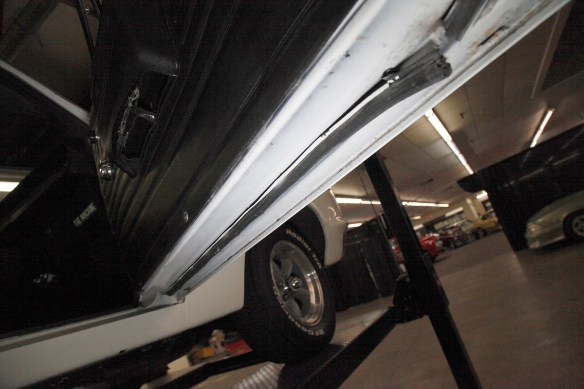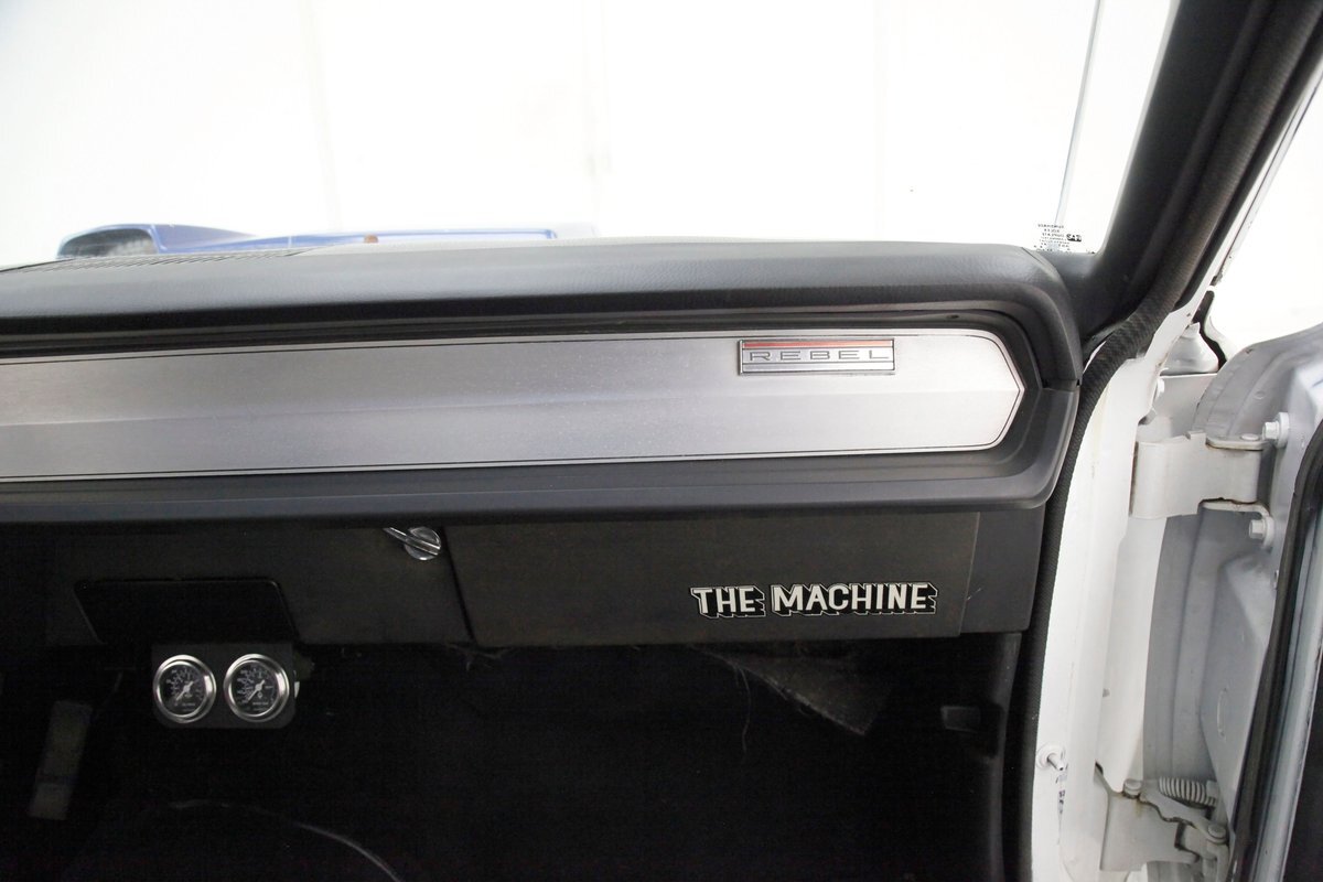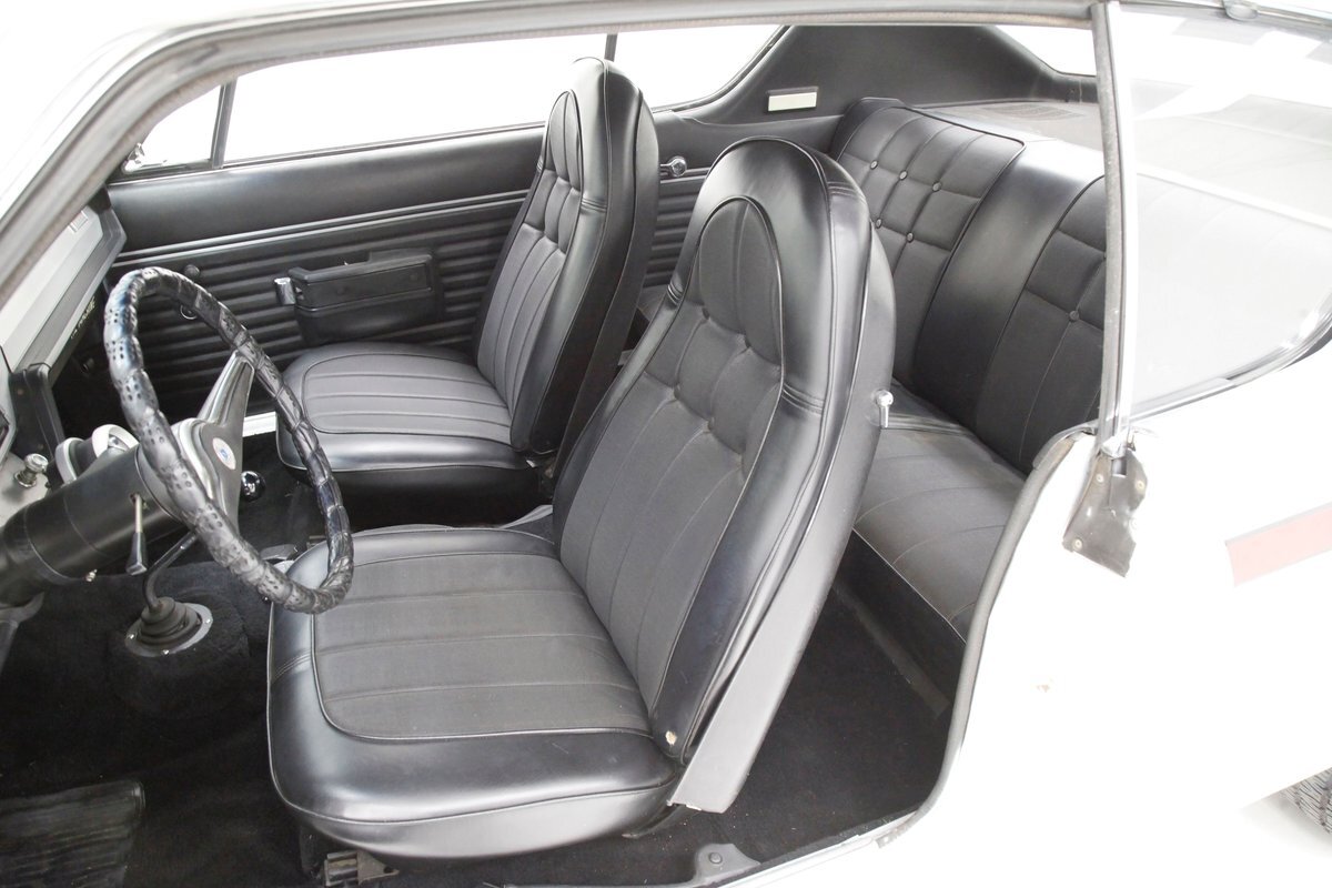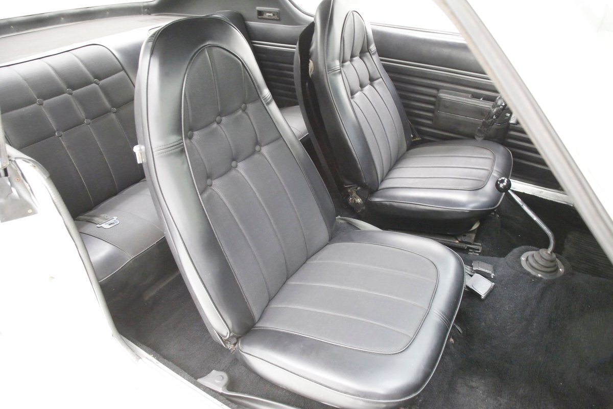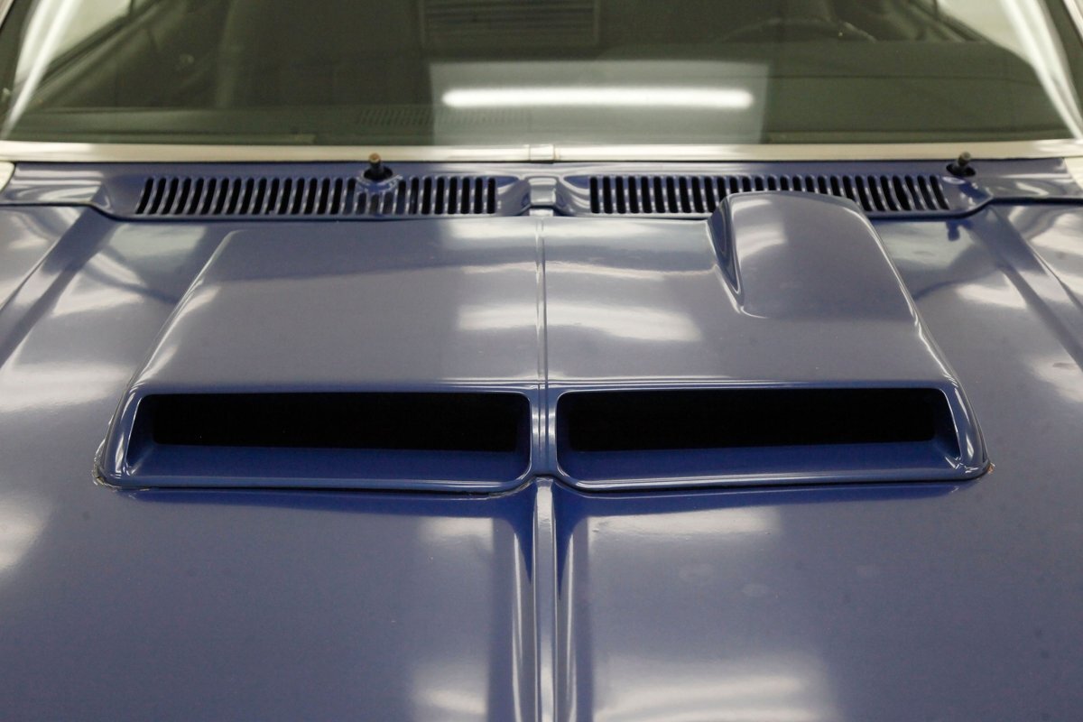 A swing of the black vinyl tuck and roll horizontal paneled doors and we see some nicely preserved handles and cranks as well as an armrest with deep pockets. Black carpeting abounds in the interior and on it are sleek high back buckets with black vinyl bolsters and vented charcoal inserted knitted vinyl material which is buttoned and has wide tucks and rolls. These buckets have integrated headrests and in black is a rear buttoned bench in the same materials looking nearly perfect and rarely used. More square and rectangle for the dash in spades with the speedo, vertical radio and temp sliders on either side of said speedo. An aftermarket tachometer is strapped to the steering column and on its edges is a leatherette wrapped factory steering wheel with the bullseye center emblem. 2 more small sweep gauges are in dash central and these are black faced with chromed bezels. A glovebox has a large "The Machine" badge on it. A curved Hurst shifter is in the hump racing for the driver. Above is a nice black smooth vinyl headliner.
