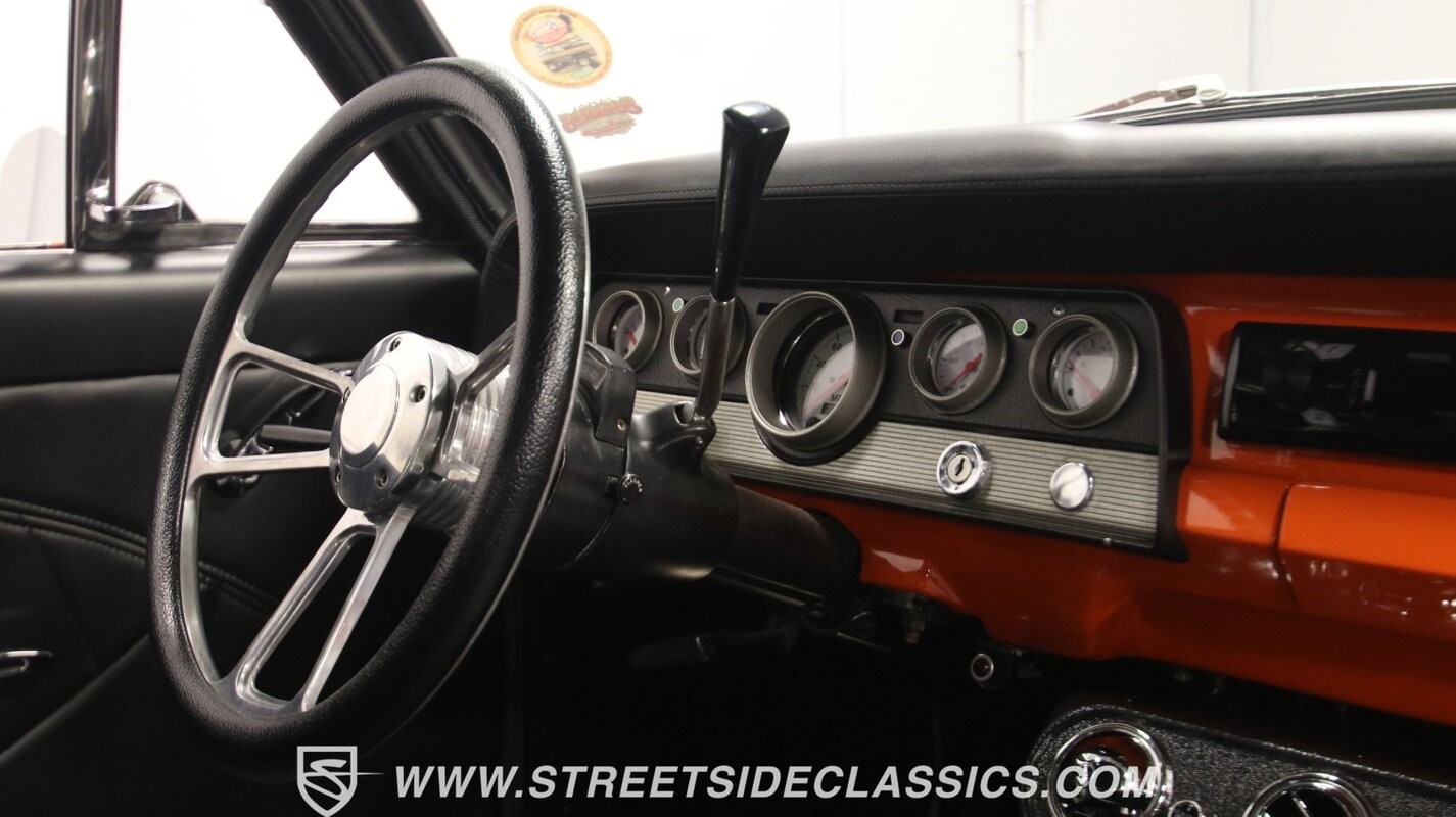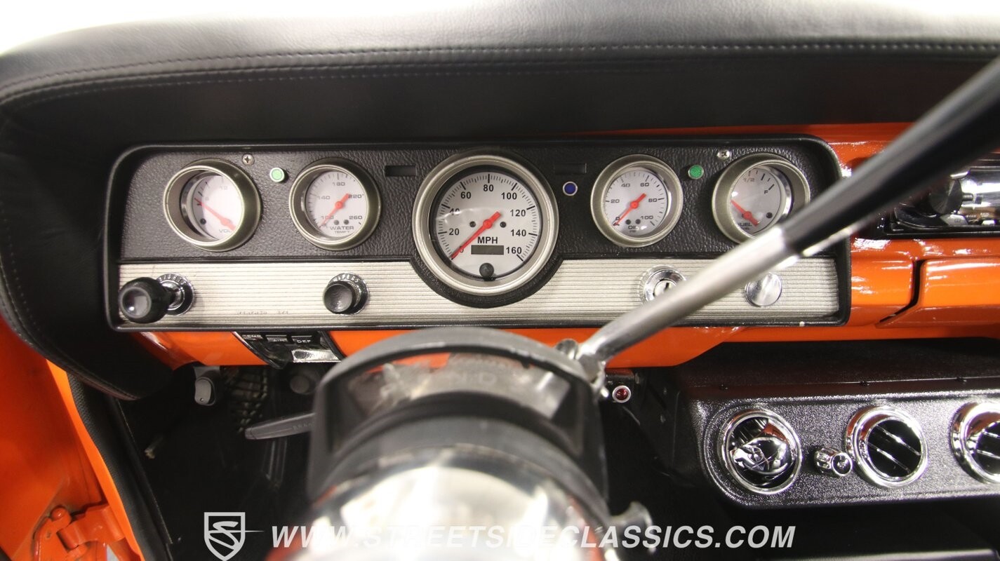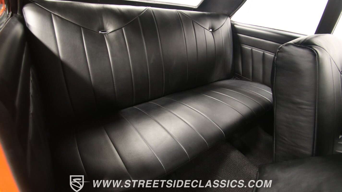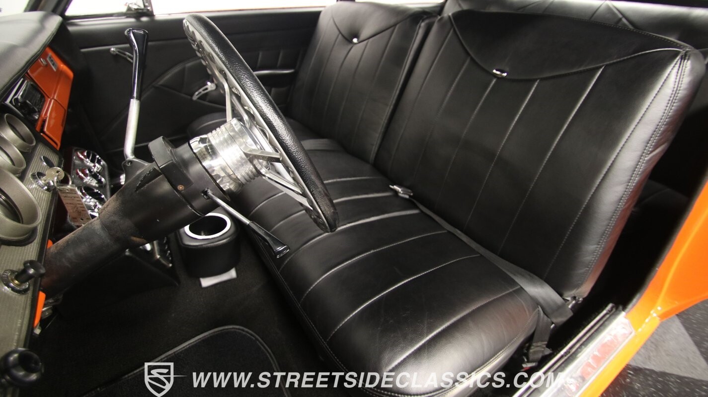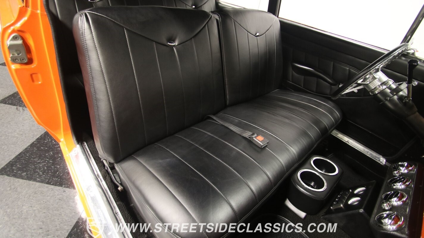 The interior is thoughtfully done where the color theme switches from the exterior to now give you plenty of black with just the right touches of bold orange. We love how the seats give you the classic split bench look but now it's deluxe custom upholstery done in supple leather. Plush carpeting, custom door panels, a smooth dash, and a custom foam headliner are all about making sure you remember a restomod means adding comfort. There's plenty of added luxury that also comes from upgrades like the cold-blowing air conditioning, cup holders, and an AM/FM stereo with USB and Bluetooth. There's even a custom consul with toggle switches for the air ride controls. Plus the sports steering wheel, billet pedals, and upgraded gauges signal that you'll love the driving experience.