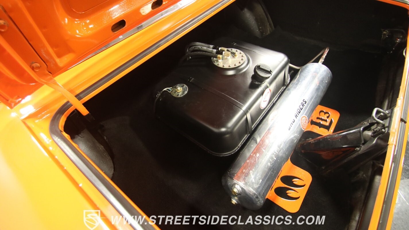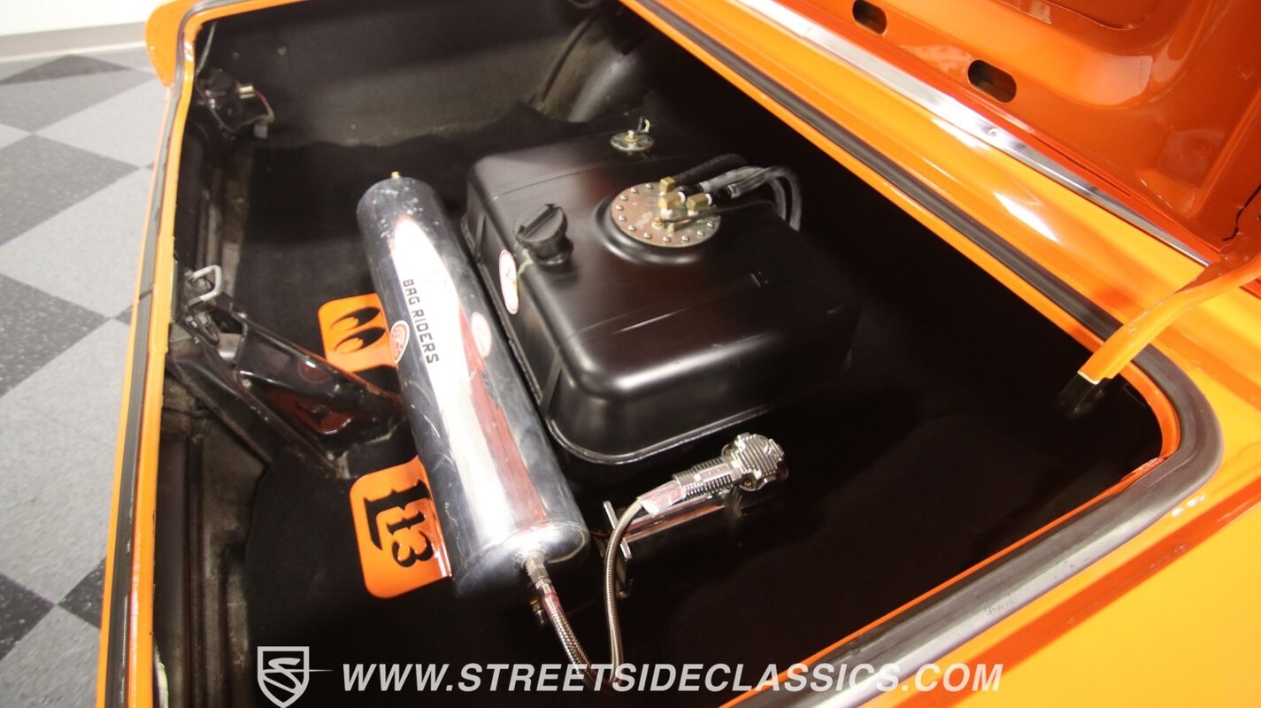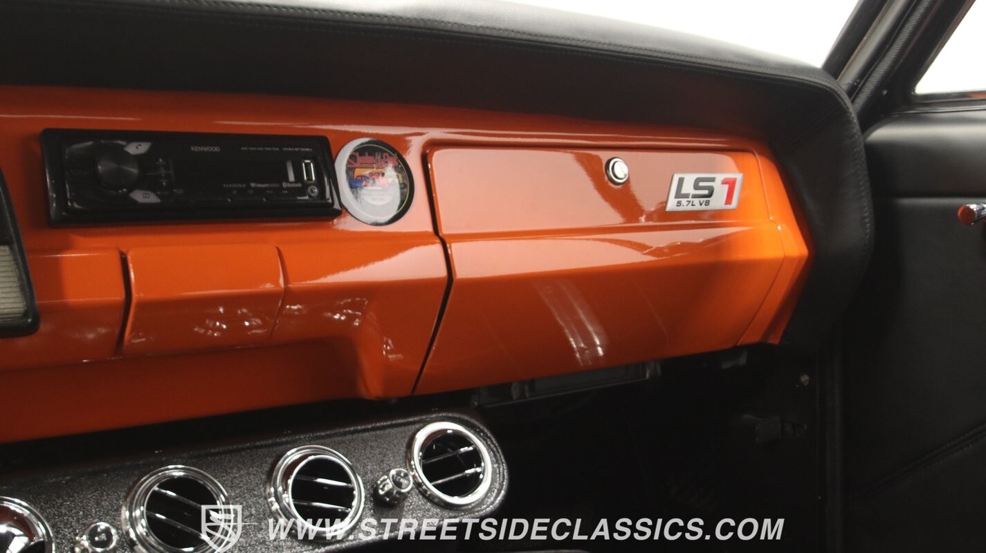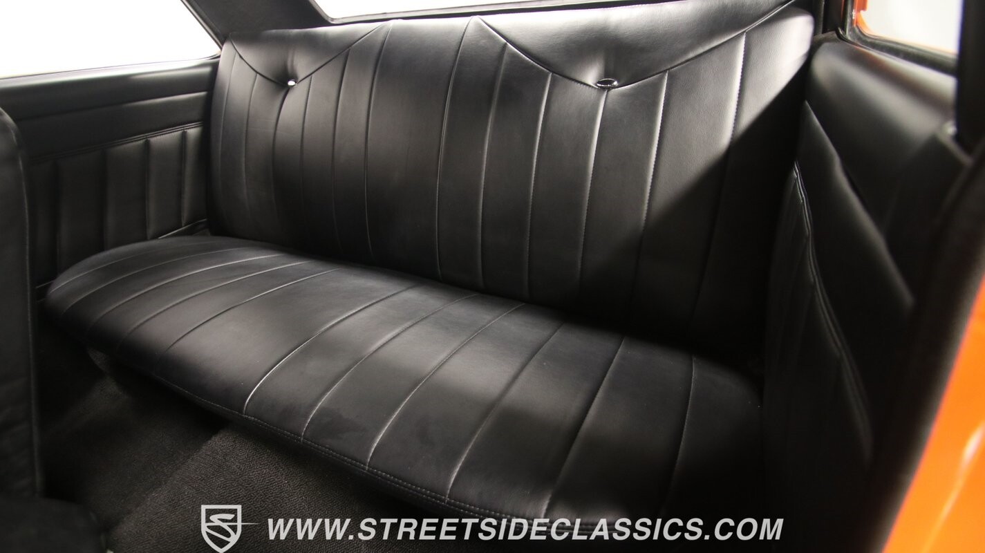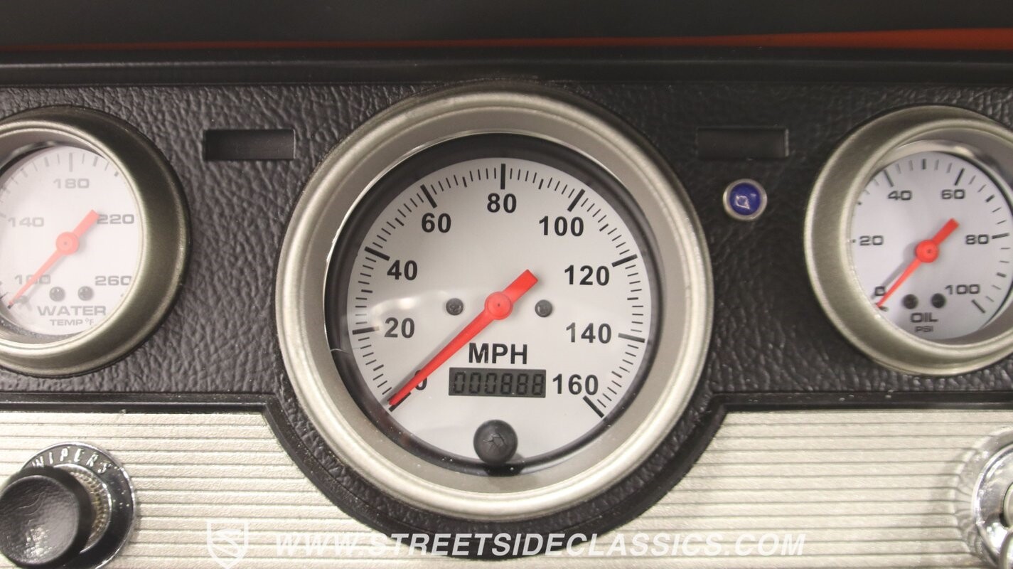 The interior is thoughtfully done where the color theme switches from the exterior to now give you plenty of black with just the right touches of bold orange. We love how the seats give you the classic split bench look but now it's deluxe custom upholstery done in supple leather. Plush carpeting, custom door panels, a smooth dash, and a custom foam headliner are all about making sure you remember a restomod means adding comfort. There's plenty of added luxury that also comes from upgrades like the cold-blowing air conditioning, cup holders, and an AM/FM stereo with USB and Bluetooth. There's even a custom consul with toggle switches for the air ride controls. Plus the sports steering wheel, billet pedals, and upgraded gauges signal that you'll love the driving experience.
