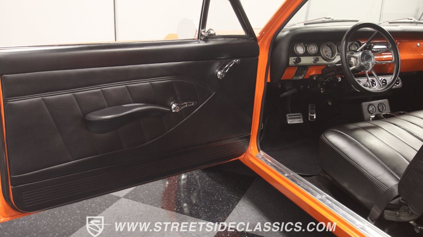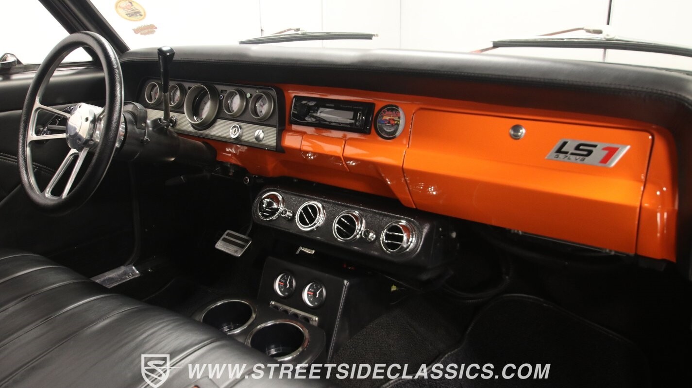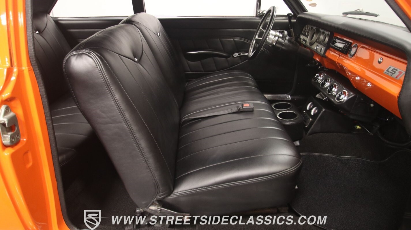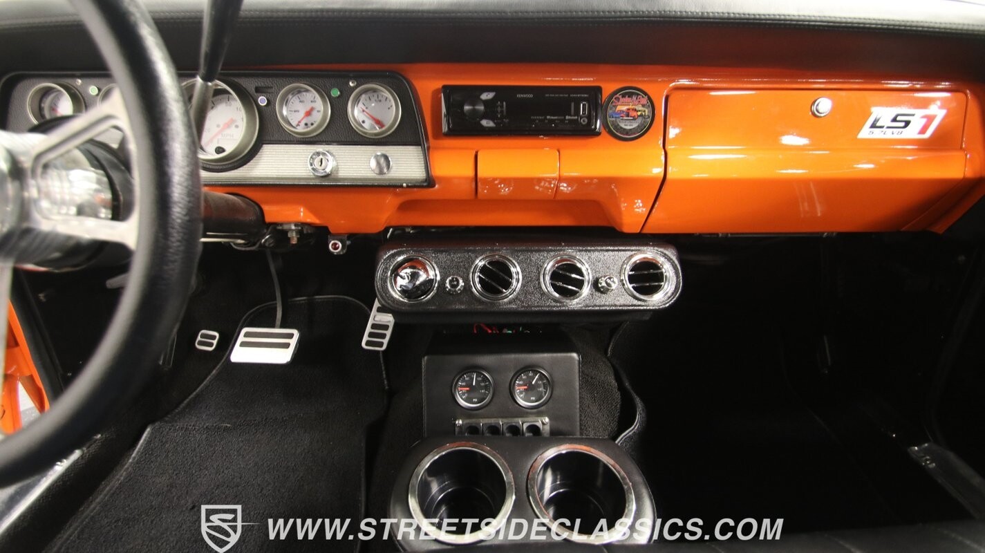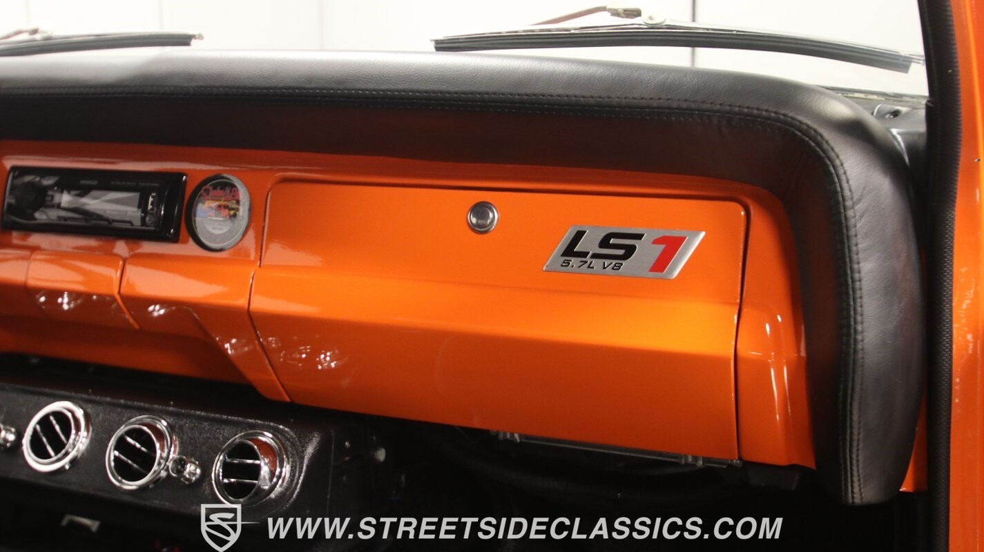 The interior is thoughtfully done where the color theme switches from the exterior to now give you plenty of black with just the right touches of bold orange. We love how the seats give you the classic split bench look but now it's deluxe custom upholstery done in supple leather. Plush carpeting, custom door panels, a smooth dash, and a custom foam headliner are all about making sure you remember a restomod means adding comfort. There's plenty of added luxury that also comes from upgrades like the cold-blowing air conditioning, cup holders, and an AM/FM stereo with USB and Bluetooth. There's even a custom consul with toggle switches for the air ride controls. Plus the sports steering wheel, billet pedals, and upgraded gauges signal that you'll love the driving experience.