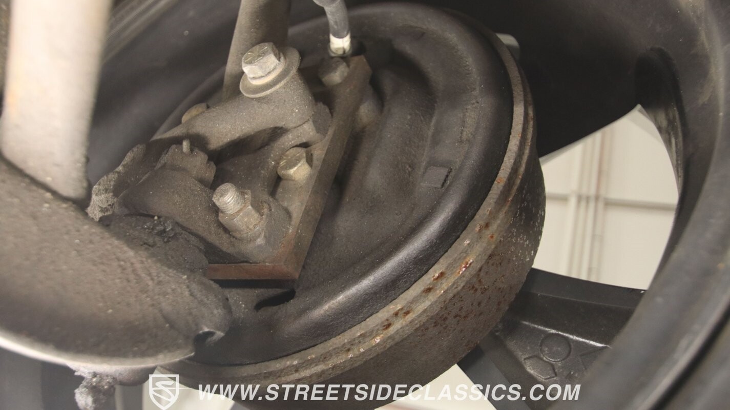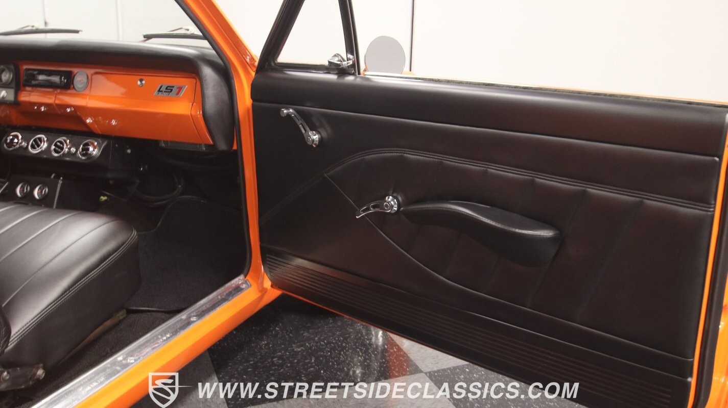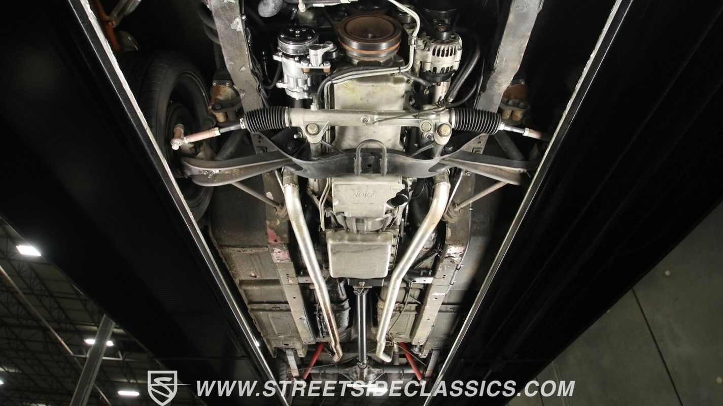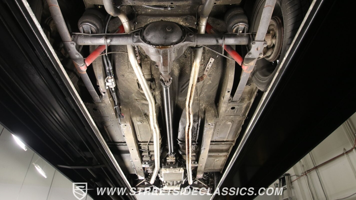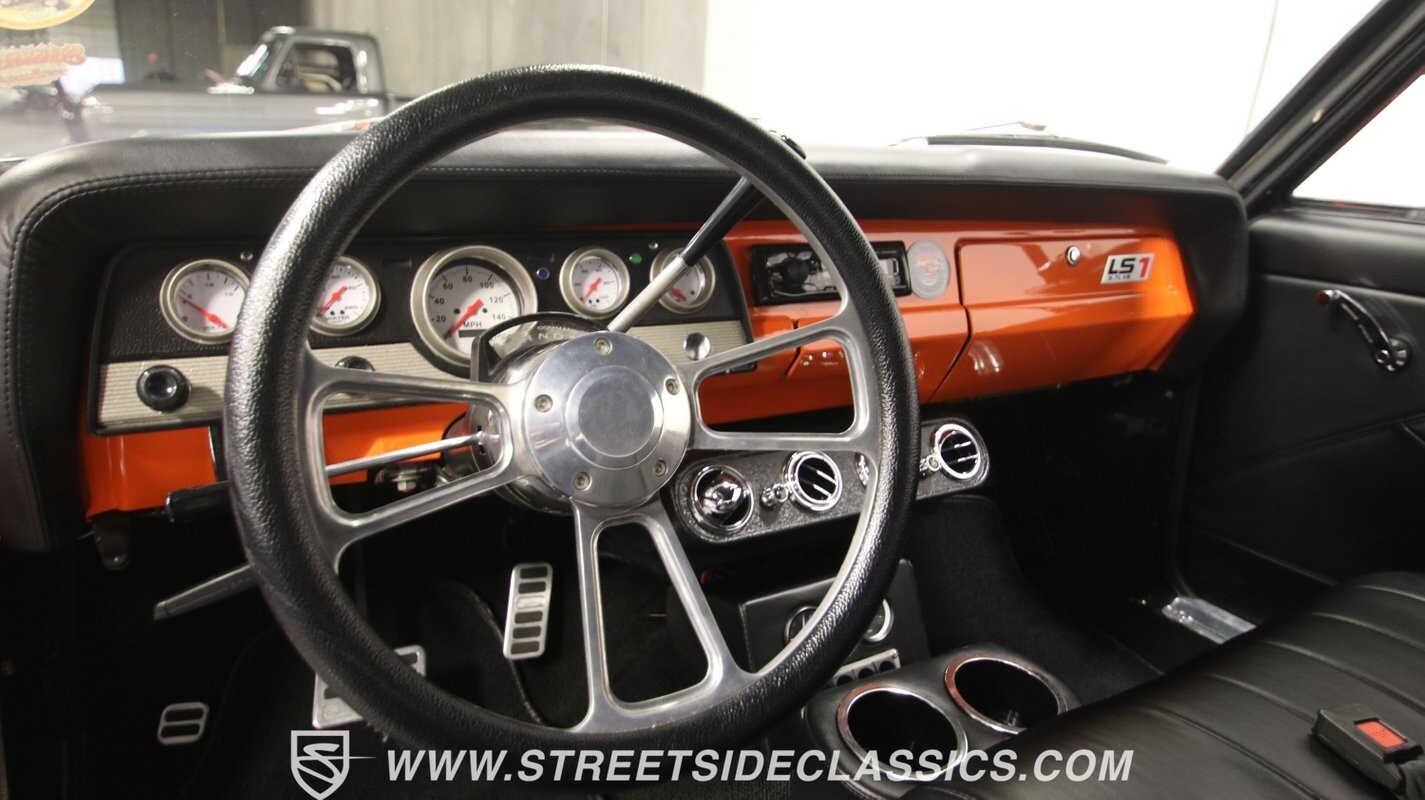 The interior is thoughtfully done where the color theme switches from the exterior to now give you plenty of black with just the right touches of bold orange. We love how the seats give you the classic split bench look but now it's deluxe custom upholstery done in supple leather. Plush carpeting, custom door panels, a smooth dash, and a custom foam headliner are all about making sure you remember a restomod means adding comfort. There's plenty of added luxury that also comes from upgrades like the cold-blowing air conditioning, cup holders, and an AM/FM stereo with USB and Bluetooth. There's even a custom consul with toggle switches for the air ride controls. Plus the sports steering wheel, billet pedals, and upgraded gauges signal that you'll love the driving experience.