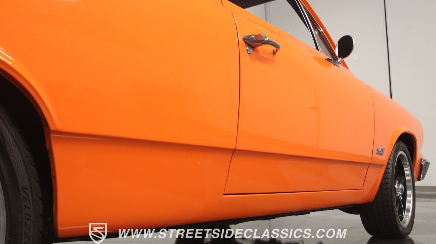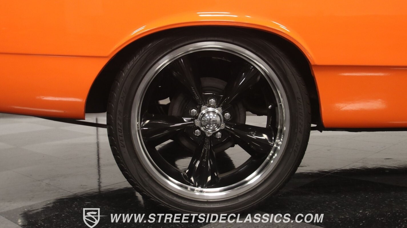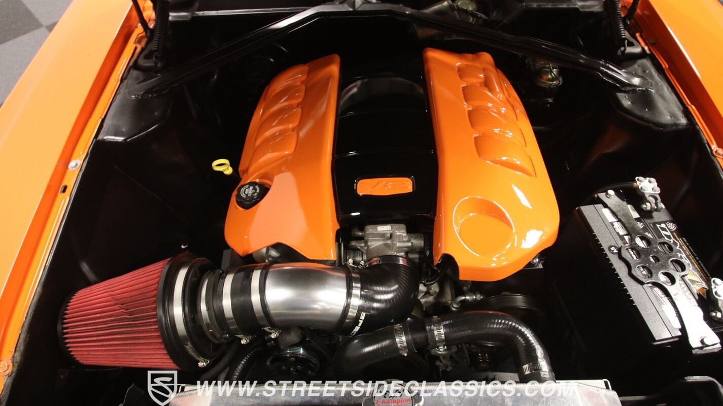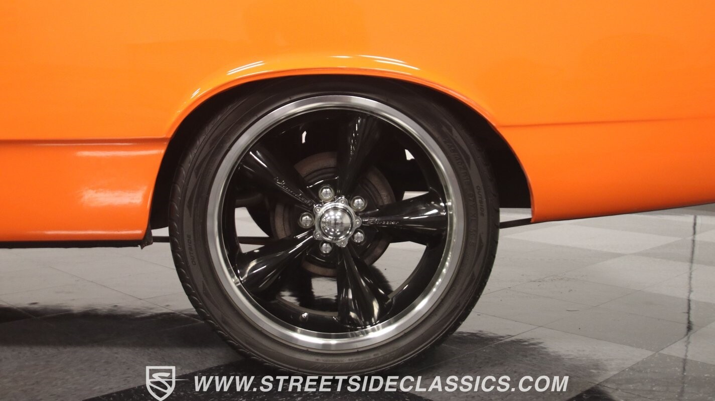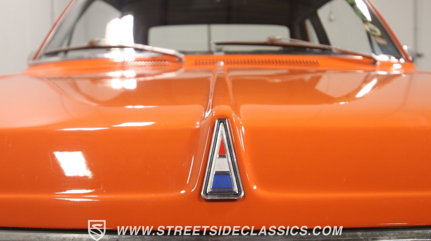 We love a good AMC because they represent a cool classic American. And since their production figures were lower than The Big Three, that makes for plenty of rare distinction on the classic car scene. But the distinction of this one goes much further than production numbers. It announces it's unique with the right well-placed upgrades. The orange paint has a vibrant style that gives this an aggressive impression. But there's also a touch of premium because the hue is said to be borrowed from the BMW M3 color palette, and it has a premium gloss that shows off this AMC's crisp and classic lines. There's a coordinated dark side contrast with the dark grille, blackout rear panels, and upgraded dark alloys. And speaking of the wheels they are staggered 17/18 inches front/rear for a nice stance, and that gets enhanced further because you can dial-in the height with the fully adjustable air ride suspension.
