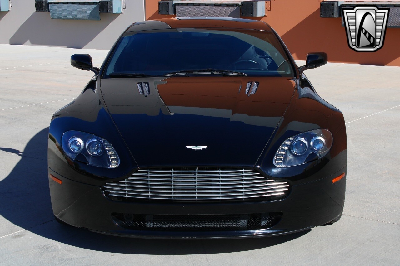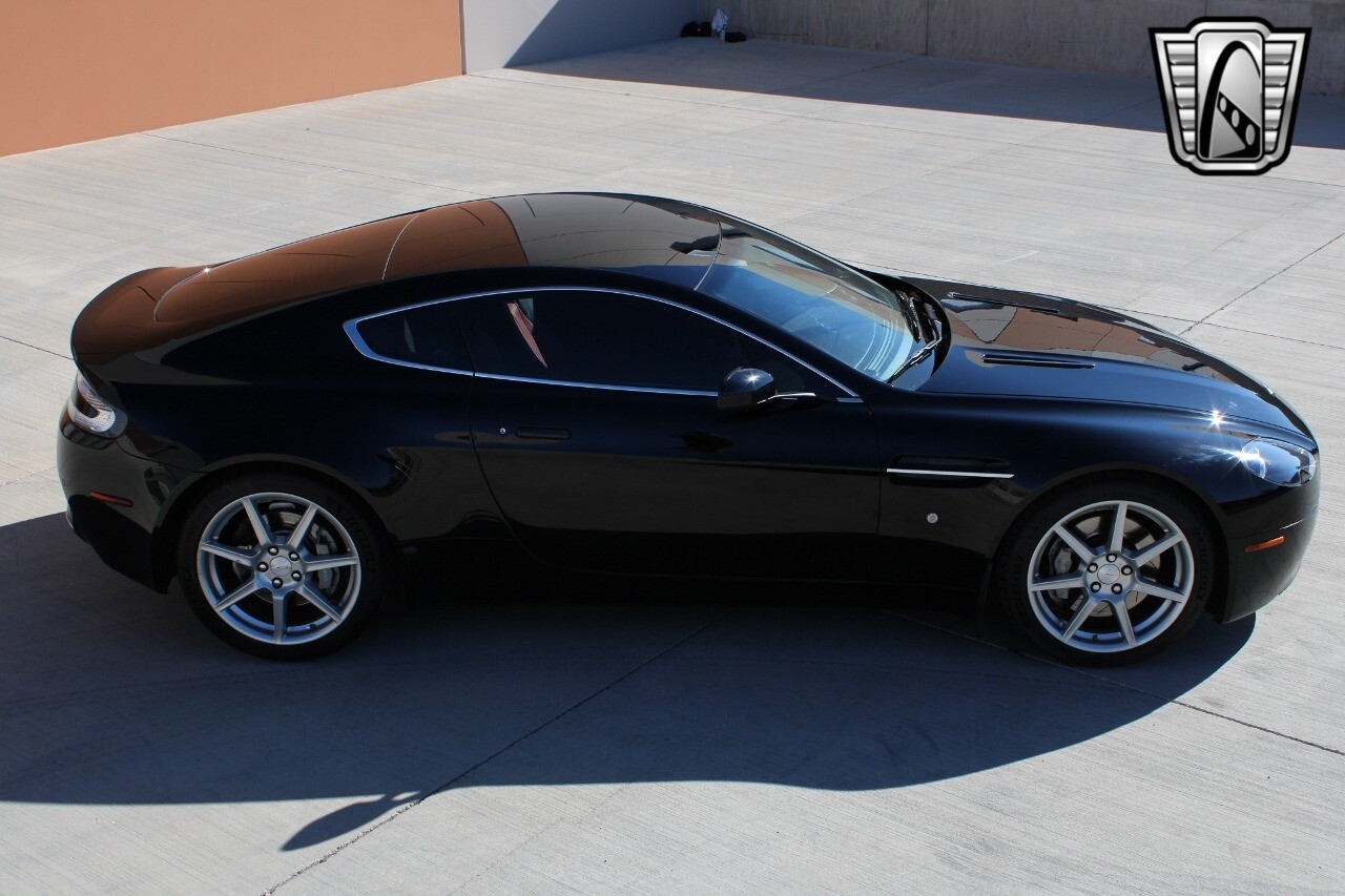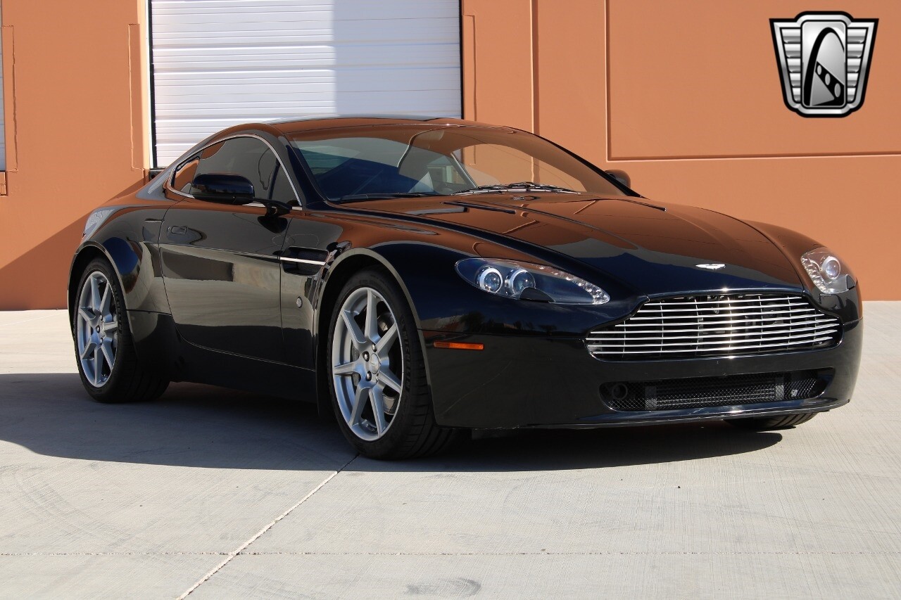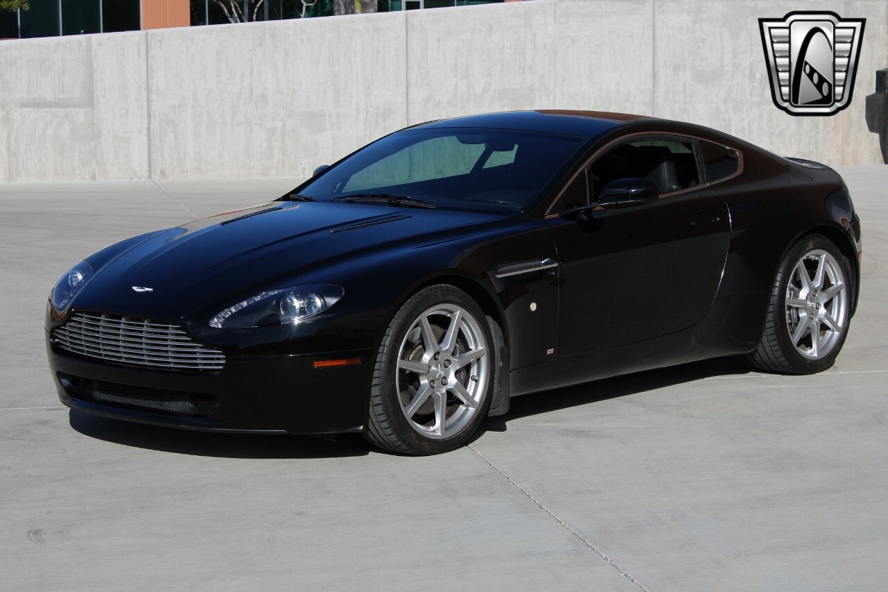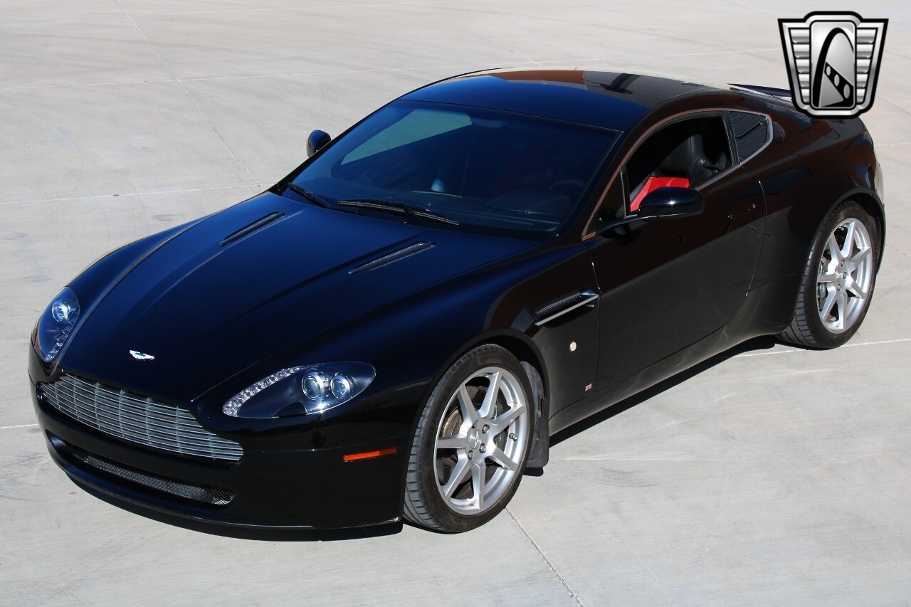 Introducing the 2008 Aston Martin Vantage, a combination of luxury and performance. This stunning vehicle is presented in a sleek black exterior, complemented by a luxurious black leather interior, exuding an air of sophistication and elegance.