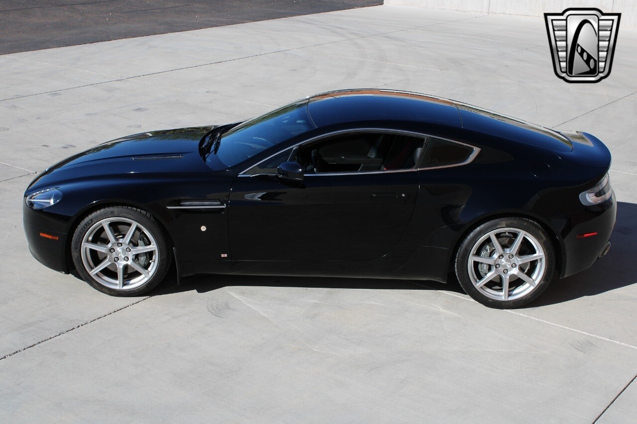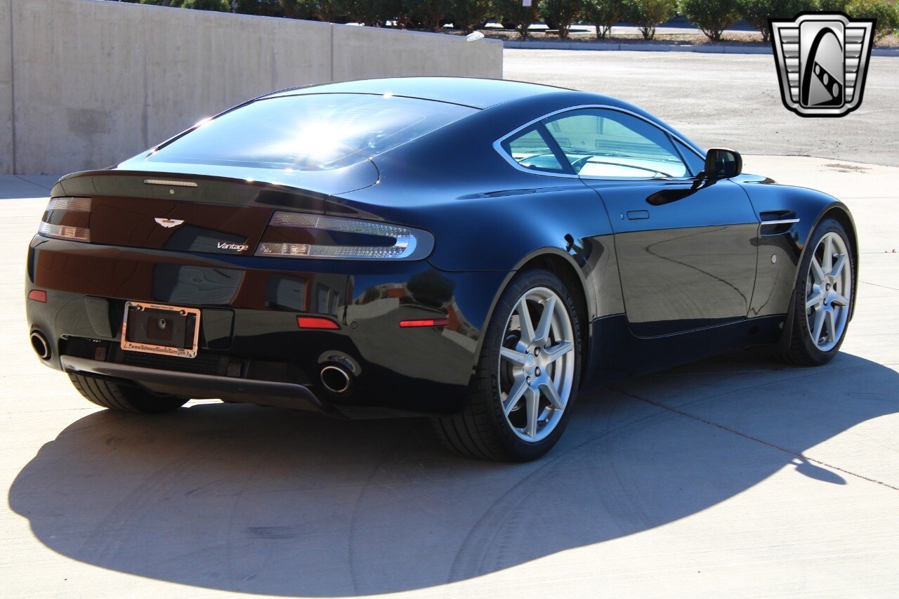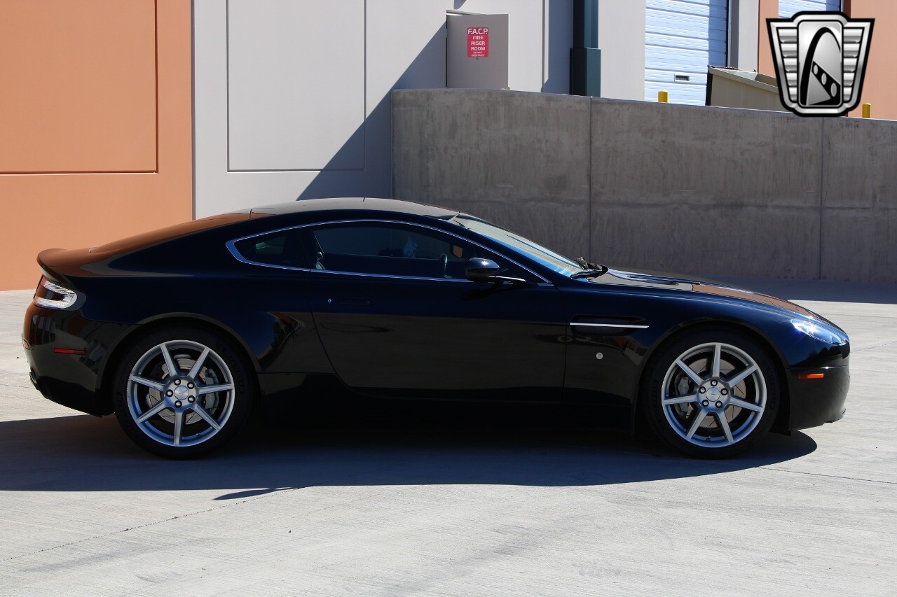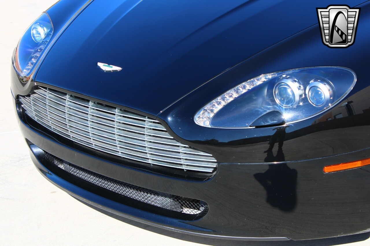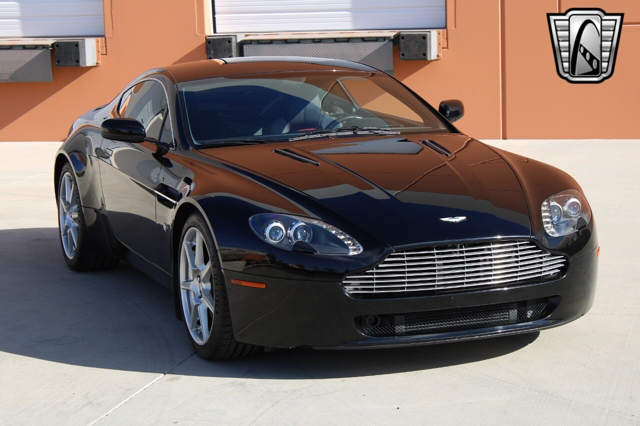 Introducing the 2008 Aston Martin Vantage, a combination of luxury and performance. This stunning vehicle is presented in a sleek black exterior, complemented by a luxurious black leather interior, exuding an air of sophistication and elegance.