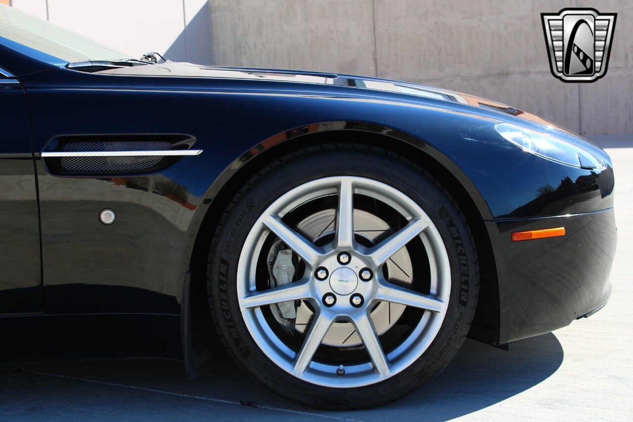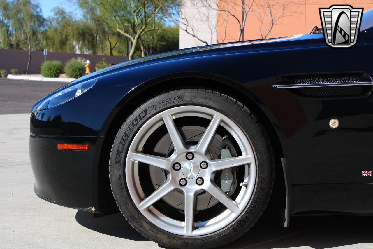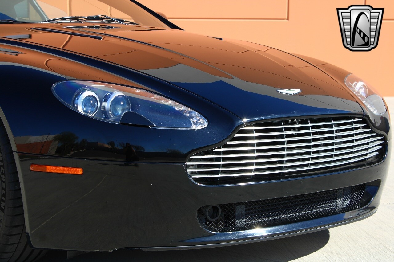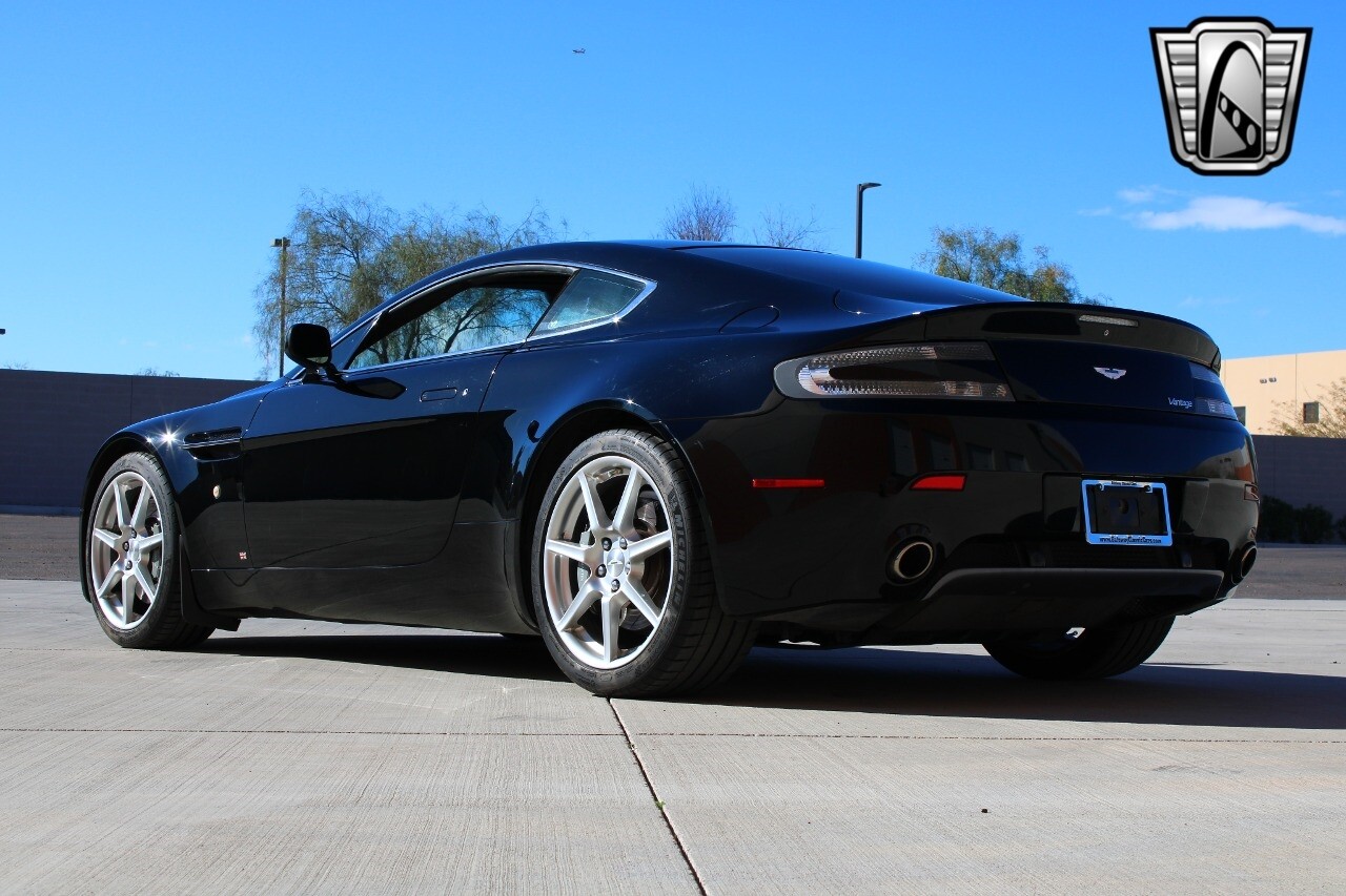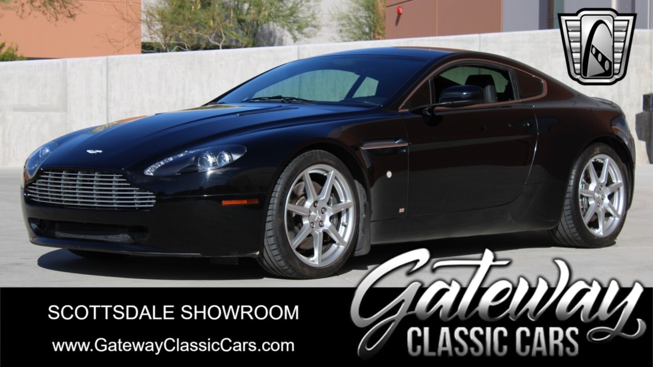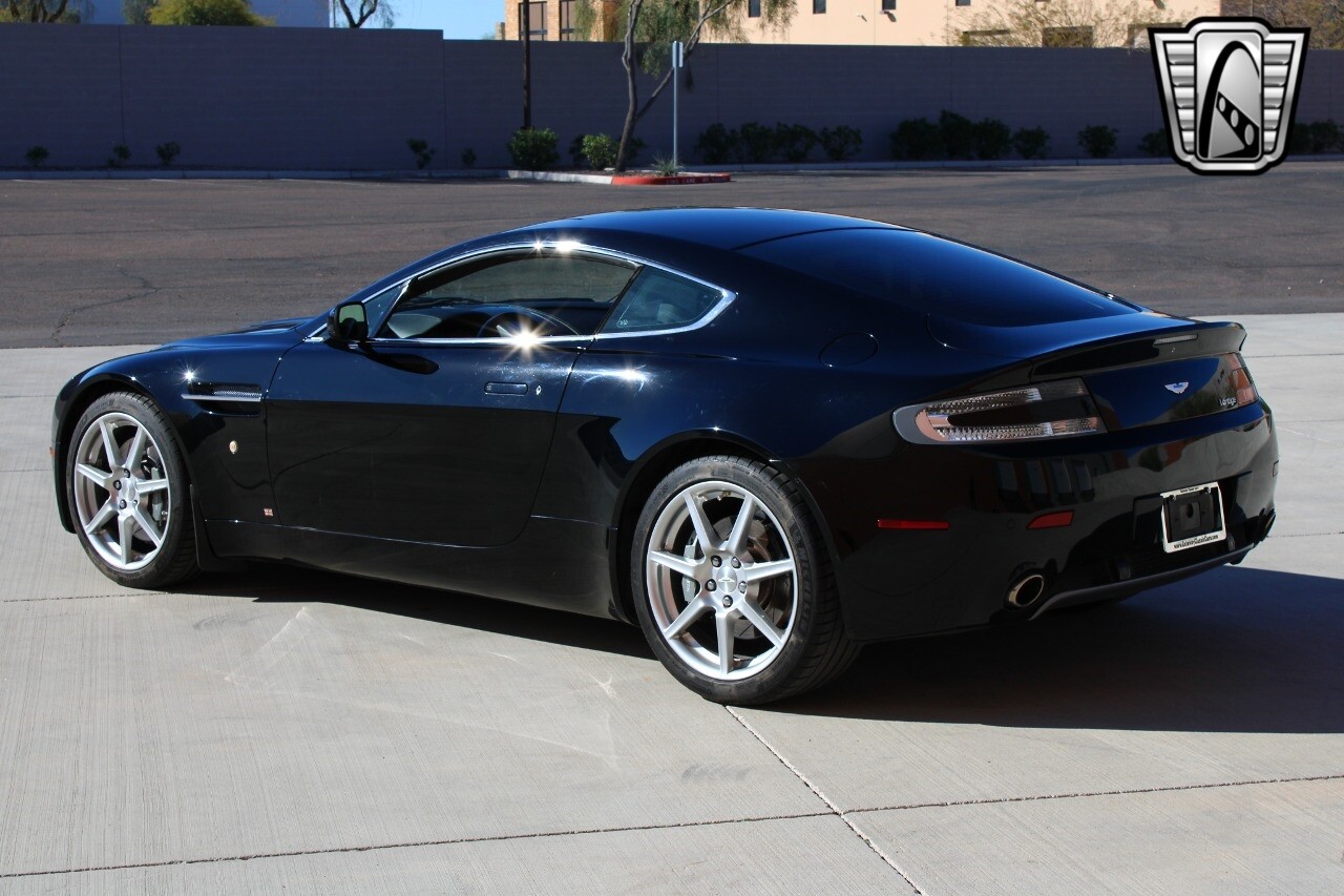 Introducing the 2008 Aston Martin Vantage, a combination of luxury and performance. This stunning vehicle is presented in a sleek black exterior, complemented by a luxurious black leather interior, exuding an air of sophistication and elegance.