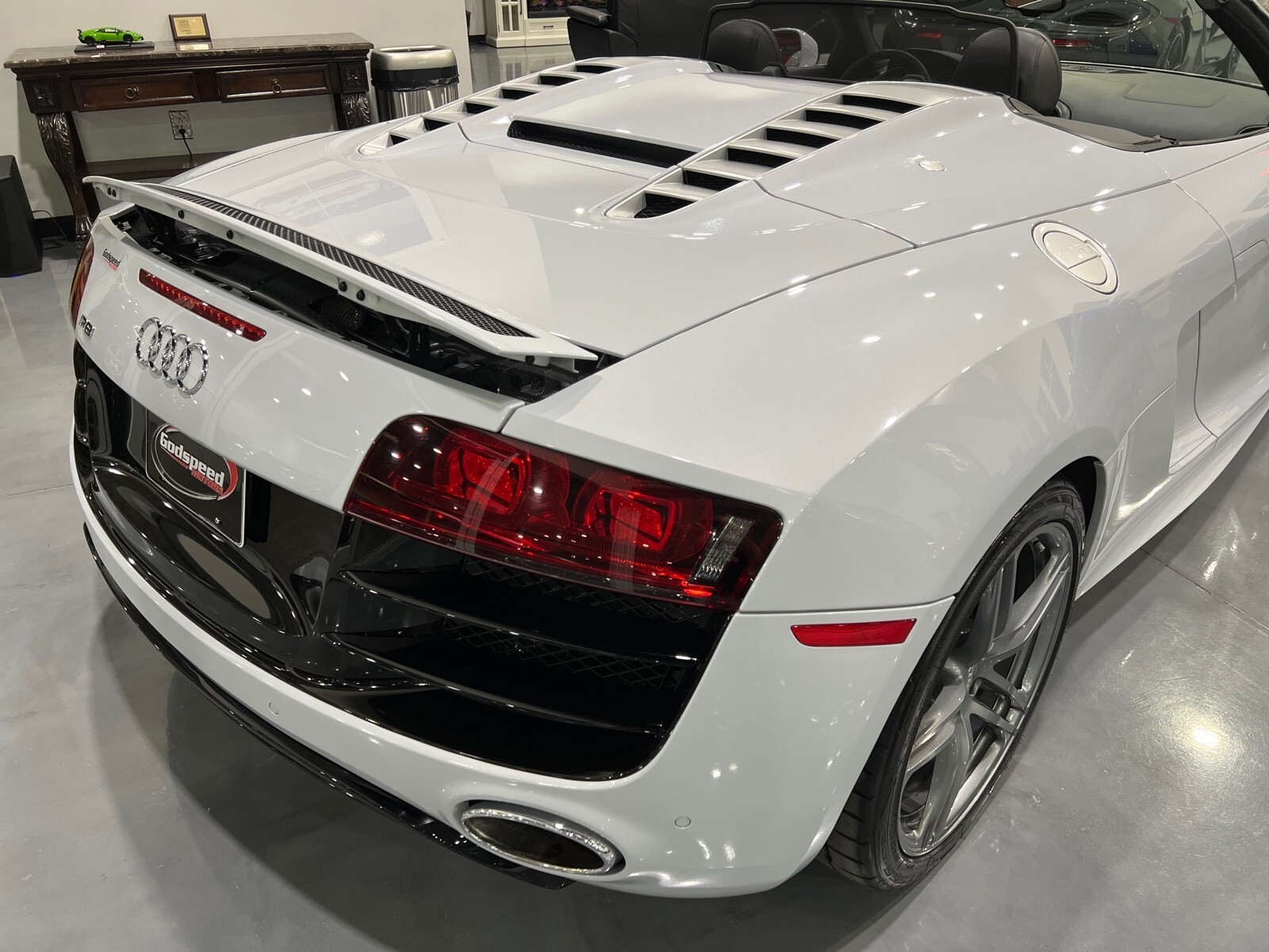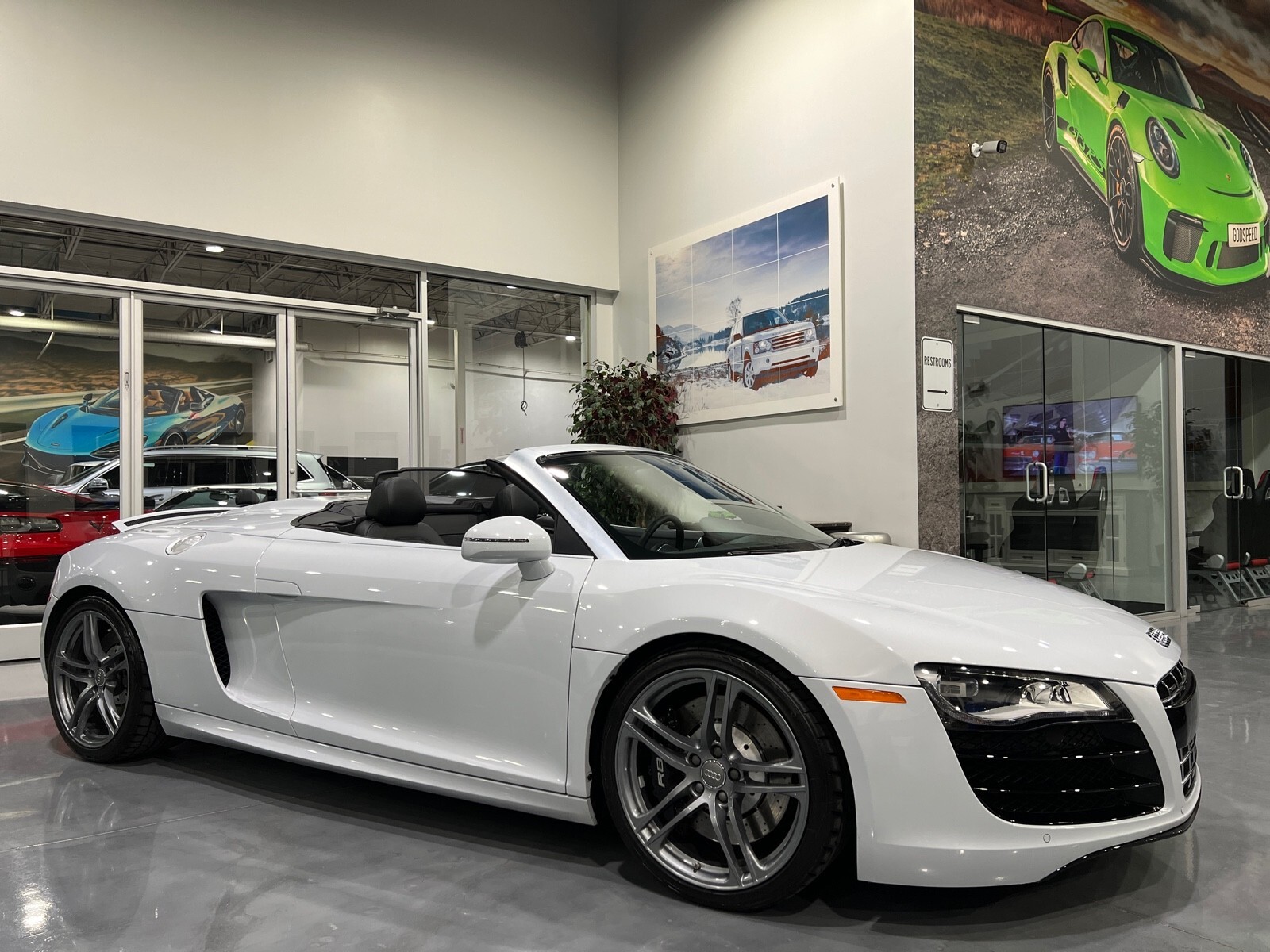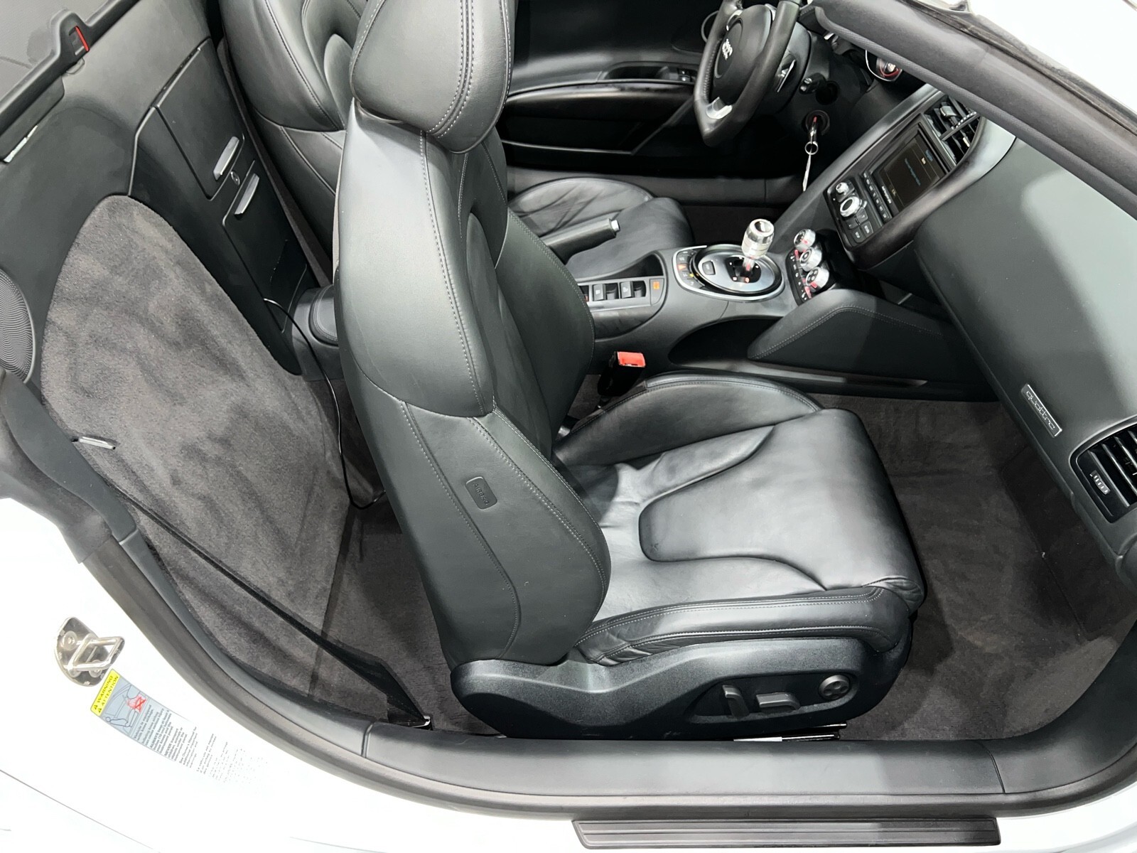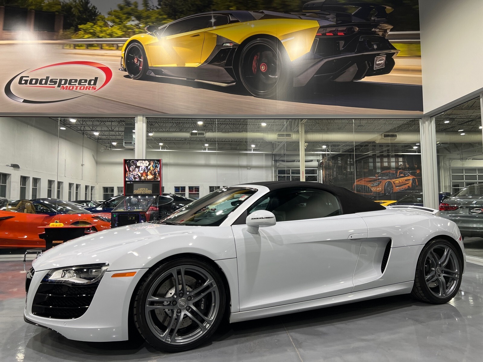 5.2L V10 rated at 525 horsepower! Power-operated convertible top, quattro all-wheel drive, Bang & Olfusen audio, SiriusXM capable, Audi Navigation Plus, Bluetooth, heated seats, rearview camera and much more! $174,550 MSRP when new! Since its debut in 2006, the Audi R8 has forged its position among the ranks of Europe's best sportscars. In 2008, Audi released the Spyder version featuring a convertible top and the desirable 5.2L V10. Godspeed Motors is pleased to offer this 2011 Audi R8 Spyder! The open air experience gives the driver and passenger a front row experience to the symphony coming from the rear tailpipes. Screaming all the way up to 8,000 rpm and beyond, the Lamborghini-built engine is rated at 525 horsepower and is capable of propeling this drop-top to 60 mph in less than 4 seconds! That top needs only 19 seconds to go from a fully-closed cabin to a sunny atmosphere. Comfort and convienence was not compromised, as standard options include: quattro all-wheel drive, Bluetooth, cruise control, 10-way power heated seats, rearview camera, AM/FM/CD, and more! If you're looking for an exciting sports car that is easy to live with everyday, this Audi R8 deserves your consideration! Recent service/maintenance include: FRESH OIL CHANGE CARFAX does show a minor accident. To see more details click on the True 360 report towards the bottom of the CARFAX, or the link below view-report/betlXrWUsEtfjBgwUJPJ **Window sticker is a duplicate version, prices and options might vary** MSRP $172,800.00 INSTALLED OPTIONS [T9PA] Ibis White black soft top $0 [JN] Black, Leather Seating Surfaces $0 [PQK] 19 5 Arm Double Spoke Titanium Finish Forged Aluminum Alloy Wheels P235/35R19 front & P305/30R19 rear summer performance tires $500 [PNC] Audi Navigation System Plus W/Audi Music Interface color screen $0 Original Shipping Charge $1,250 RETAIL PRICE (ORIGINALLY NEW) $174,550.00